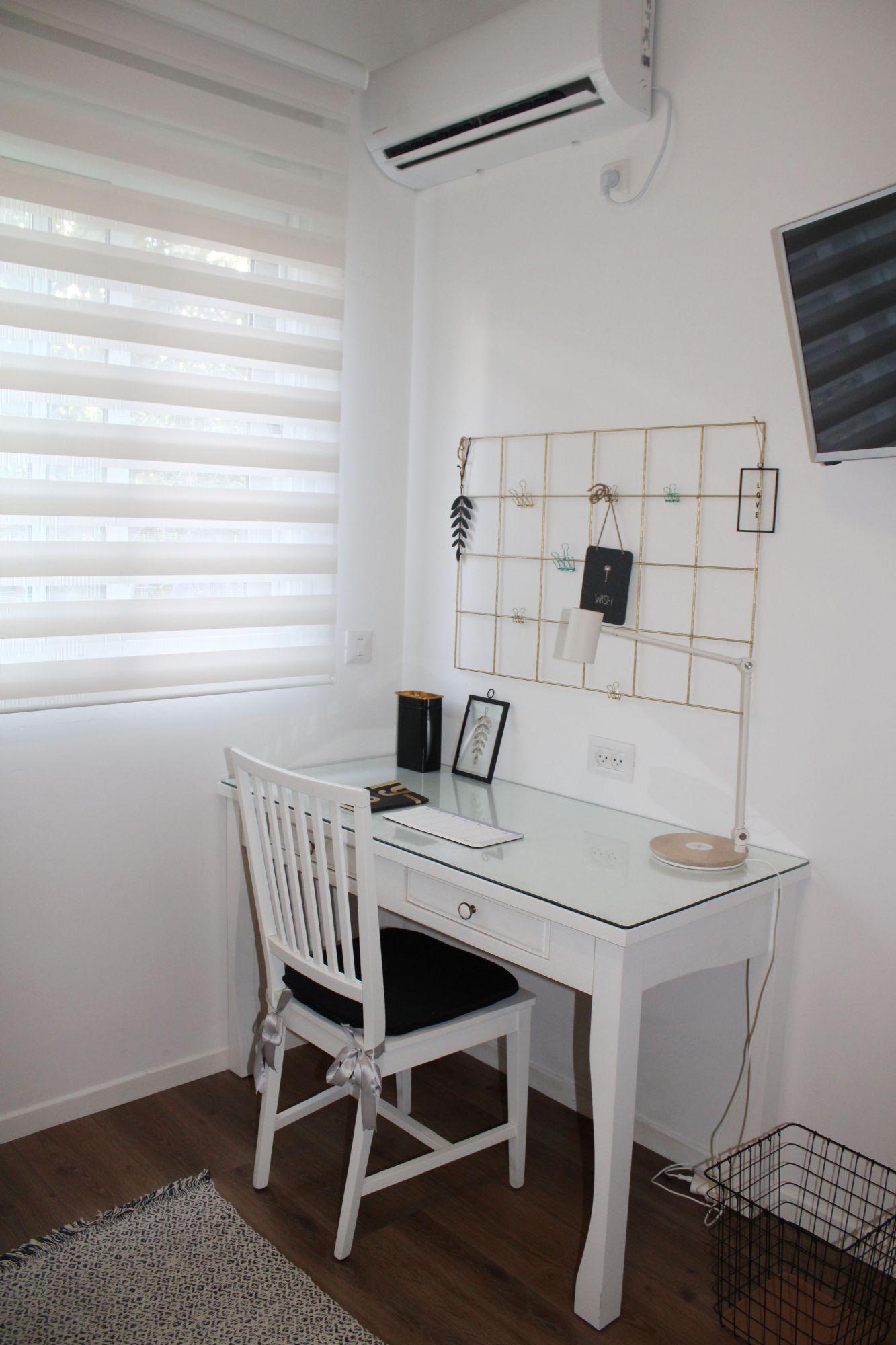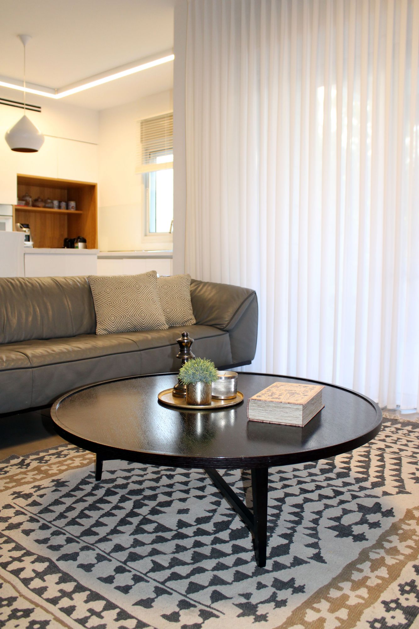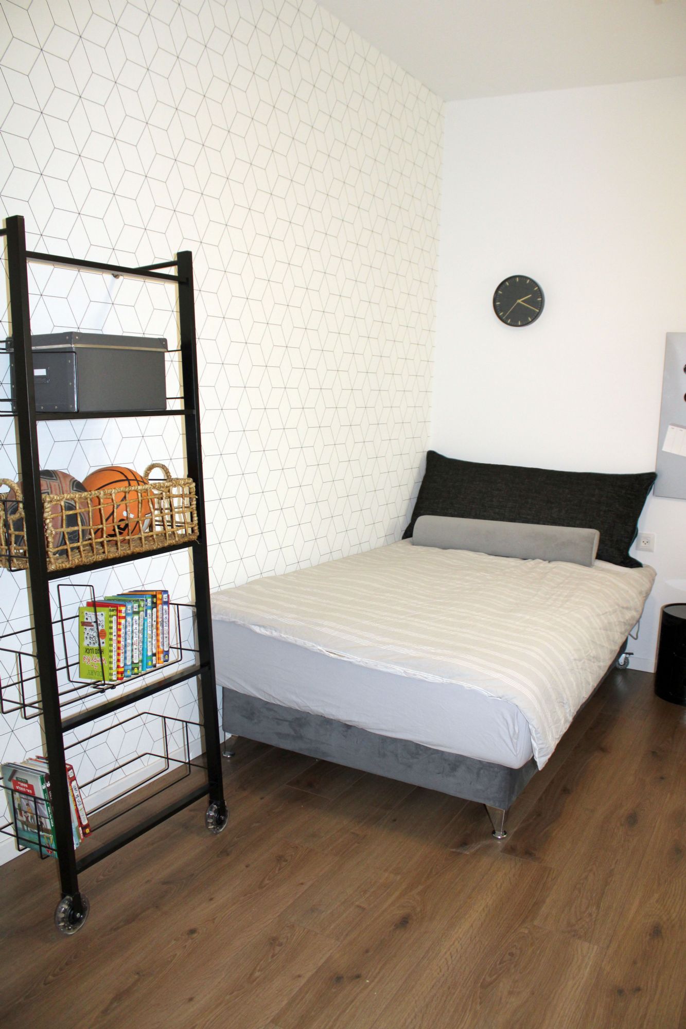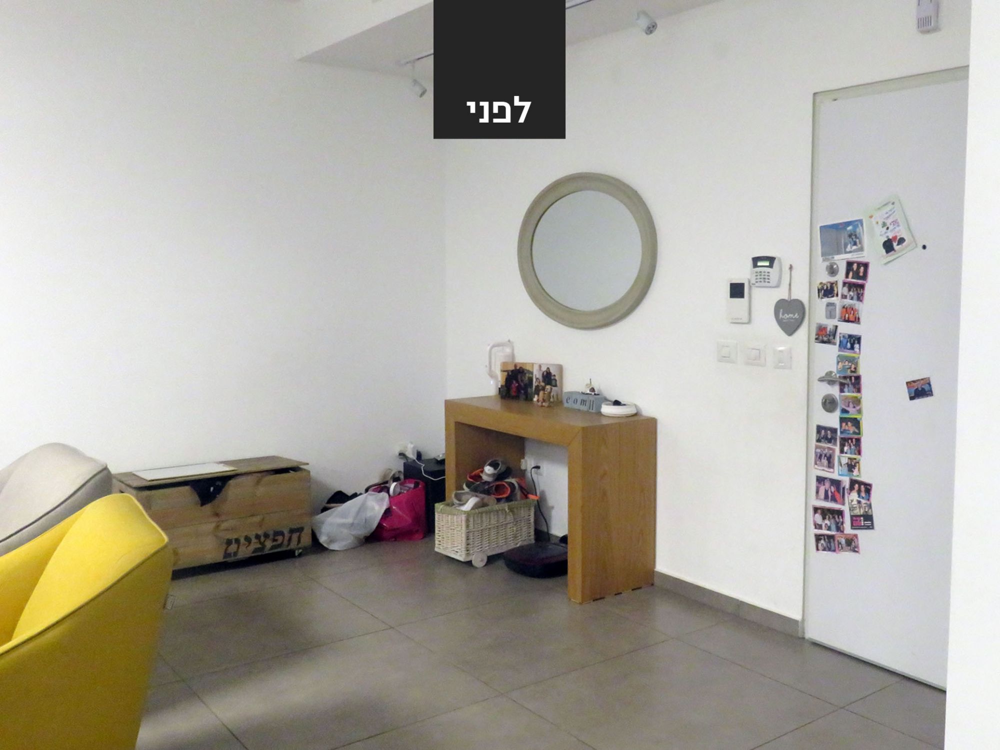רוב הרהיט הקיים נשאר והשדרוג נעשה באמצעות: טפטים, צביעת קירות, טקסטיל ואקססוריז. תוכננה ספריית ברזל בחלל המשותף המשמשת לאחסון הפריטים איתם הם נכנסים הביתה (מפתחות, תיק, דואר), וגם פרטי נוי.