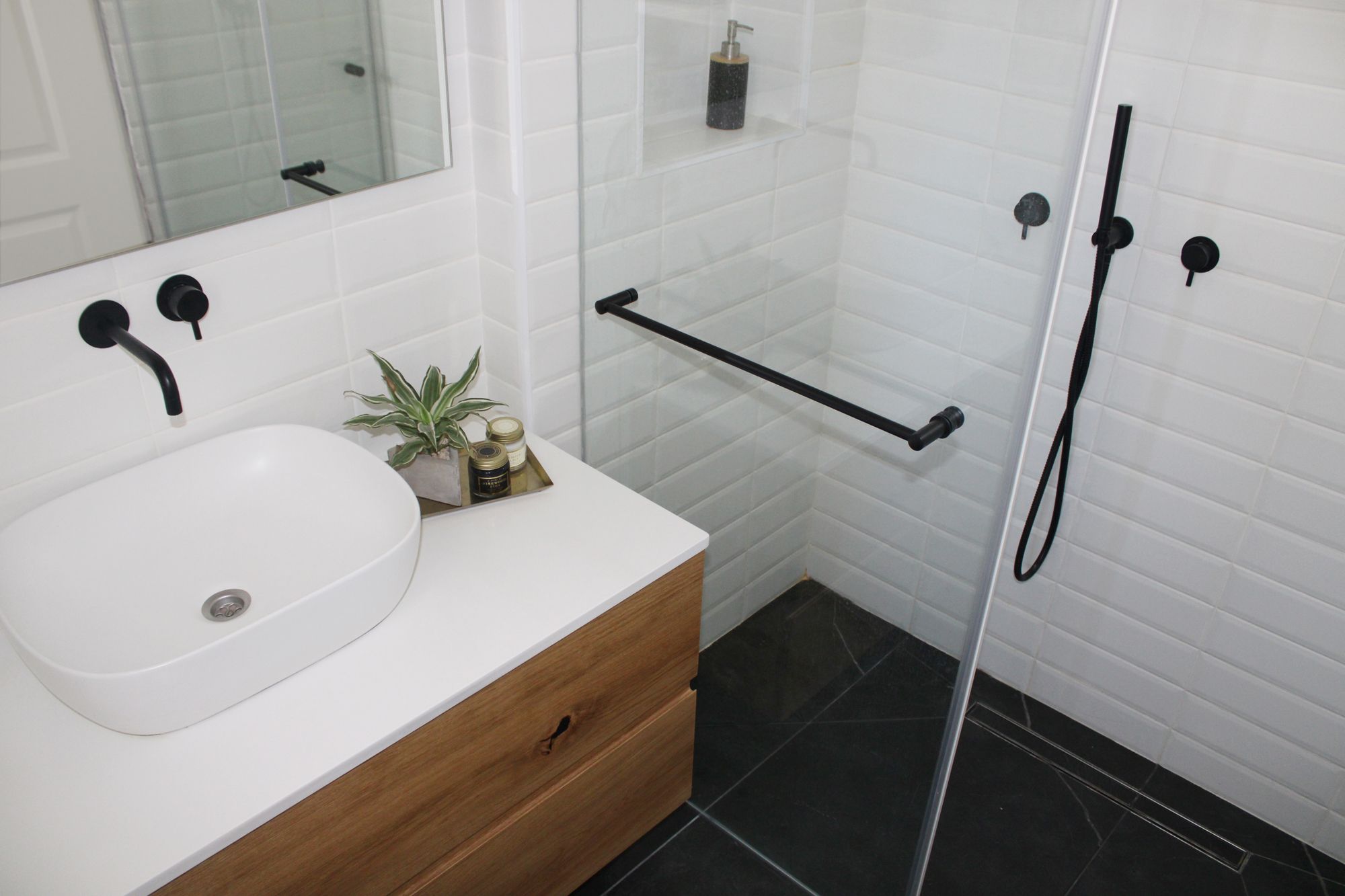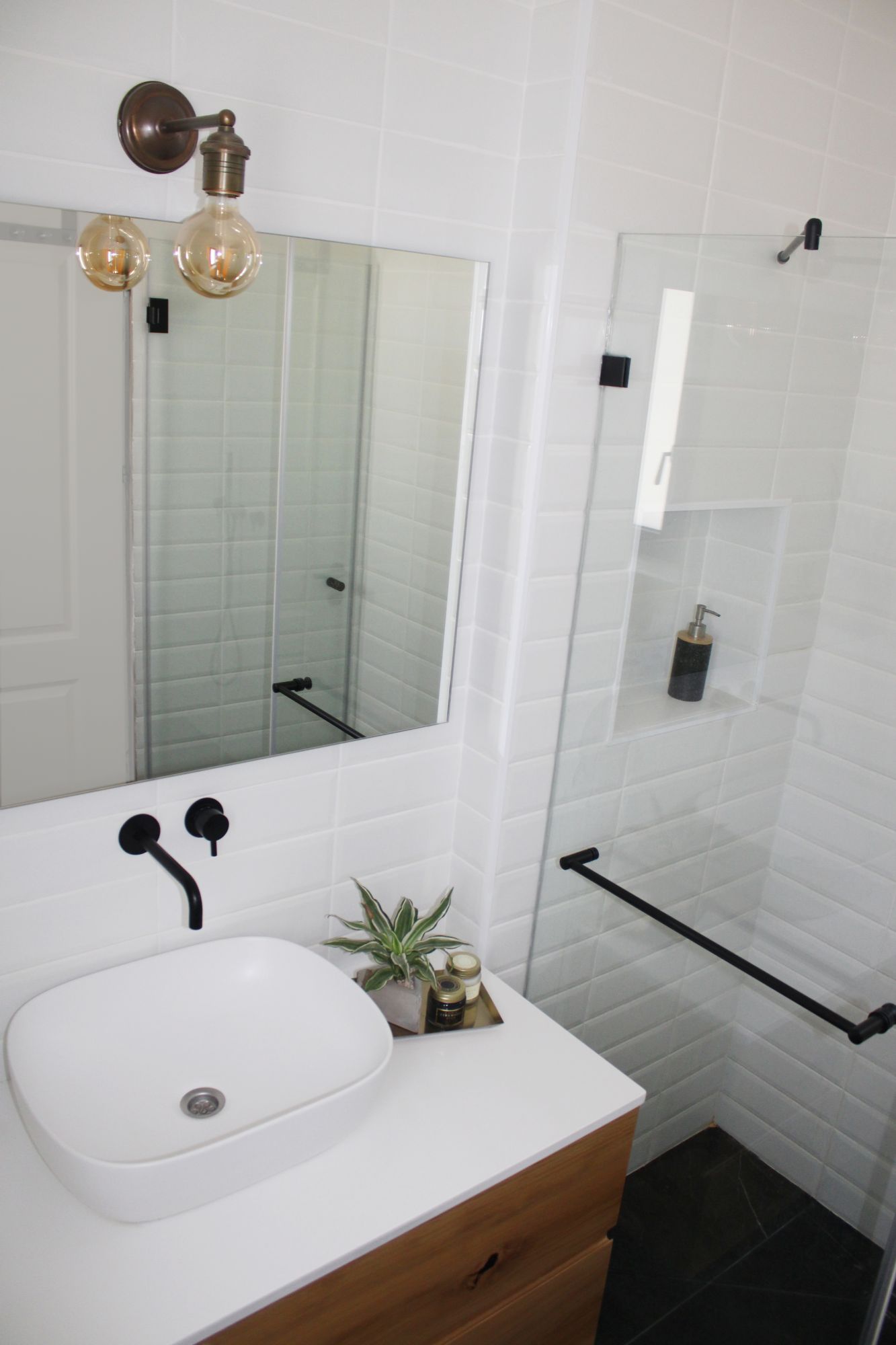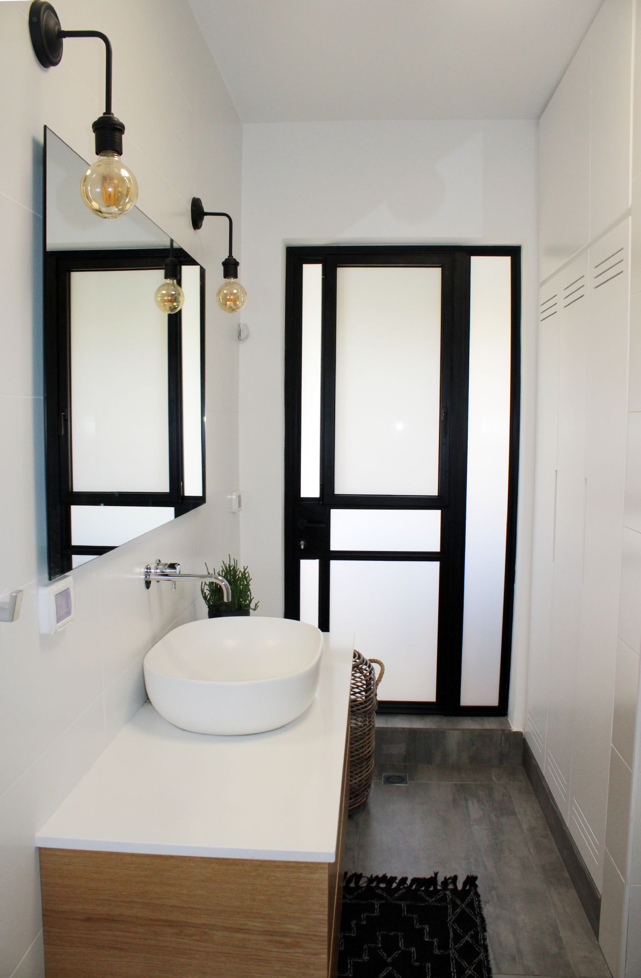חדר רחצה הורים - קטן, אך בשימוש צבעים מנוגדים לבן ושחור אנו משדרגים את החלל ונותנים תחושה של חלל גדול יותר ומראה בוטיק.