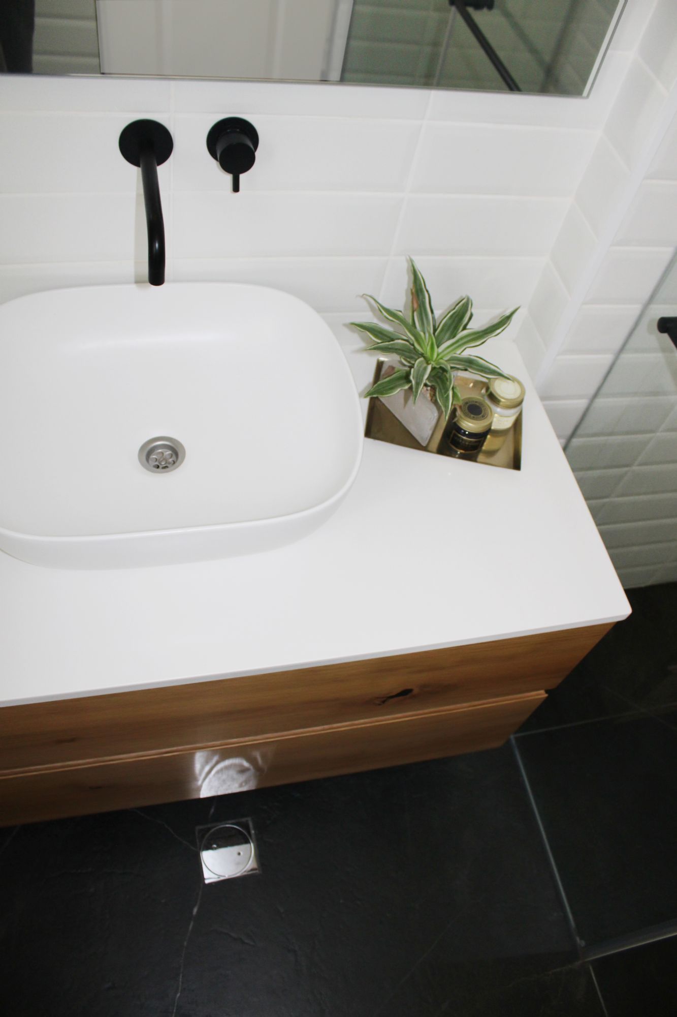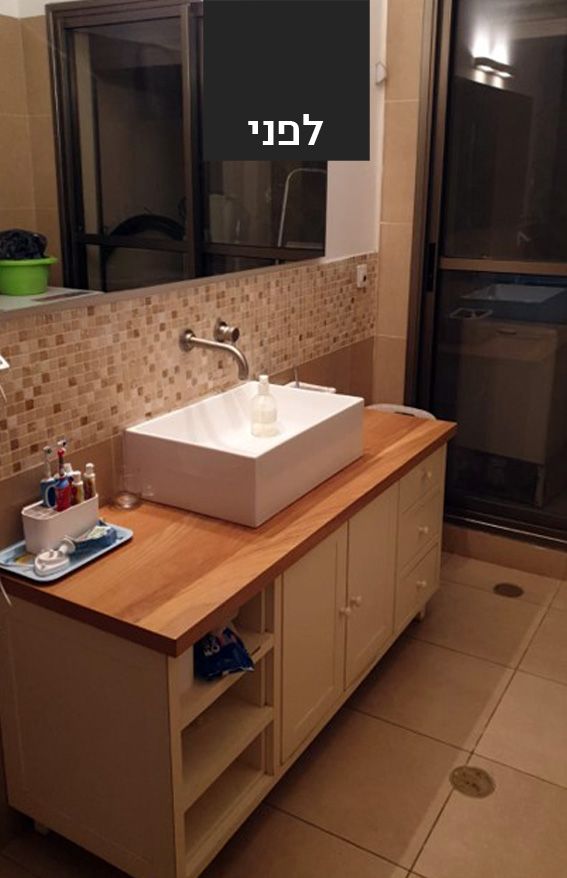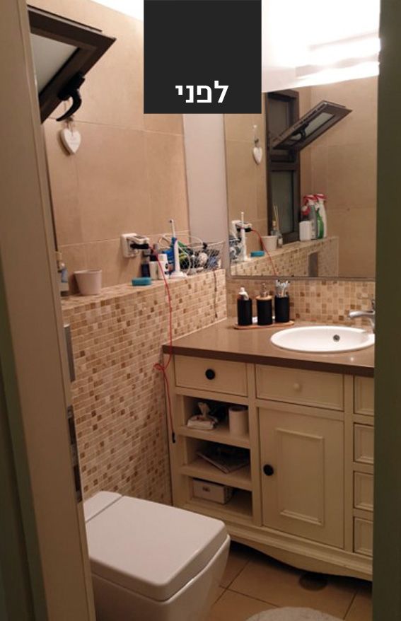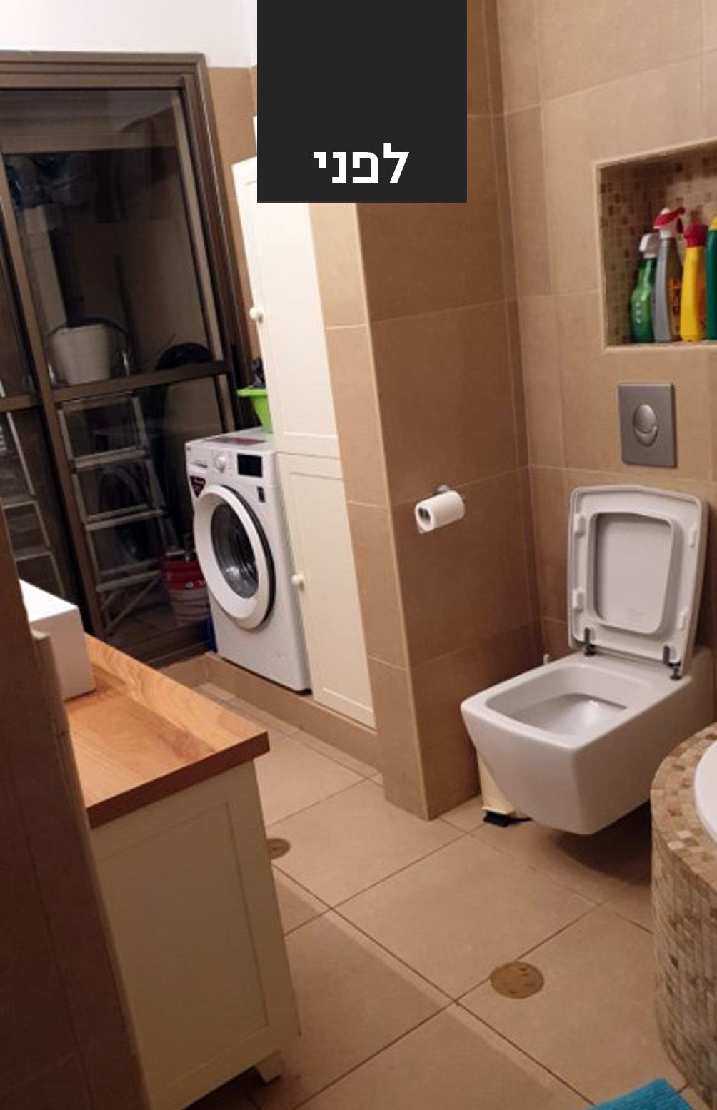 חדר רחצה ילדים - תכנון החלל מחדש: ביטול אמבטיה לטובת מקלחון, הוספת ארון שירות הכולל מכונת כביסה ומייבש ולצידם אחסון.
