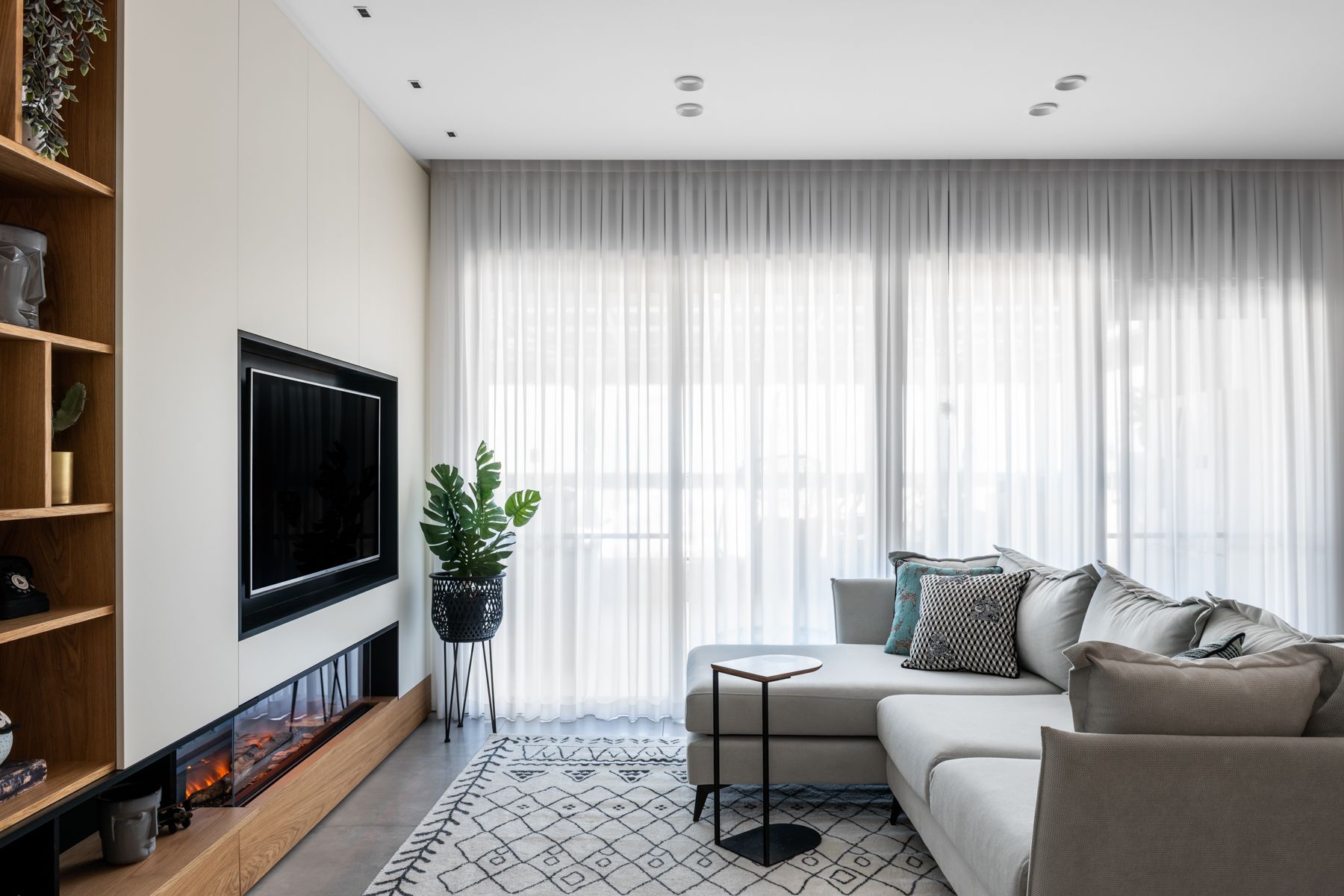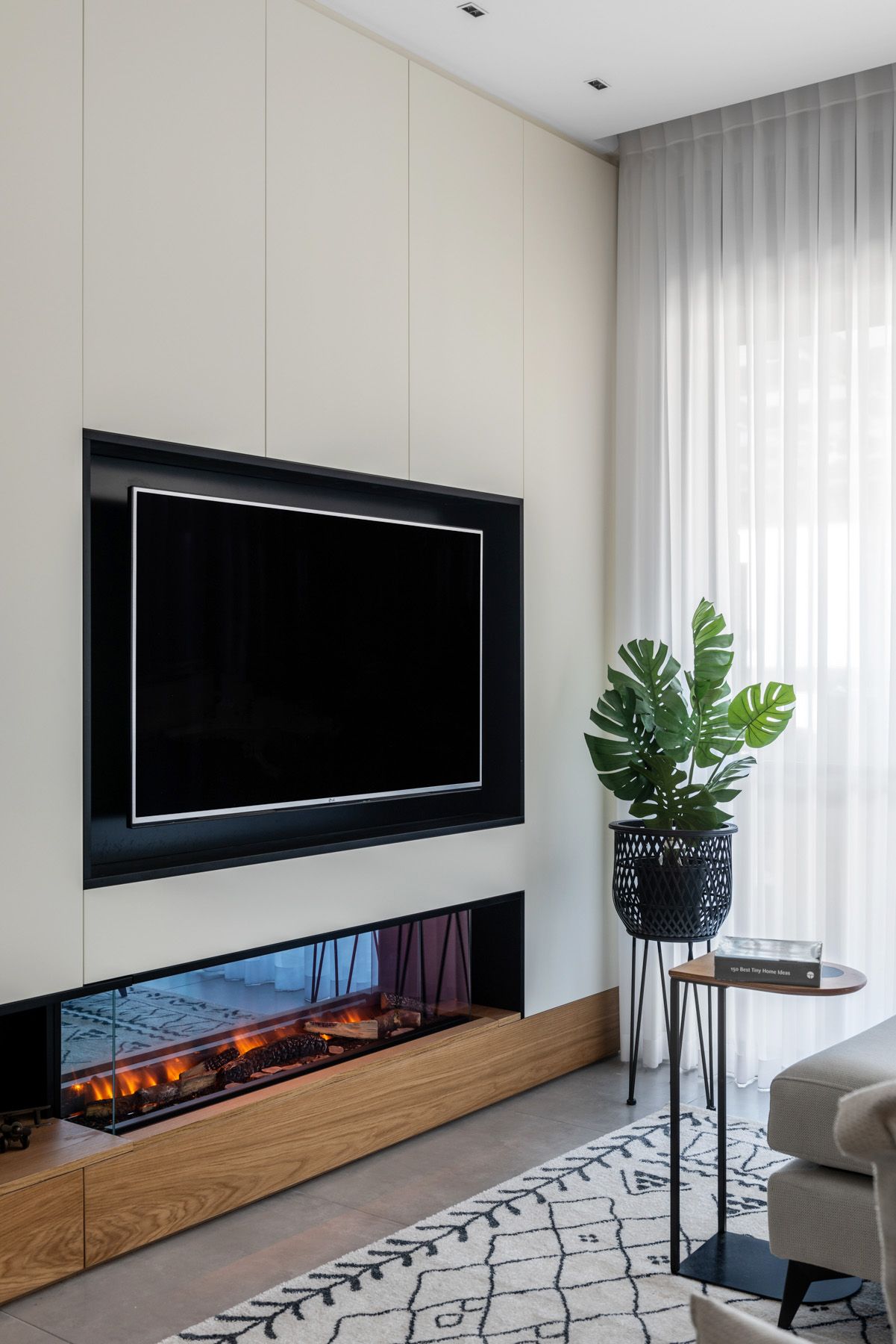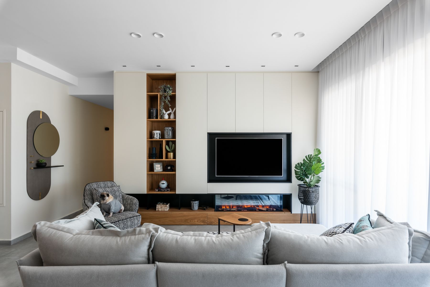 תוכנן קיר כח בנגרות המכיל אחסון פונקציונאלי, מסך לד "65, קמין חשמלי ומידוף חיצוני.