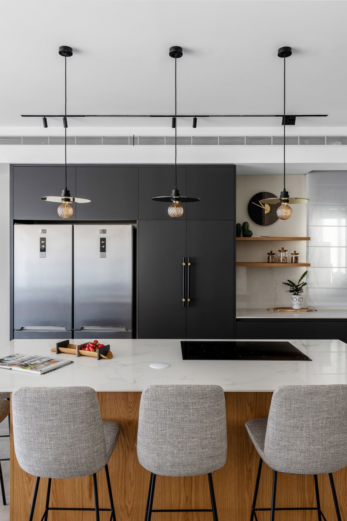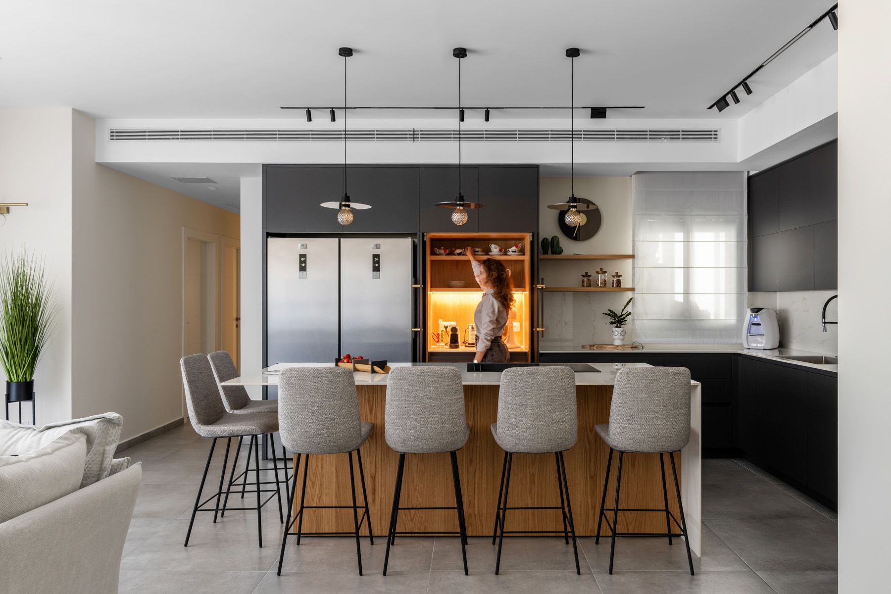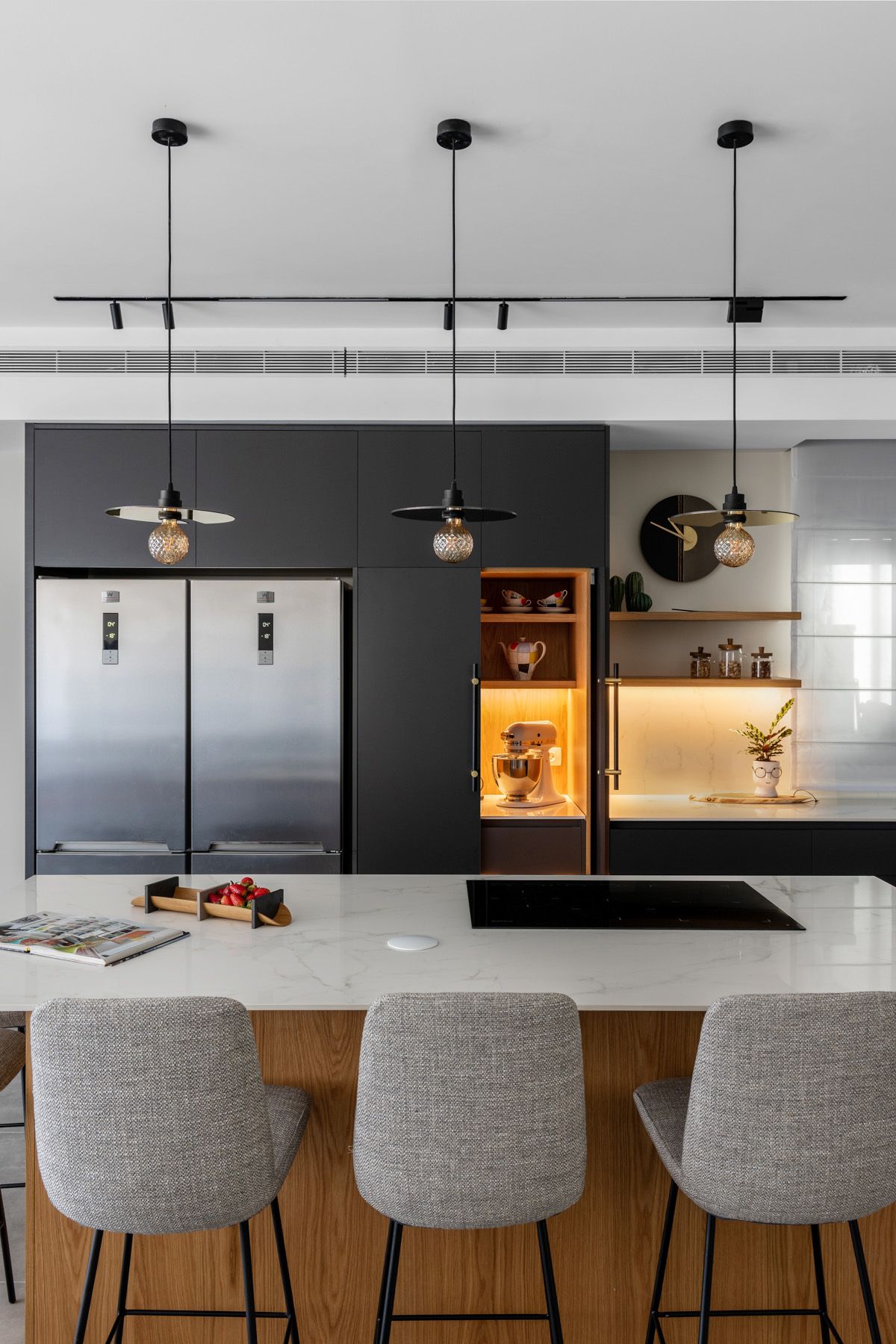 בתכנון הדירה נלקחה בחשבון דרישה למטבח רחב ממדים ומאובזר: מקרר גדול, מקרר יין, כיריים רחבות אינדוקציה, מערכת תת כיורית המשלבת חימום, קירור, טיהור מים וסילוק אשפה.