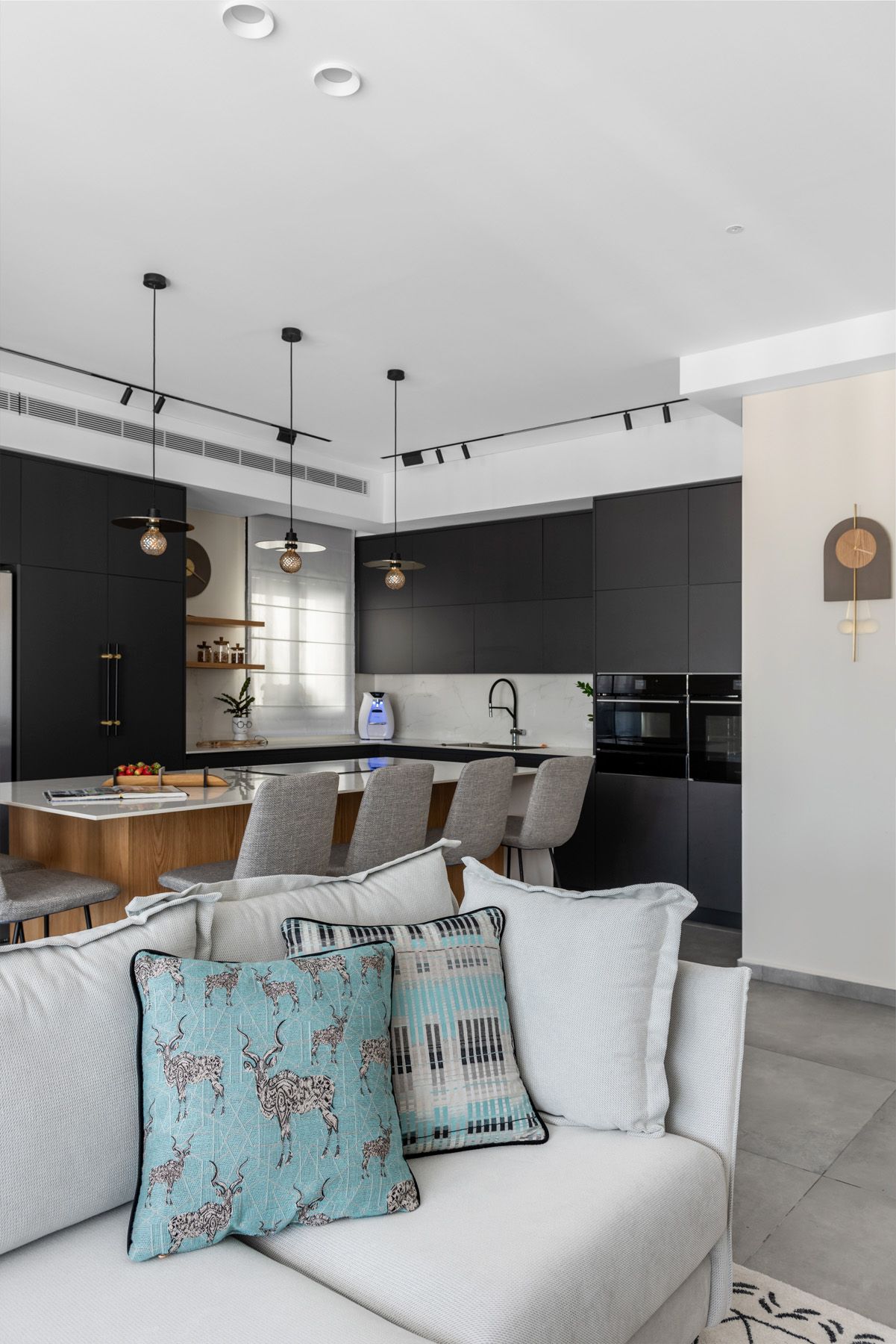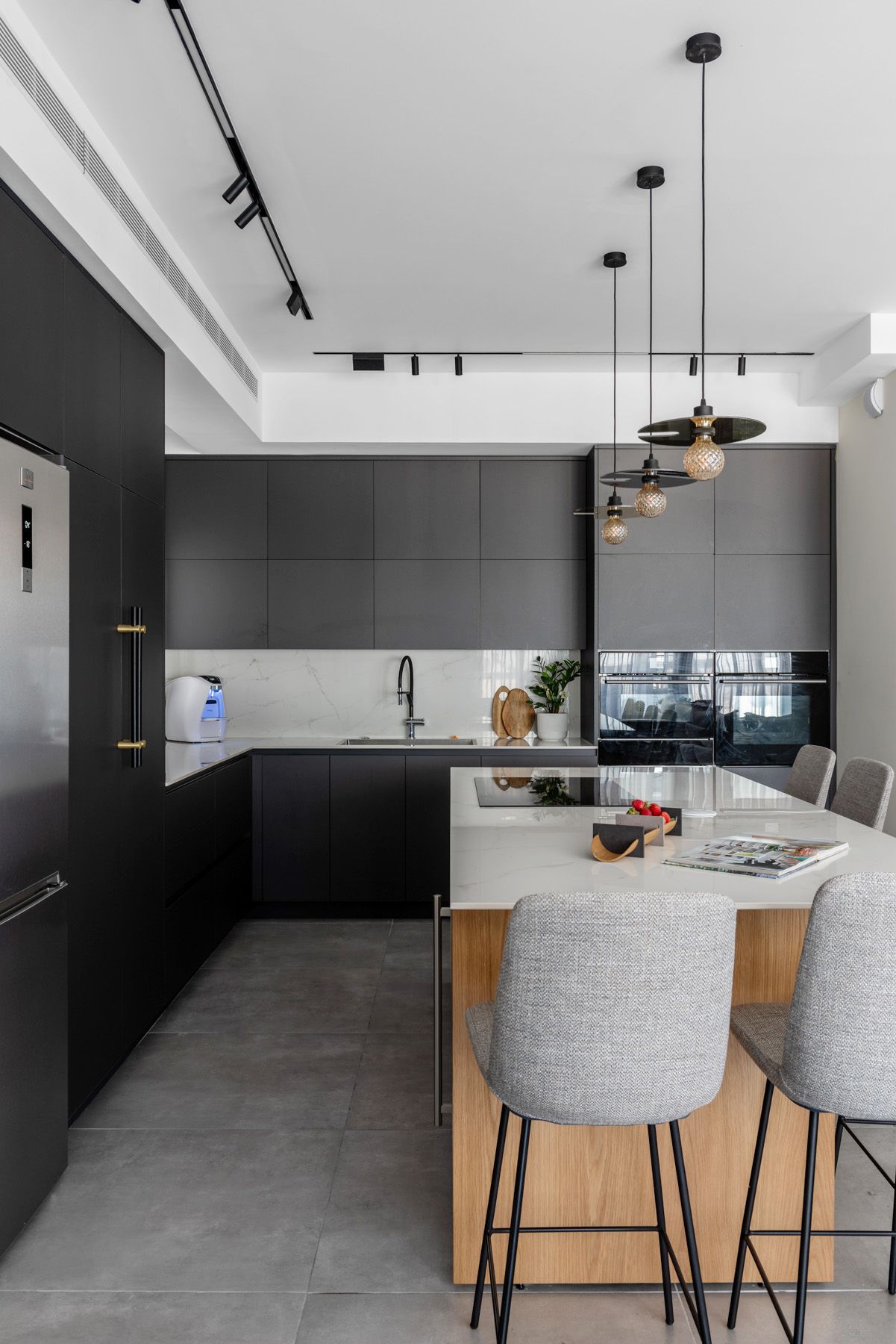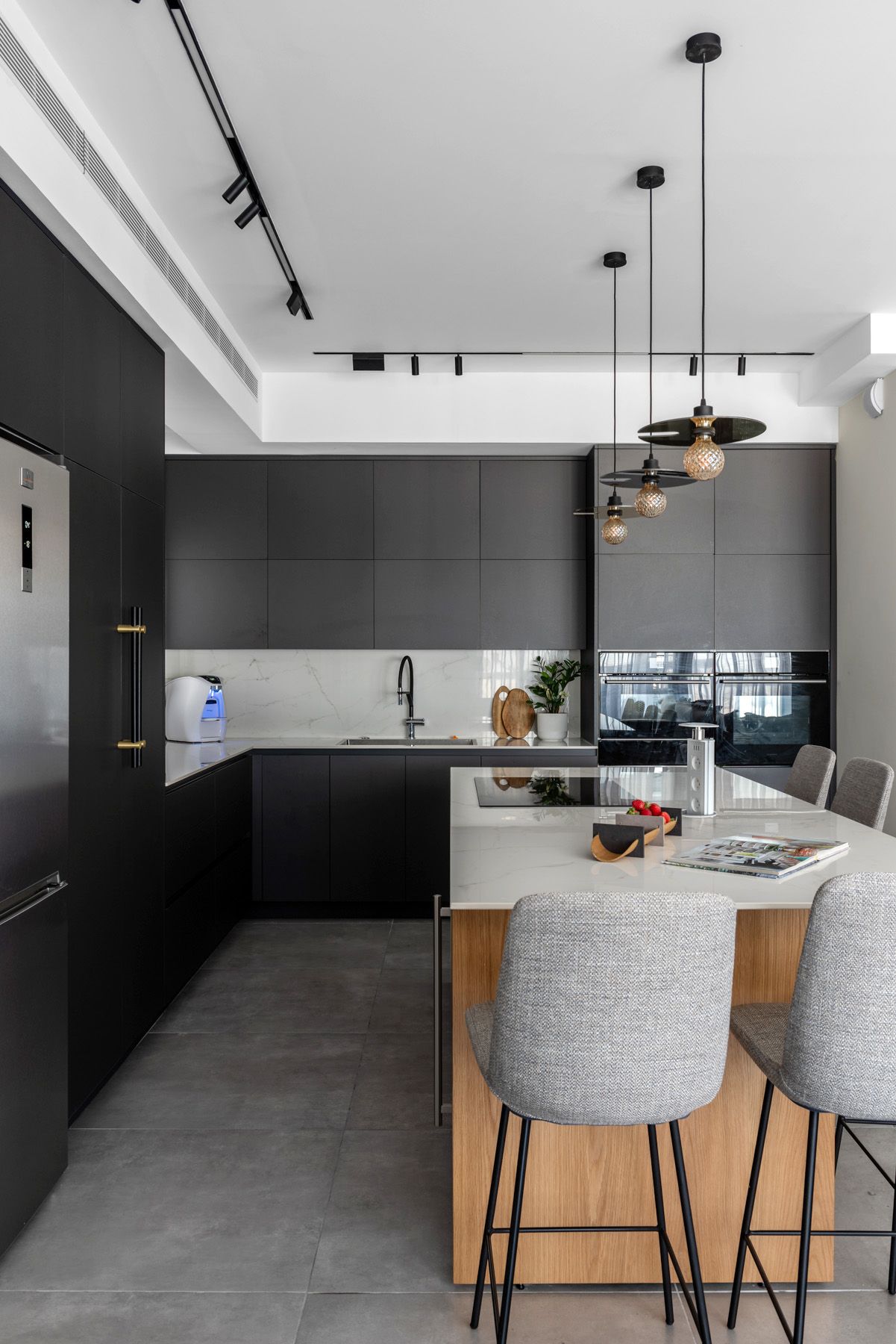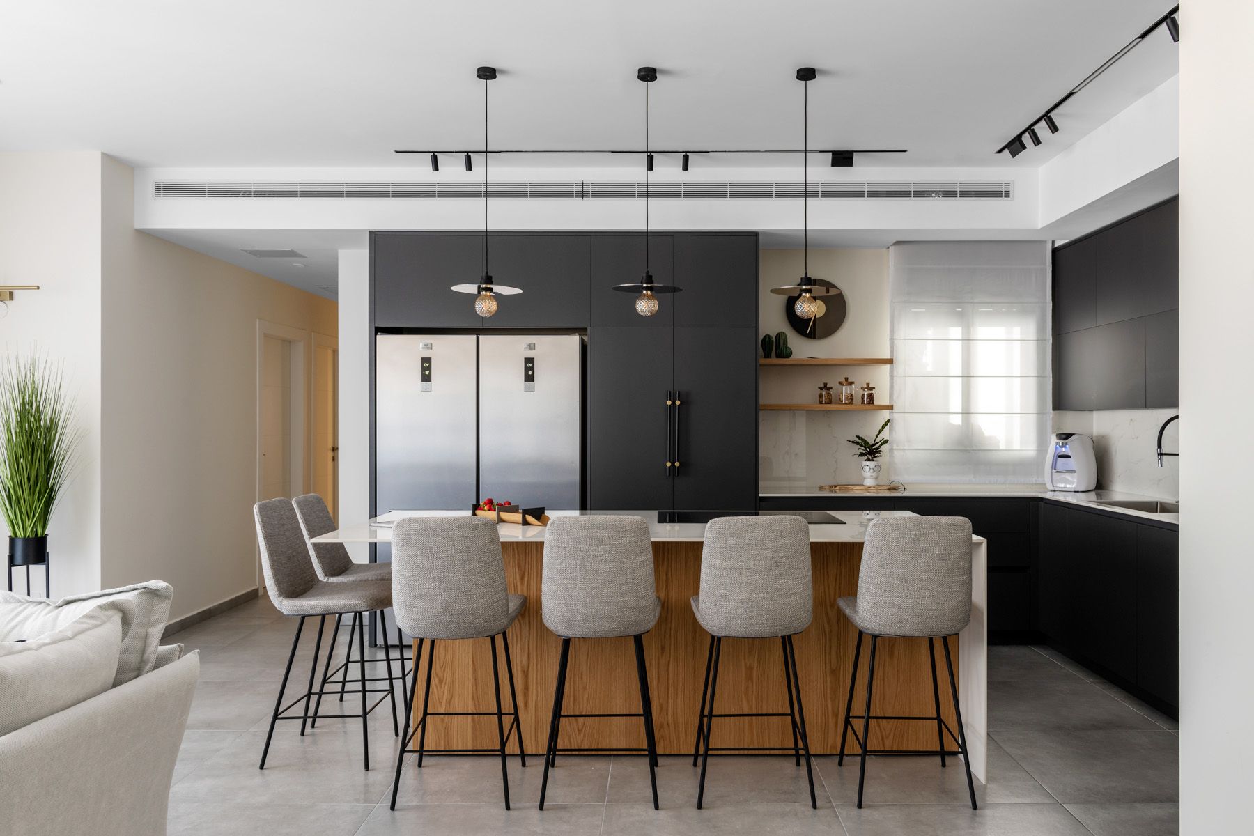 בתכנון הדירה נלקחה בחשבון דרישה למטבח רחב ממדים ומאובזר: מקרר גדול, מקרר יין, כיריים רחבות אינדוקציה, מערכת תת כיורית המשלבת חימום, קירור, טיהור מים וסילוק אשפה.