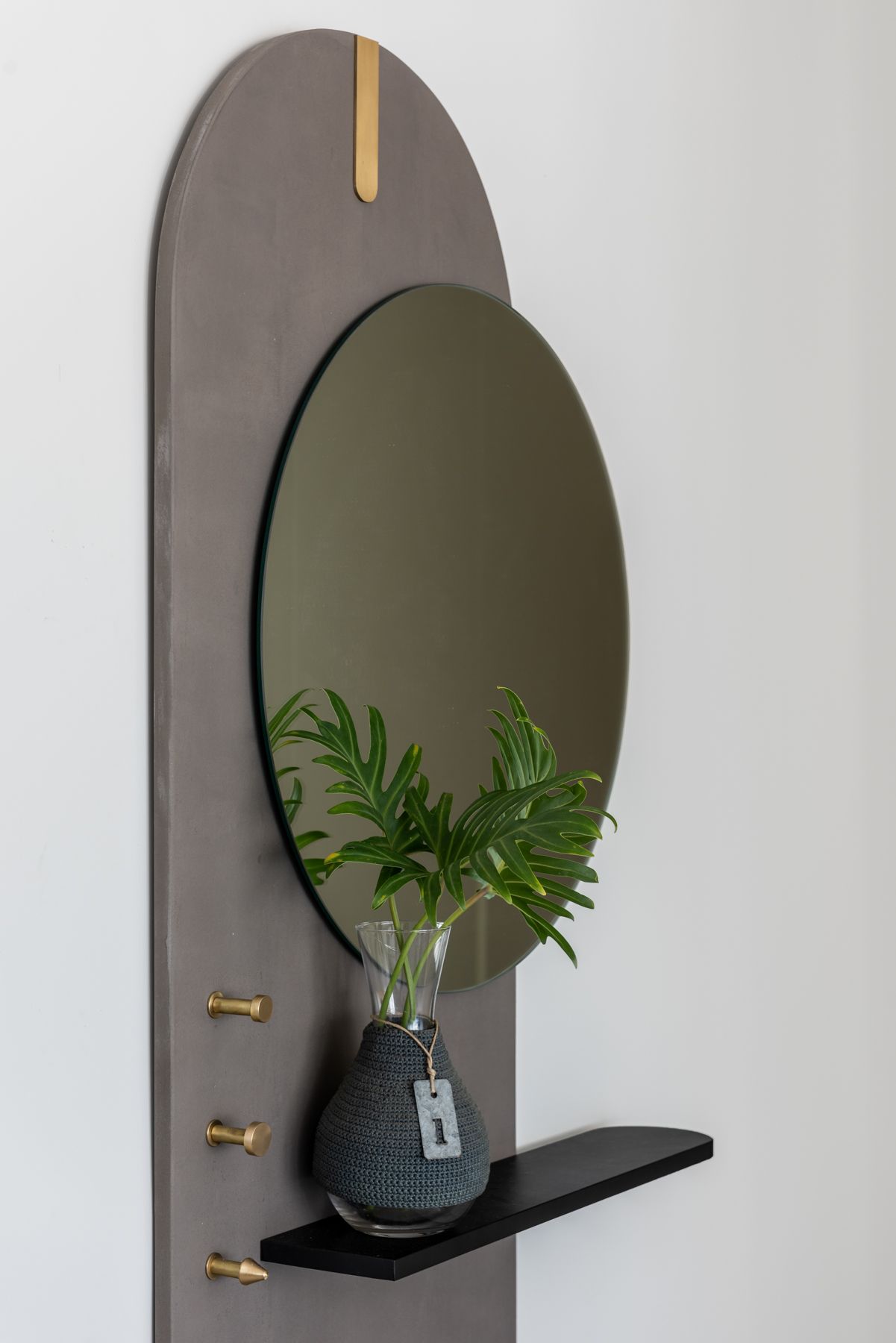 בכניסה לדירה מראה בעבודת יד על פלטת עץ עם ציפוי בטון ופרזולי פליז.