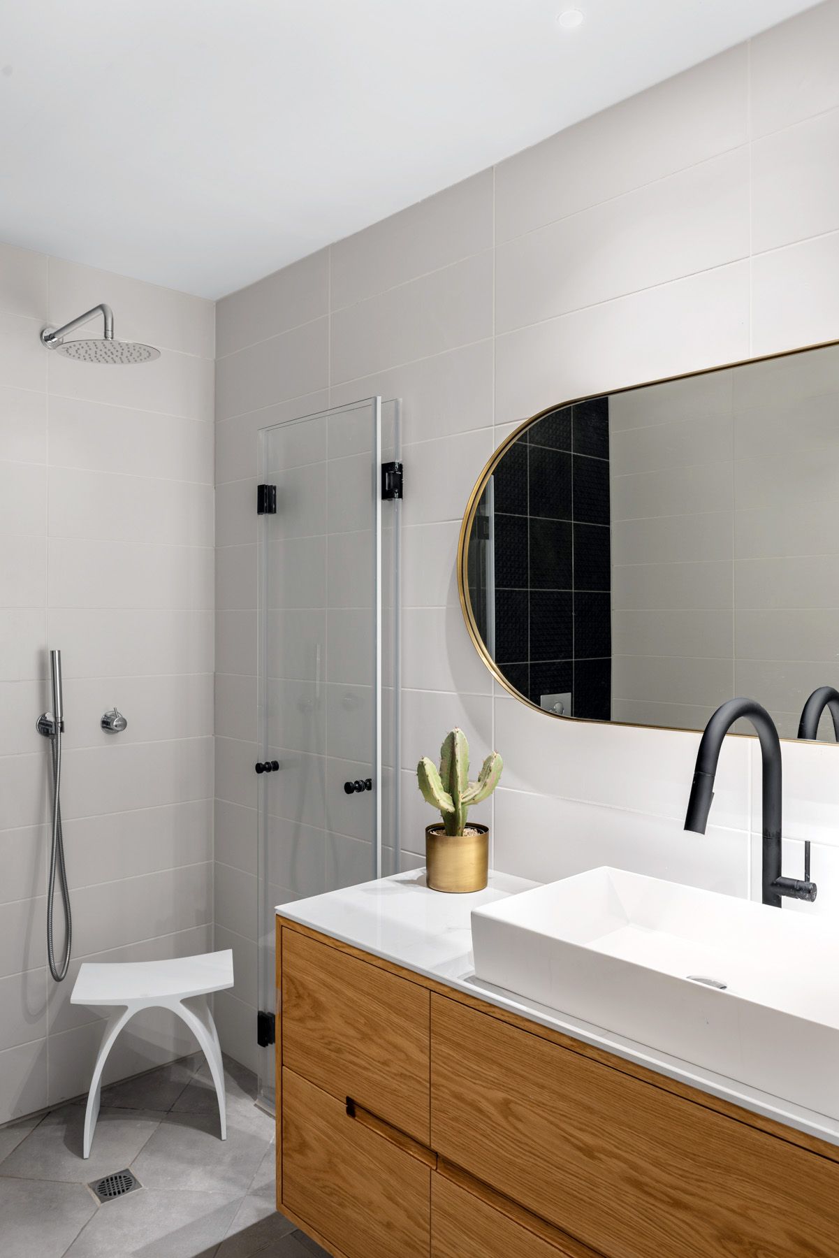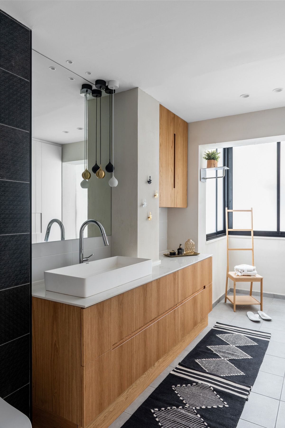 בחדרי הרחצה הותקנו ספוטים שקועים בחלל החדר ומספר גופי תאורה מיוחדים יורדים מעל ארון כיור.
