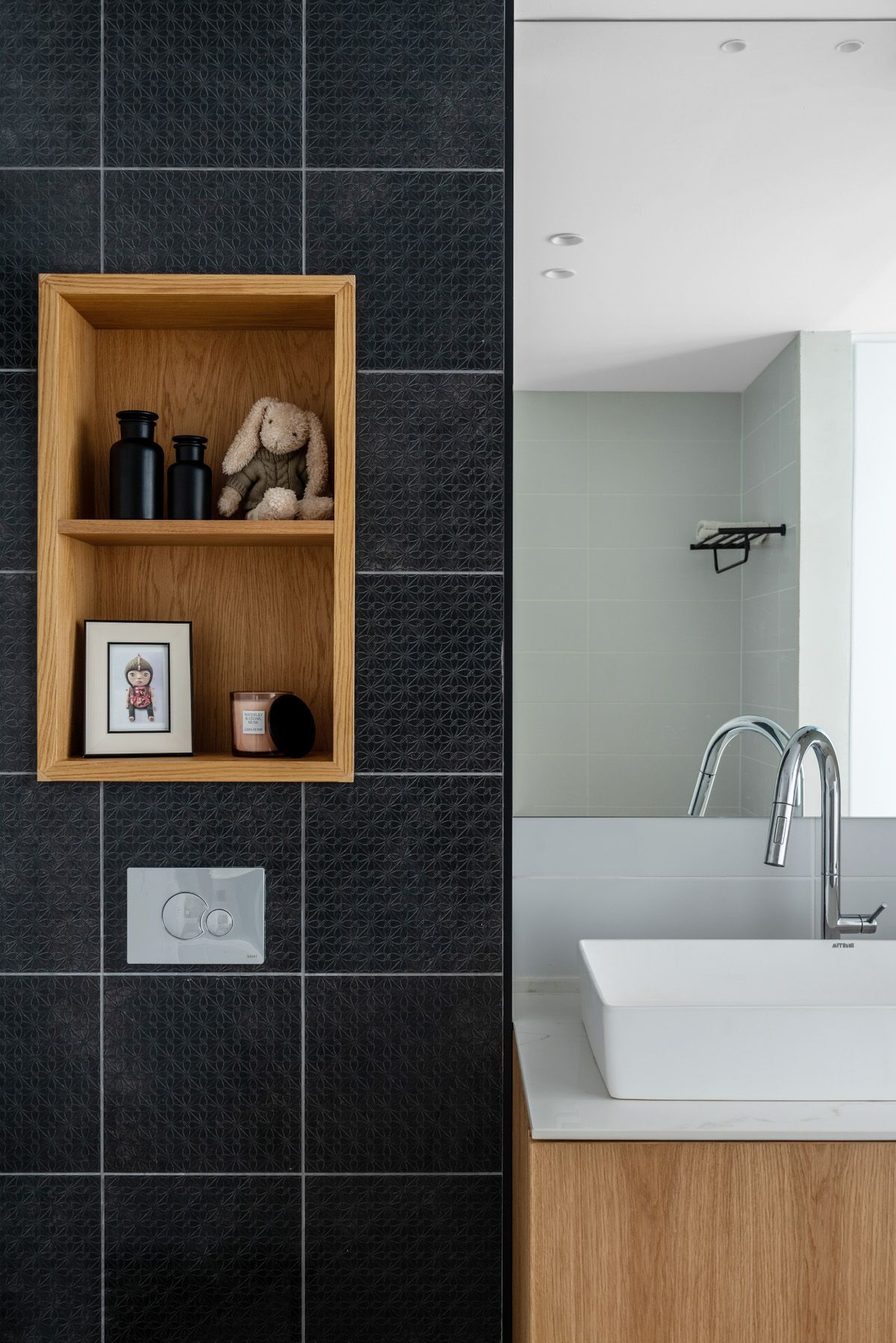 הקונספט המוביל קיר אחד בחיפוי אריחי קרמיקה שחור עם טקסטורה עדינה בשילוב נישה לנוי.