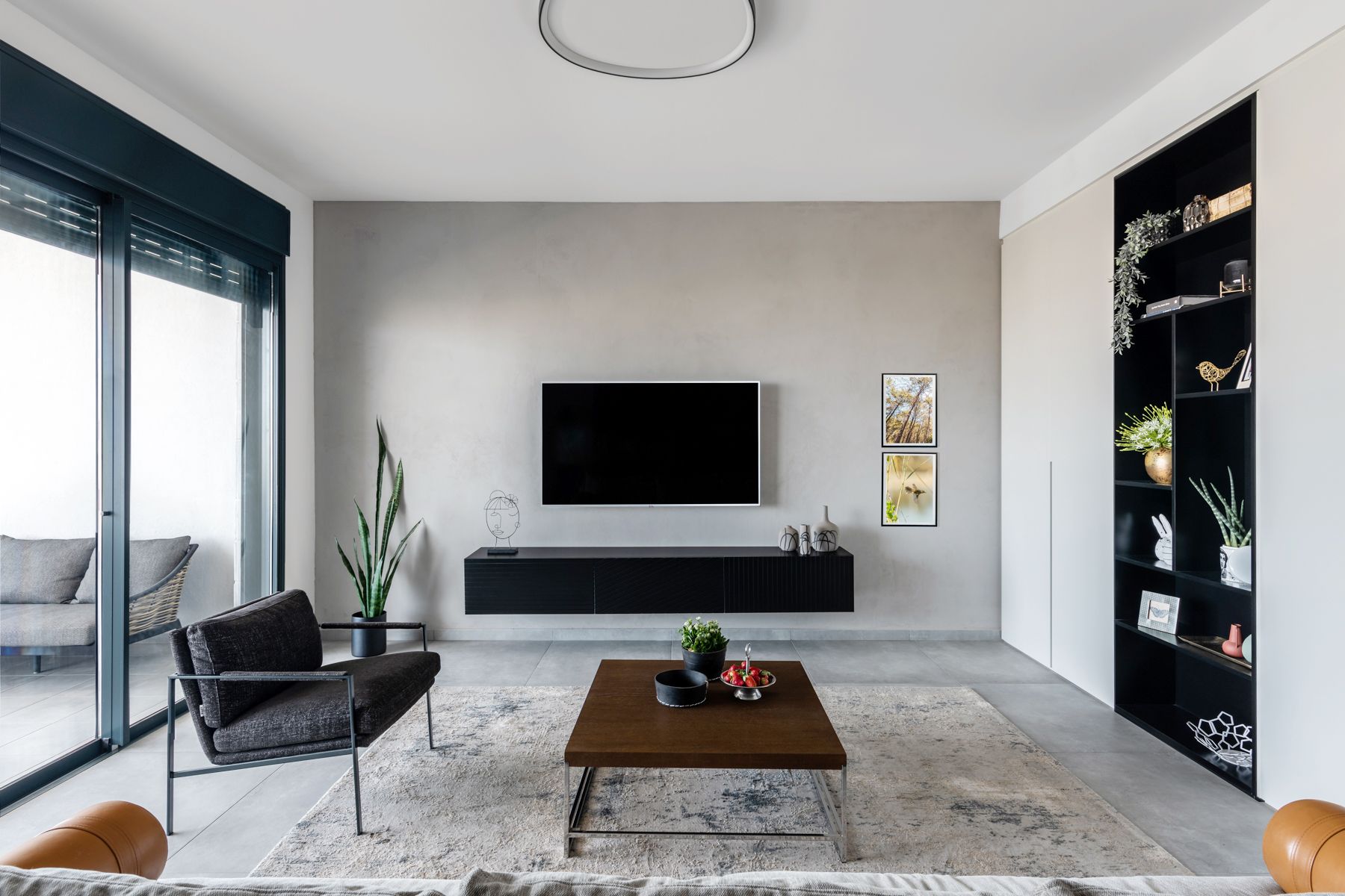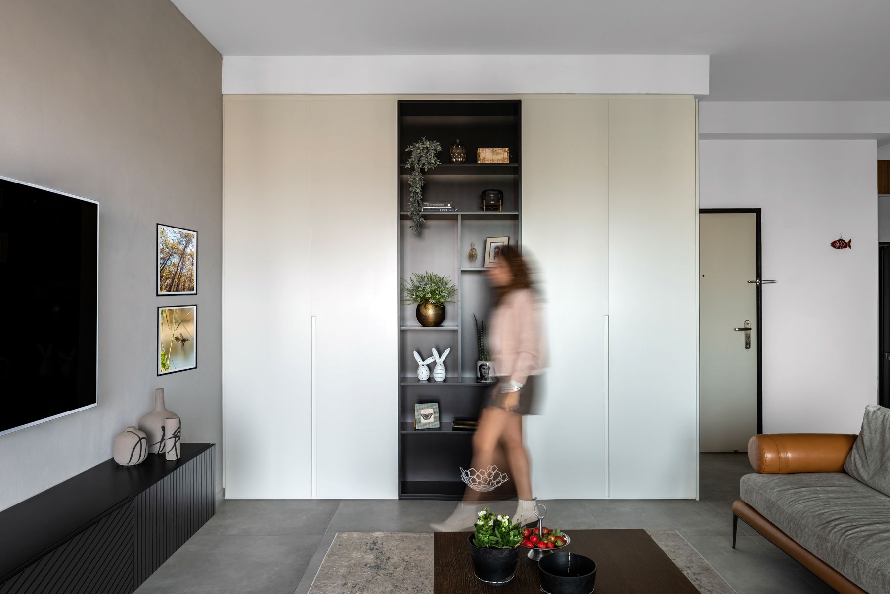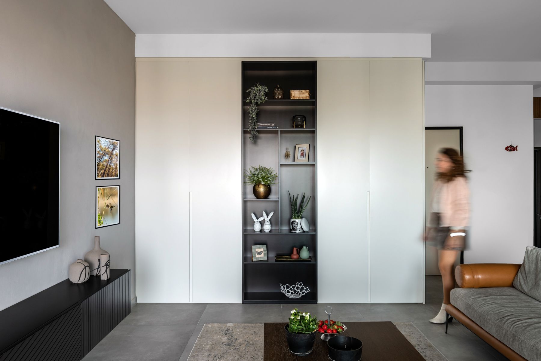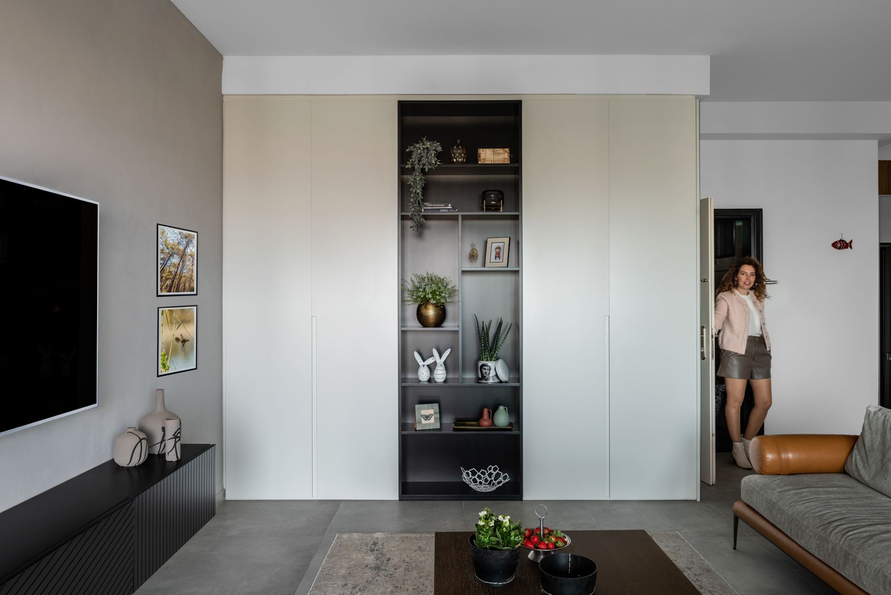 - קיר הטלוויזיה בטיח דקורטיבי בגוון ארונות המטבח - `קיר כוח`. עליו שולבה נגרות מינימליסטית צפה מעץ שחור מחורץ.