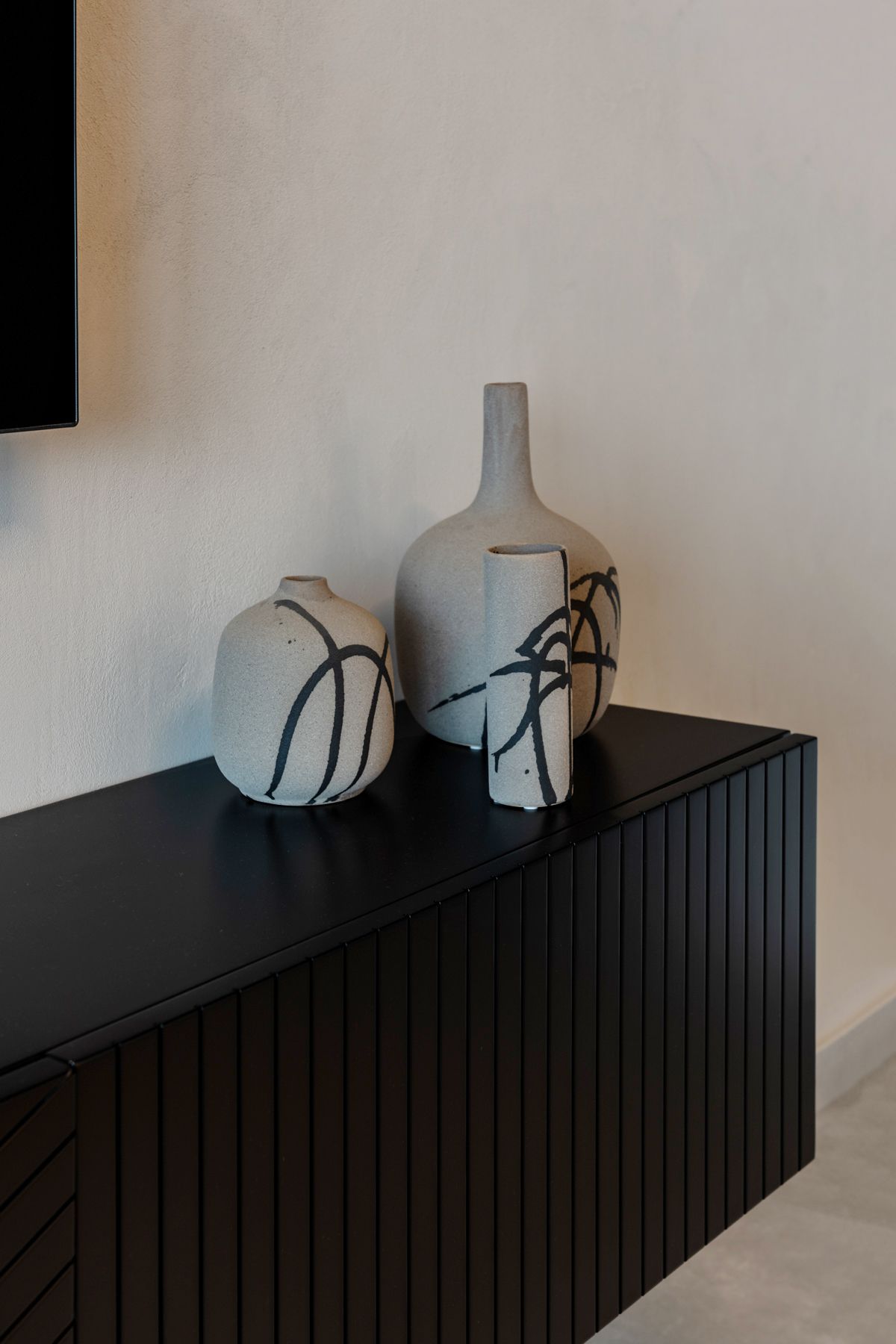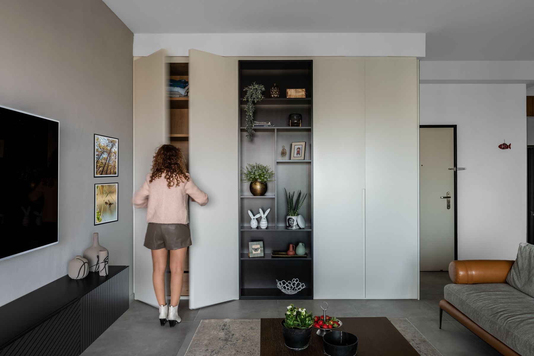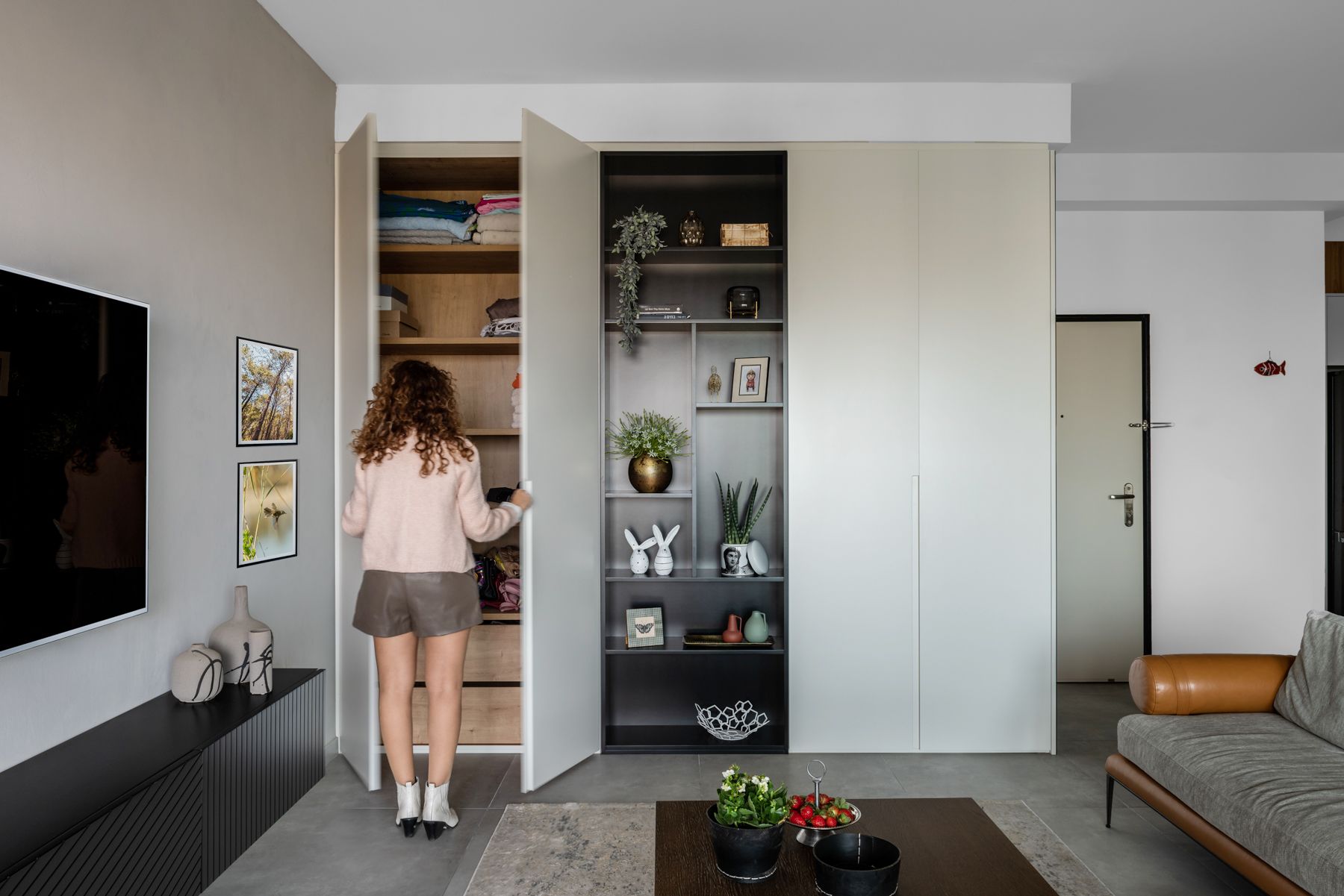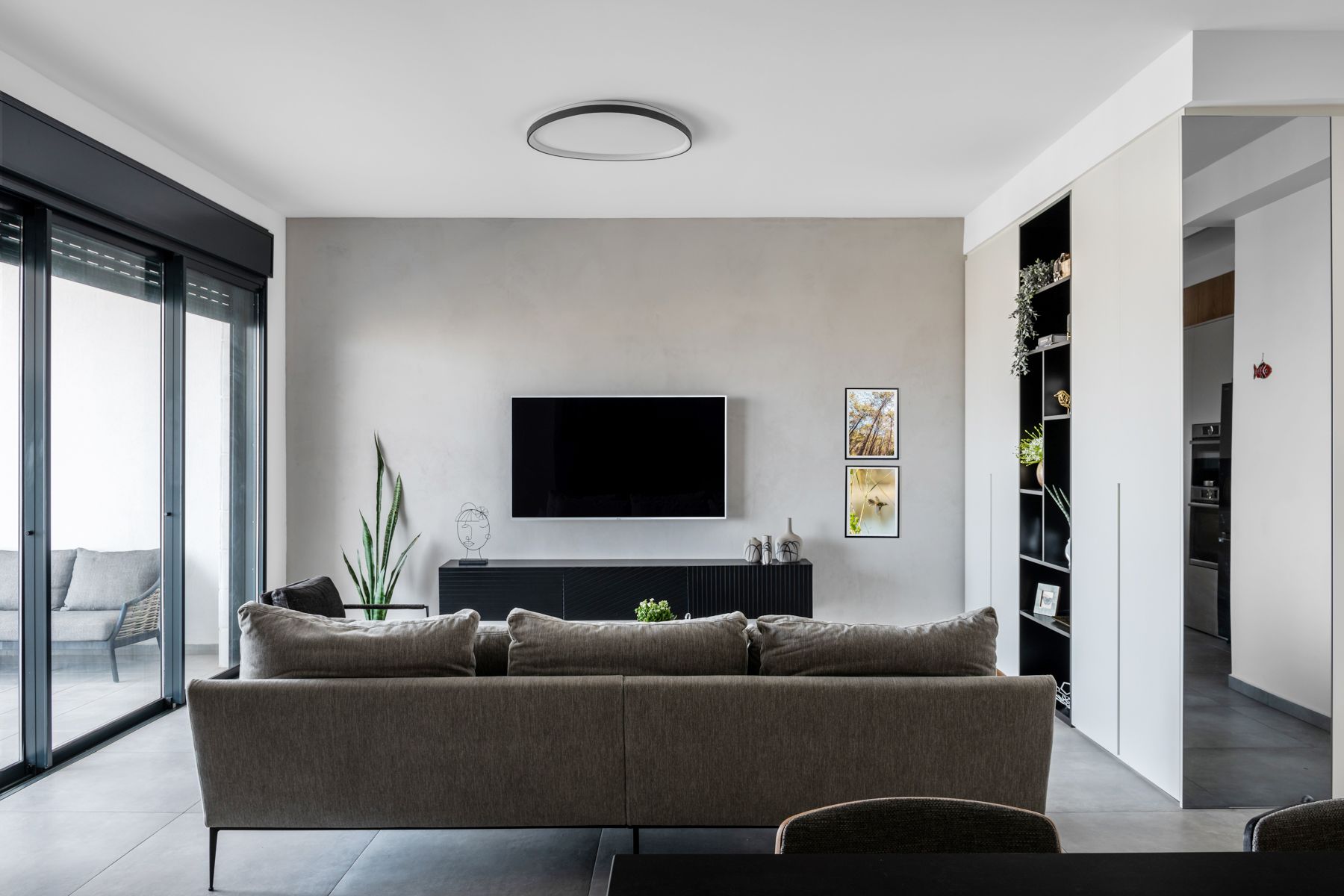 - קיר הטלוויזיה בטיח דקורטיבי בגוון ארונות המטבח - `קיר כוח`. עליו שולבה נגרות מינימליסטית צפה מעץ שחור מחורץ.