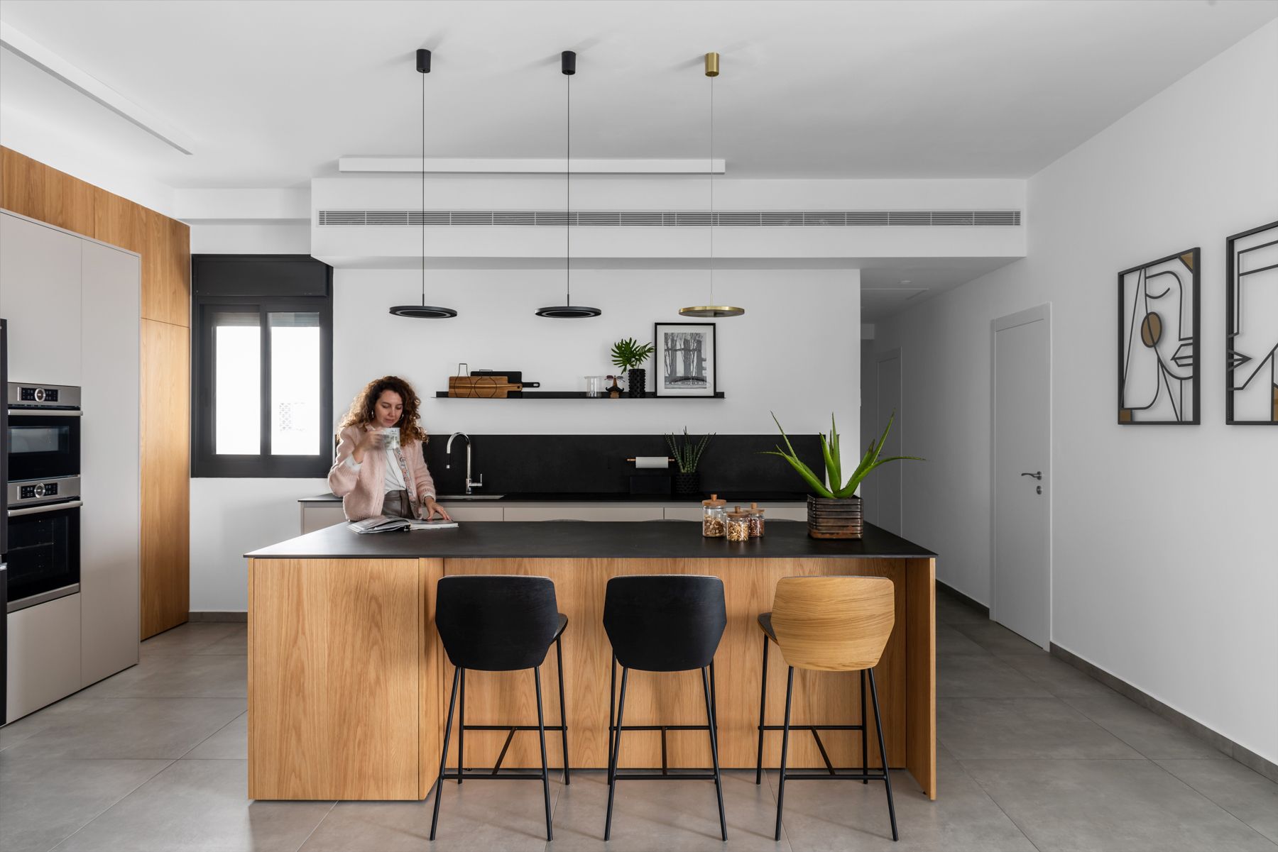 מינימליסטית, מדויקת ומשלבת צבעים וחומרים שונים בעקביות בכל חדרי הדירה.