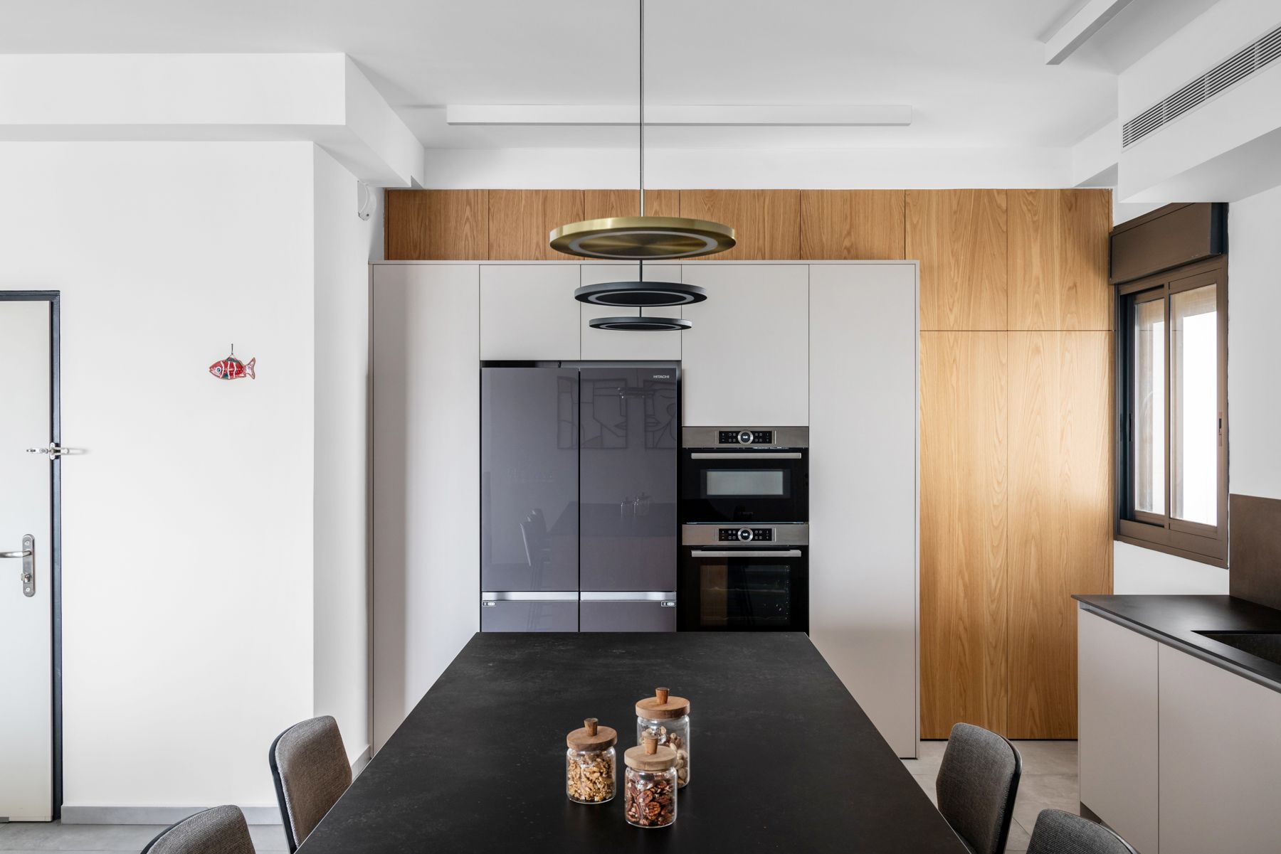 - שילוב קו ארונות גבוהים המכילים מקרר קו אפס לארונות, תנור ומקרר מובנים, מזווה גדול ומרווח.