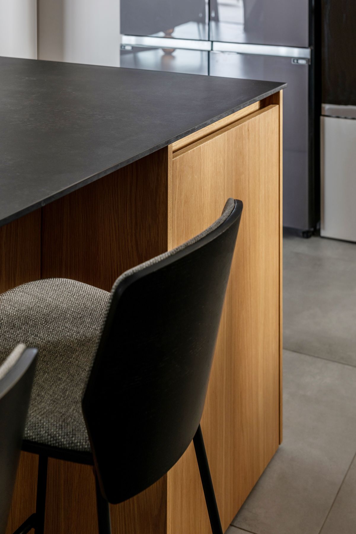 - כיסאות בר מעץ בגווני אלון טבעי ומושחר עם בחירה מוקפדת של טקסטיל תואם למושבים והגב.