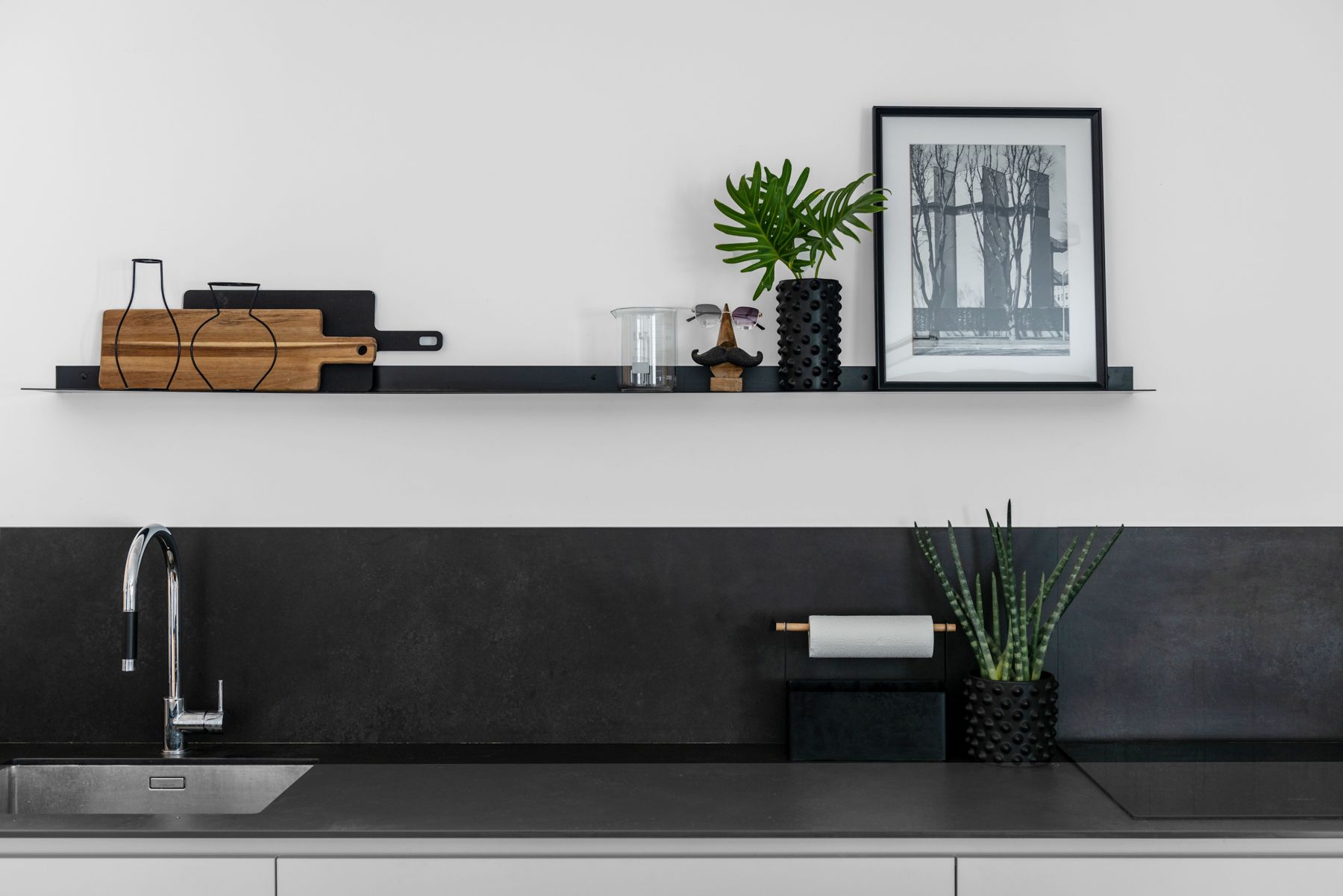 - מדף עליון ארוך עשוי ברזל שחור דקיק שובר שיגרה ועליו פרטי נוי וכלי מטבח.
