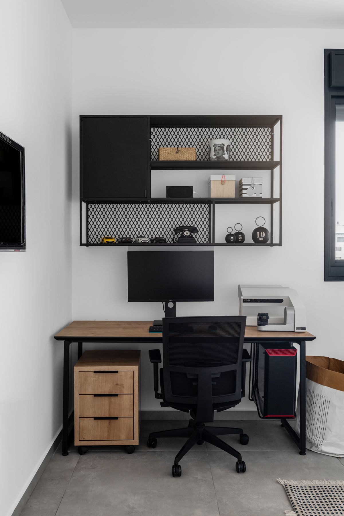 - חדר מתבגר - מיטה רחב 1.40, ארון גדול ושולחן כתיבה עם מרחב עבודה נוח ויעיל ומעליו ספריית ברזל עם שילוב גב רשת דקורטיבי במראה תעשייתי.