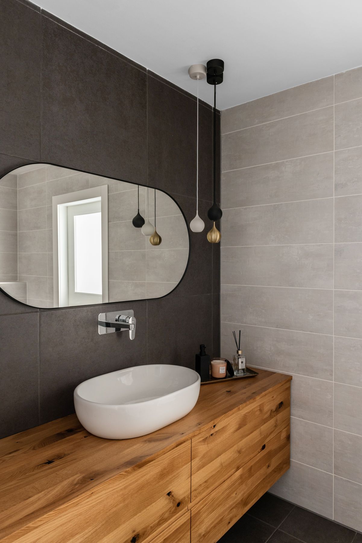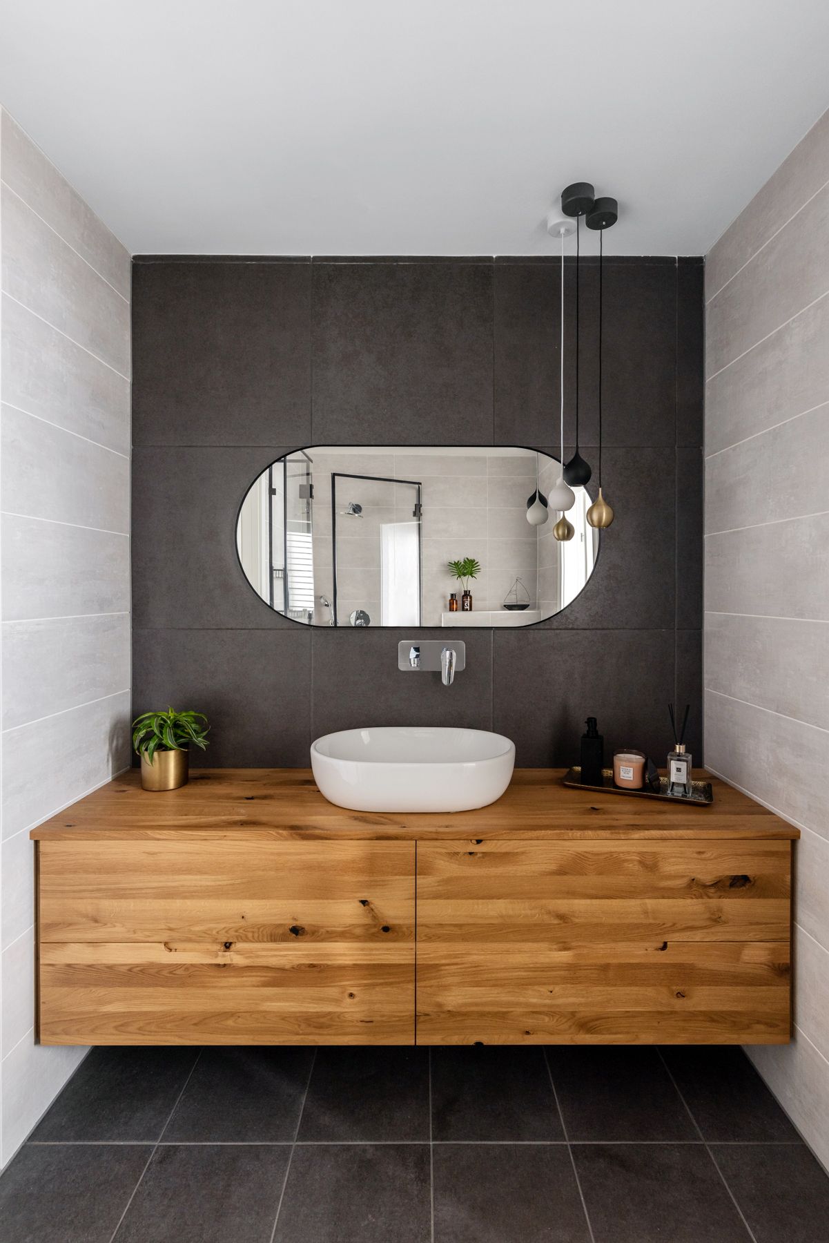 - ריצוף כהה הממשיך לקיר כוח בגוון כהה המשלב בתוכו נגרות מעץ מלא, מראה אובלית בעלת מסגרת ברזל דקיקה בצבע שחור.