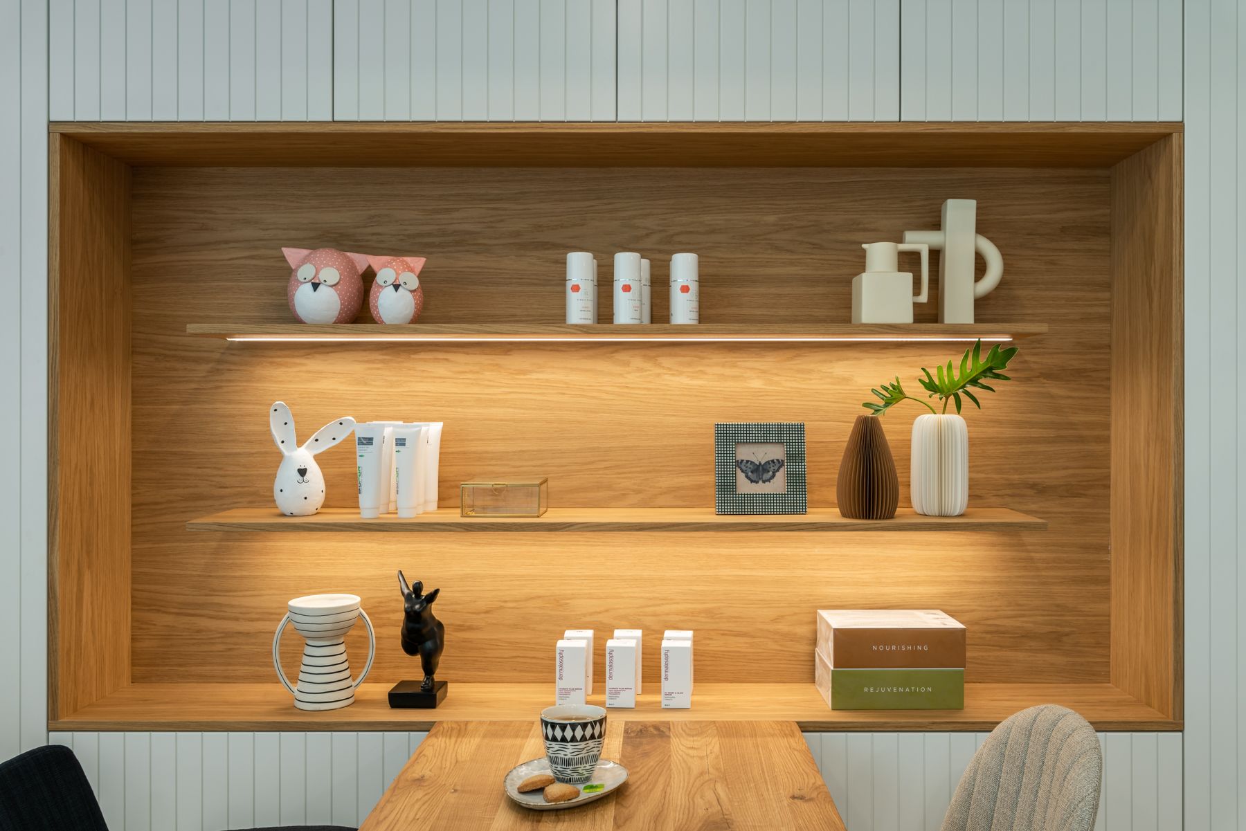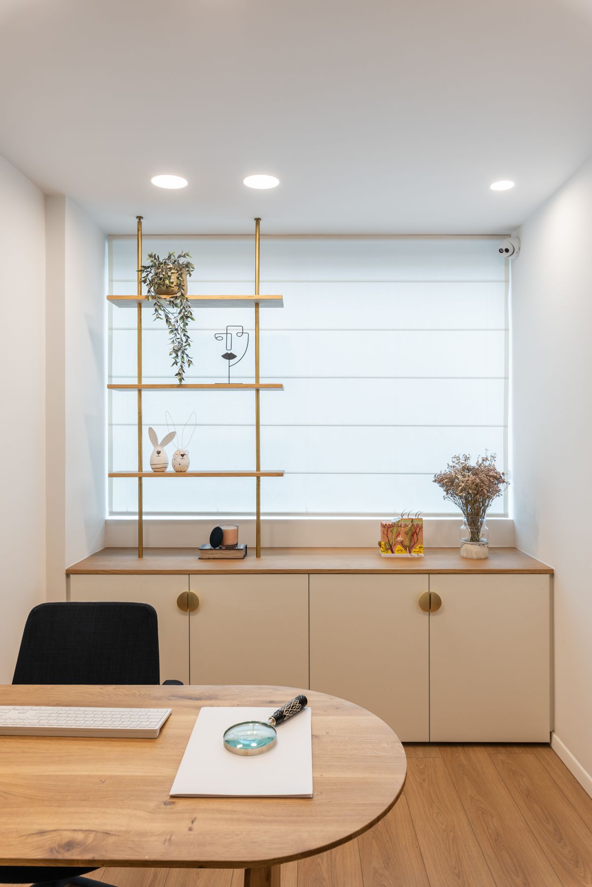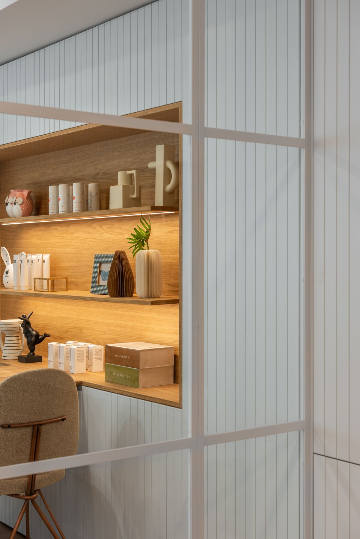 בהמשכו אזור המשרד הראשי של יפה הכולל פינת עבודה, מדפי תצוגה מוארים ואחסון מובנה נוסף.