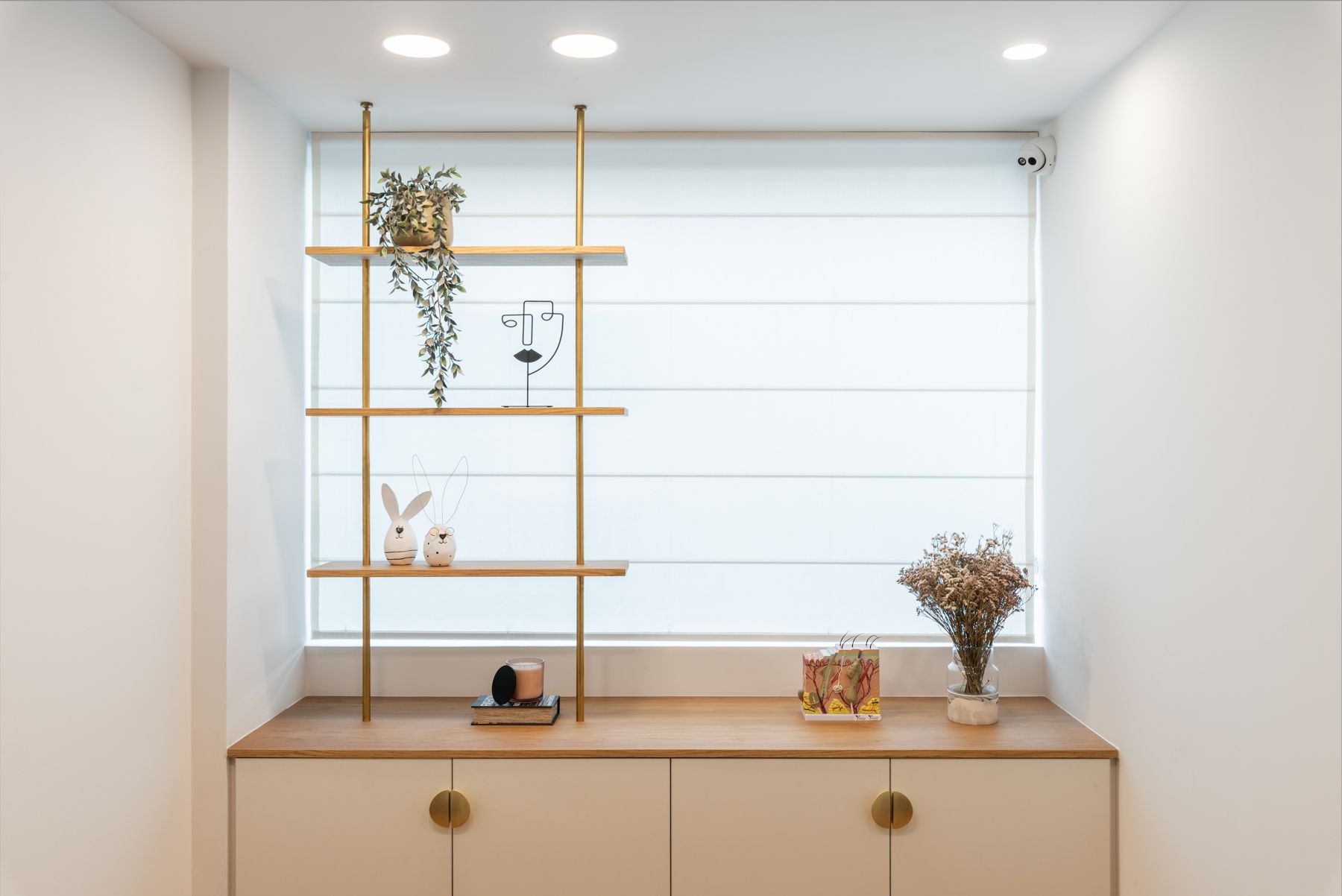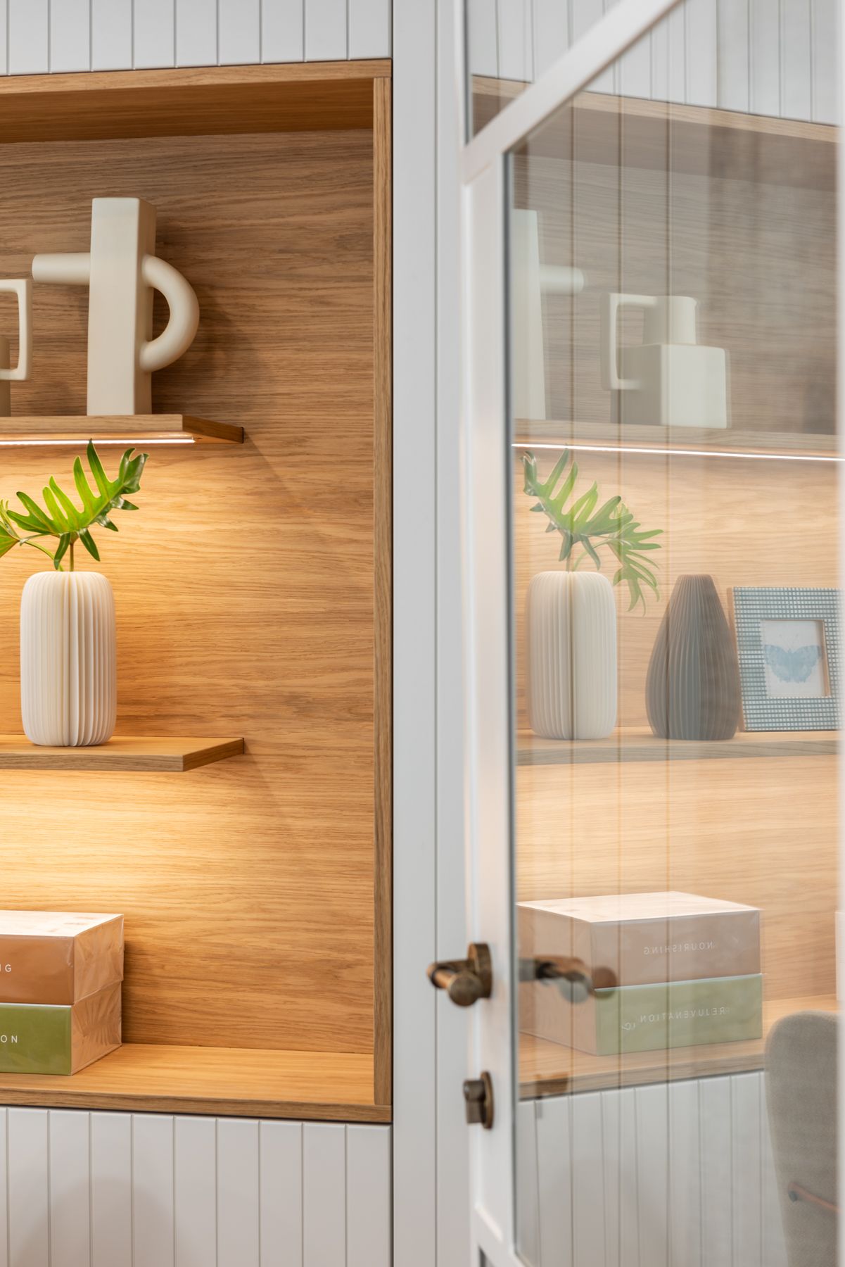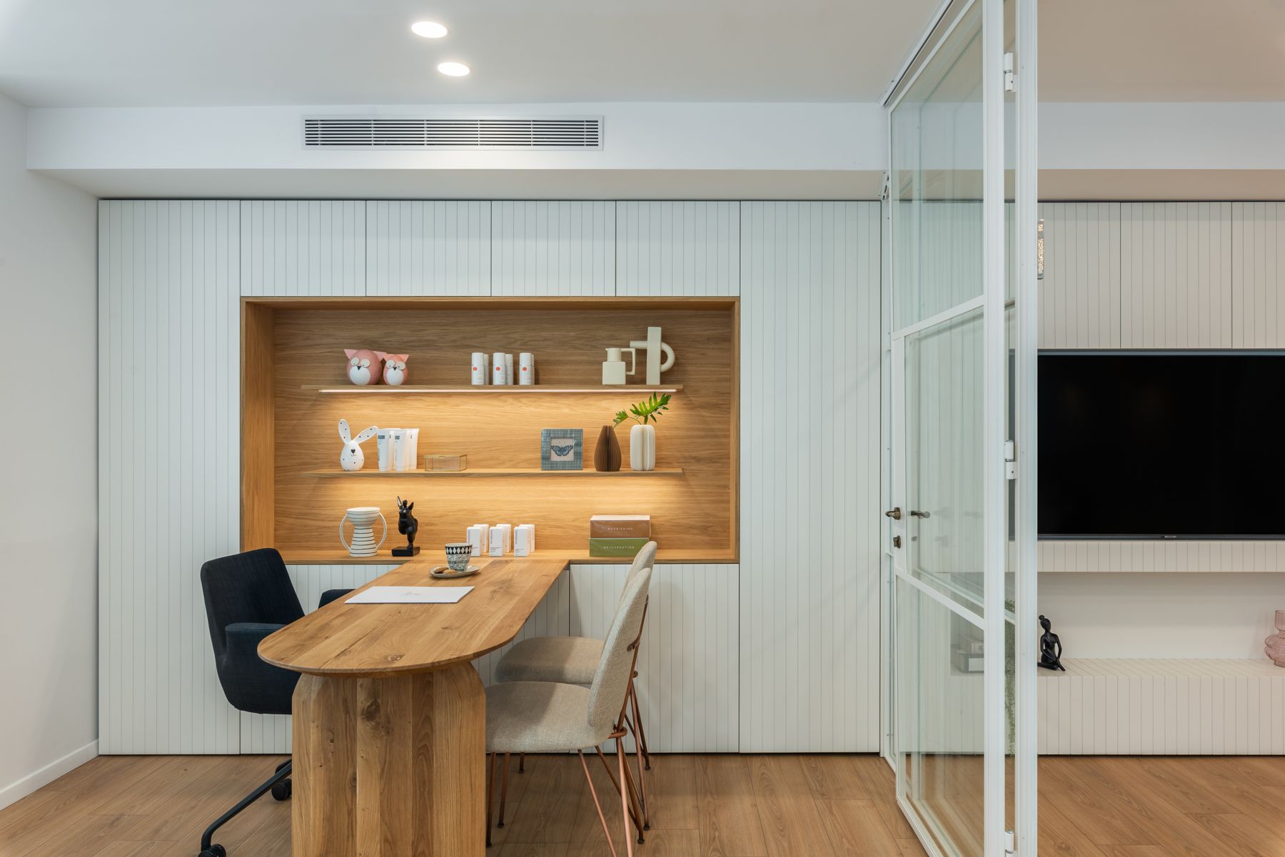 בהמשכו אזור המשרד הראשי של יפה הכולל פינת עבודה, מדפי תצוגה מוארים ואחסון מובנה נוסף.