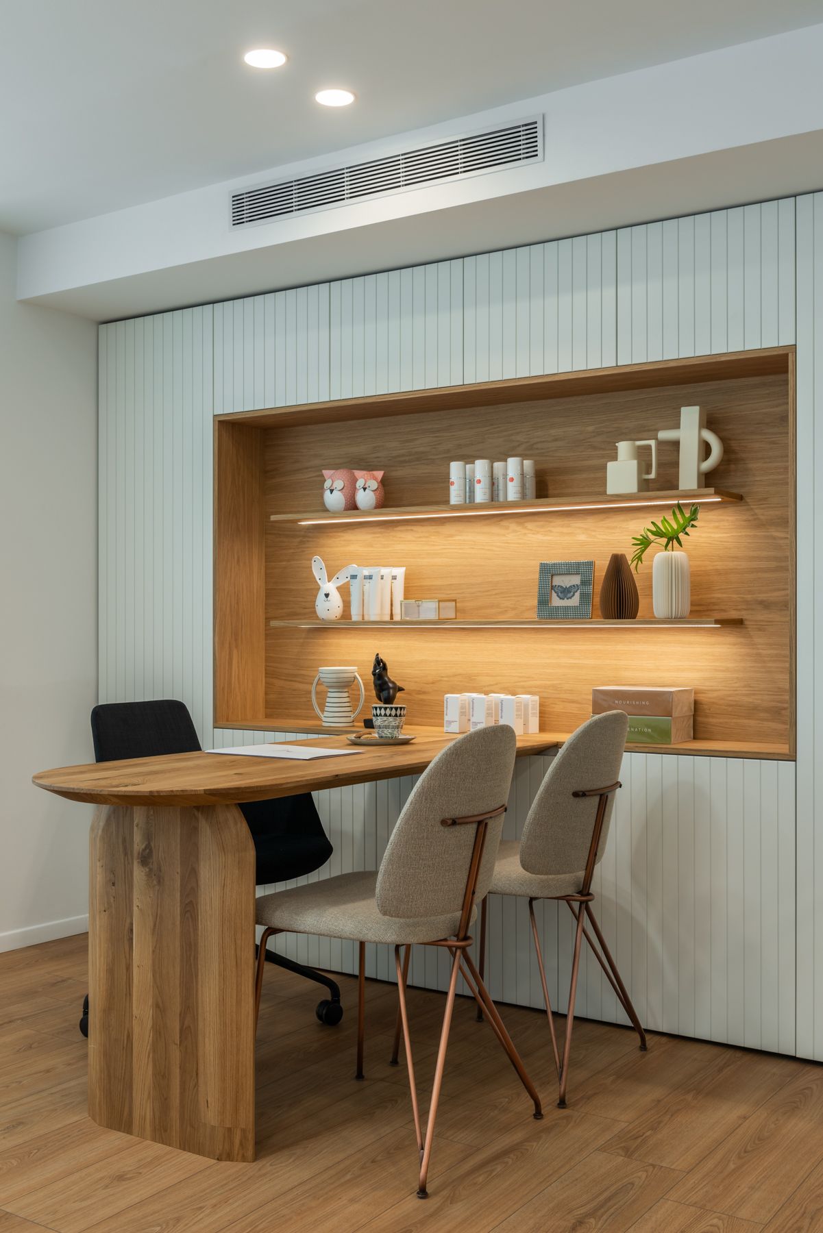 חדר ייעוץ - תוכנן בקונספט דומה לחדרי ייעוץ הקיימים במבנה אך עם דגש על נגרות מעוגלת מעץ מלא. שולבו מדפים מאווררים התלויים על מוטות פליז מהנגרות ועד לתקרה.