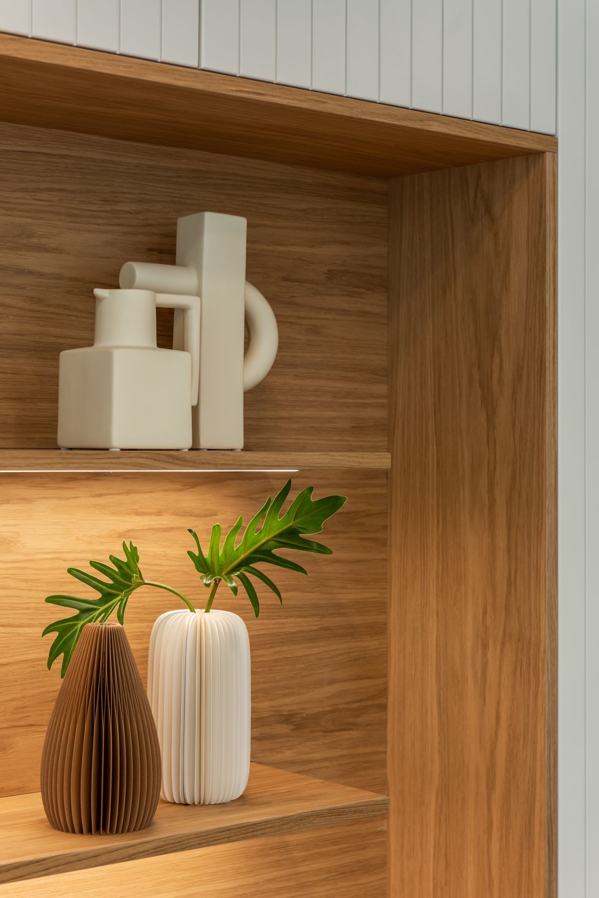 החל מקיר הכוח הדומיננטי דרך ארונות האחסון ועד לשולחנות העבודה בחרתי שילוב של דלתות מחורצות בחיתוך מדויק, נישות ומדפים מעץ מלא, פלטות ורגלים מעץ מלא בגימור משופע.