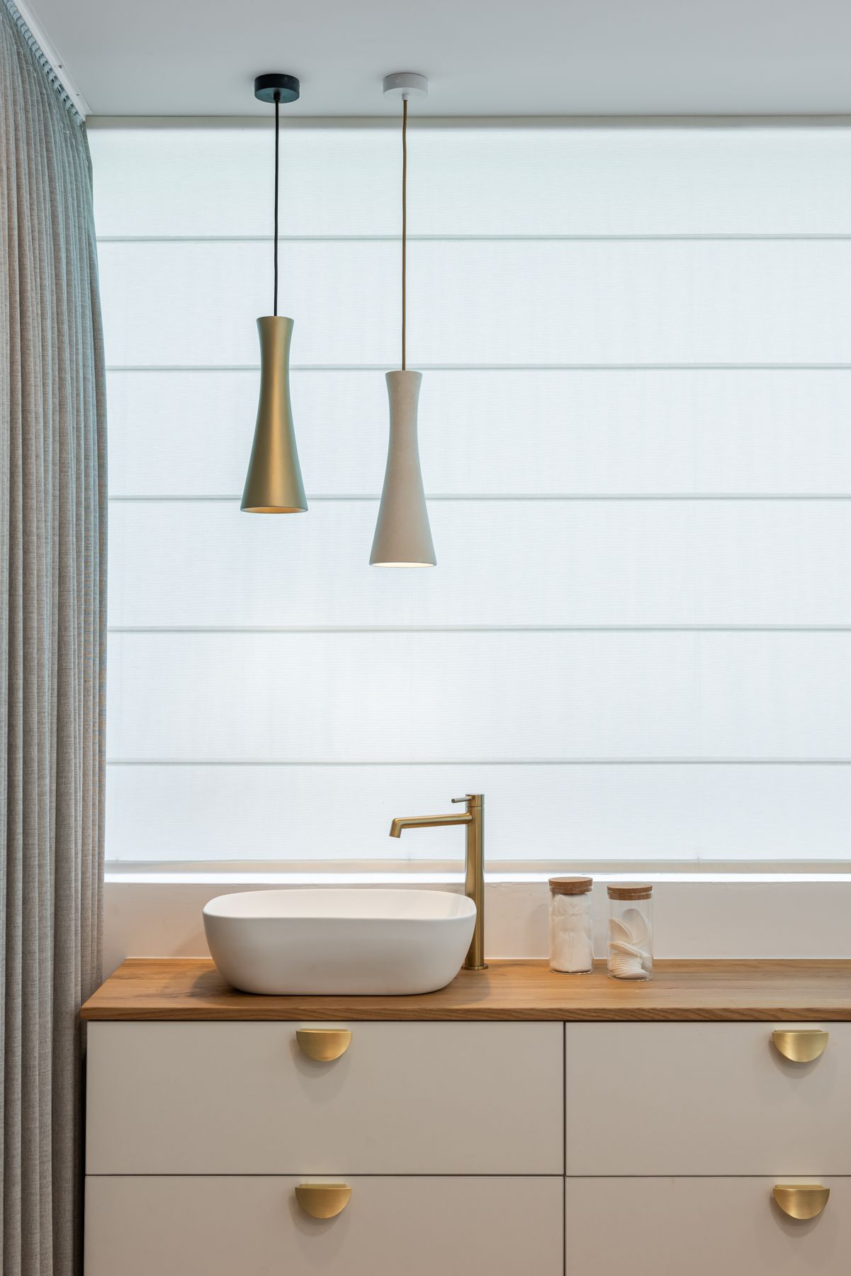 בחדר השירותים נבחר גוף תאורה תלוי עשוי מאלומיניום בשני חלקים בגימור צבעים שונים.