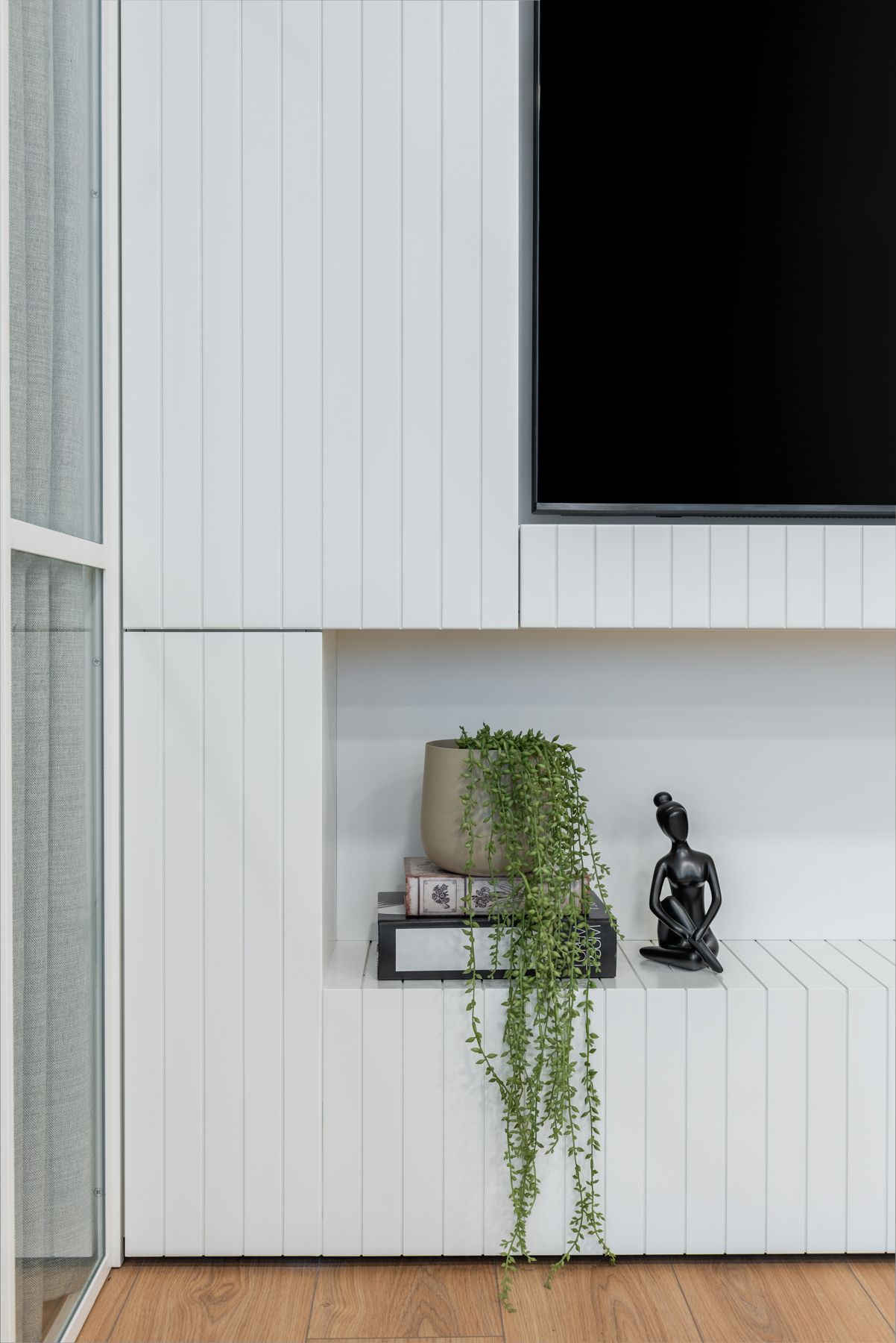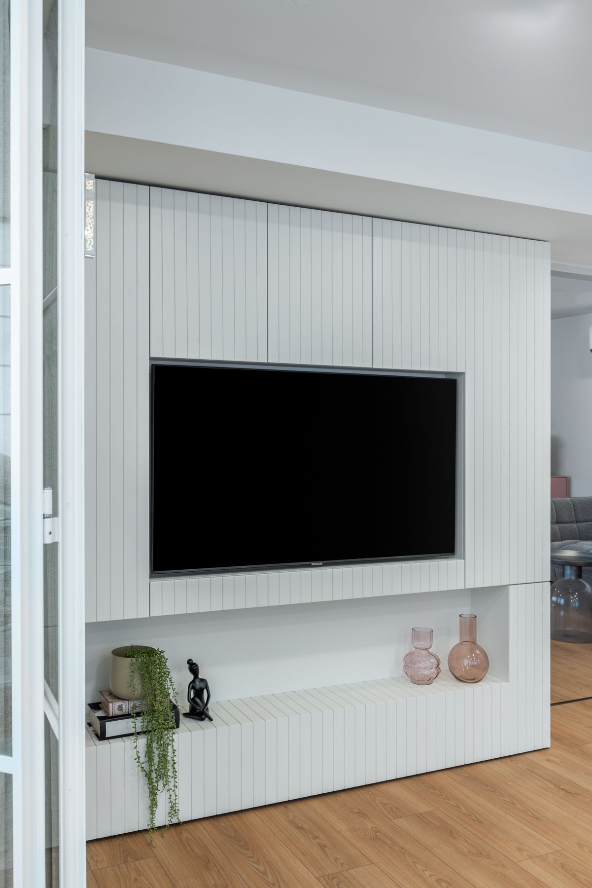 קיר כוח - לכל אורך הקיר השלם והדומיננטי יישמתי נגרות משולבת ופרקטית, באזור האירוח כוללת טלוויזיה בנישה ייעודית בקו אפס, מדף תצוגה מתחתיו וארונות אחסון רבים. ניצלנו את המקום להסתרת לוח החשמל והתקשורת בקומה זו.