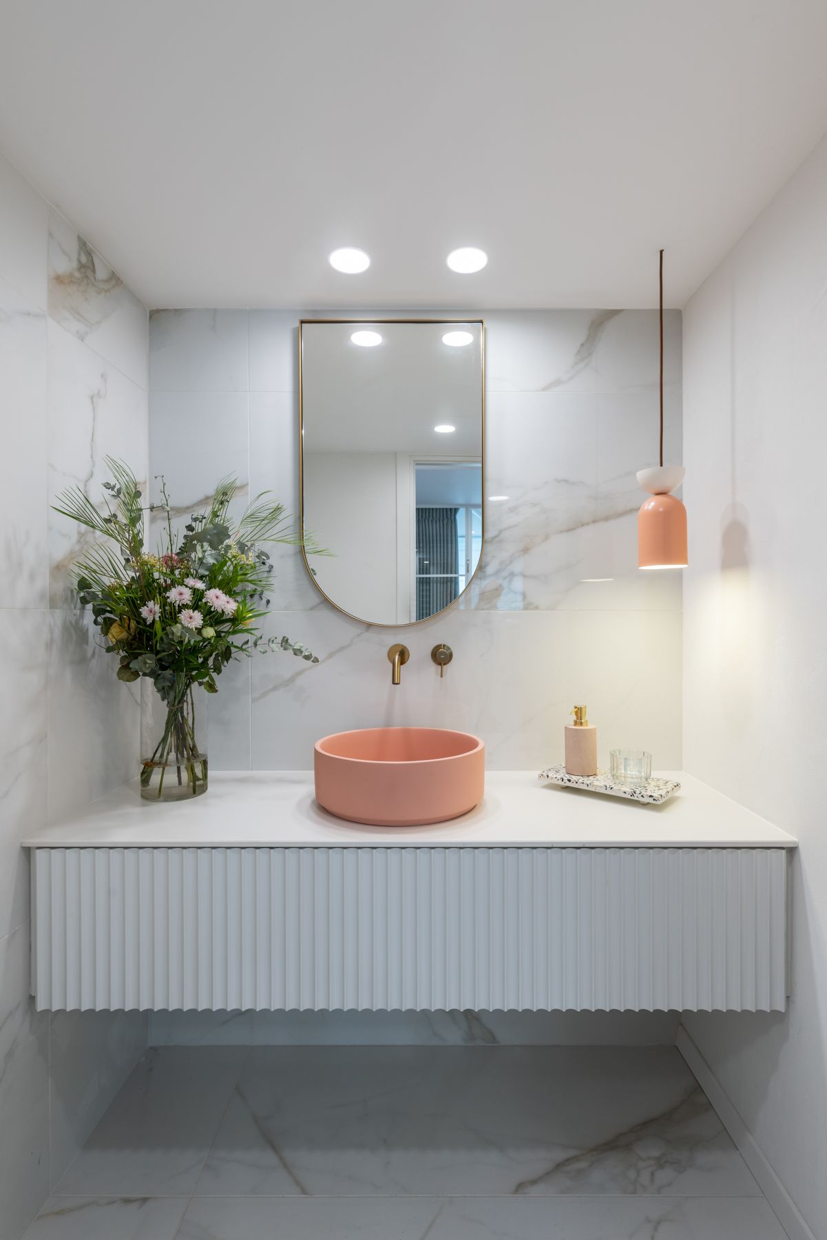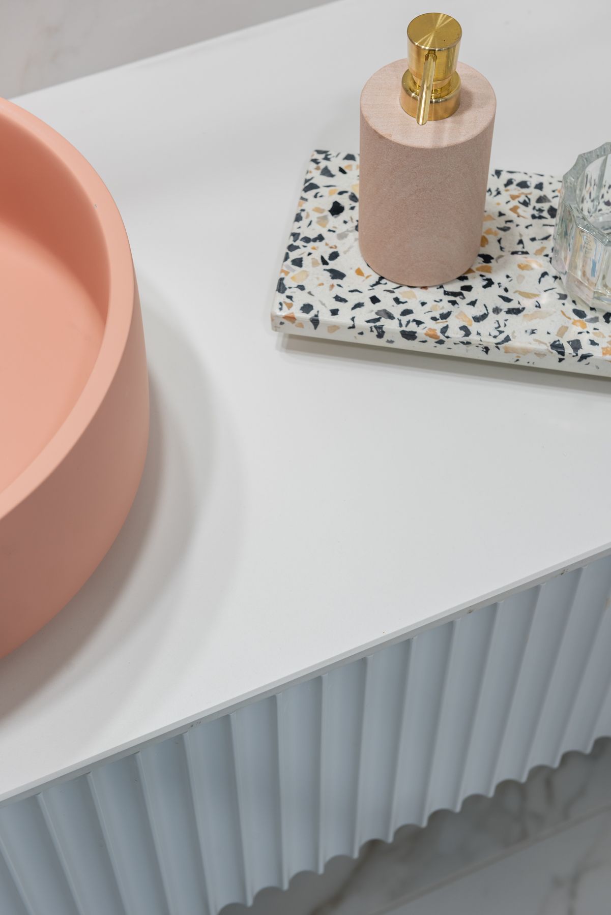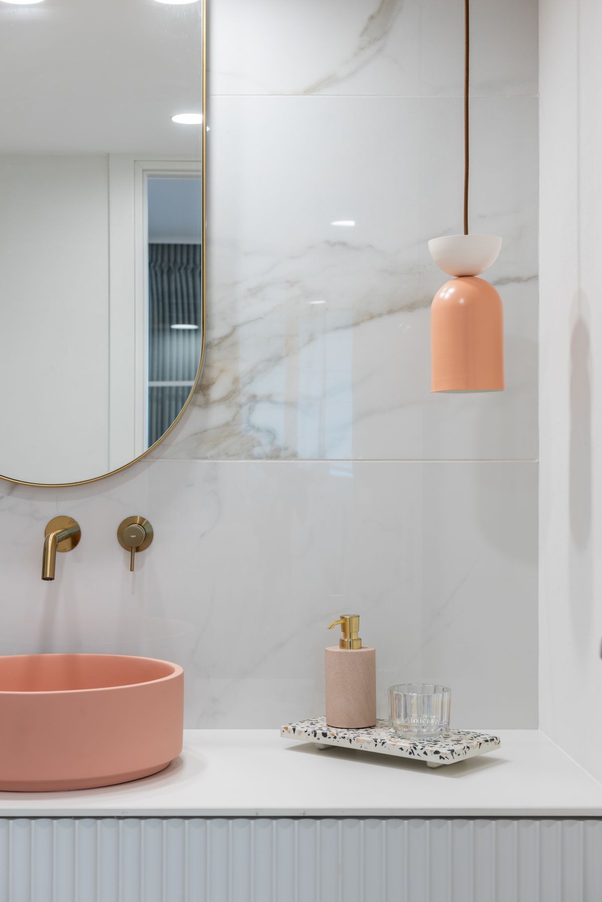 תוכננה יחידת נגרות יוקרתית בעלת מראה קליל ומעליה כיור עילי ורוד וברז קיר מוזהב.