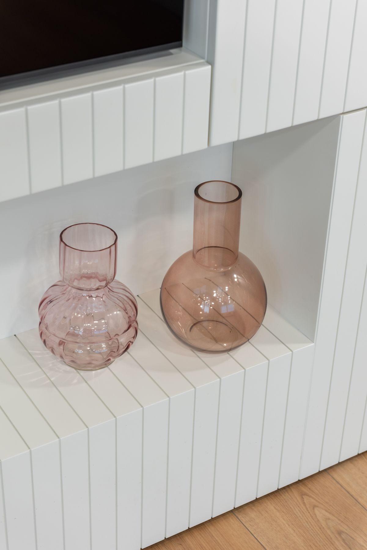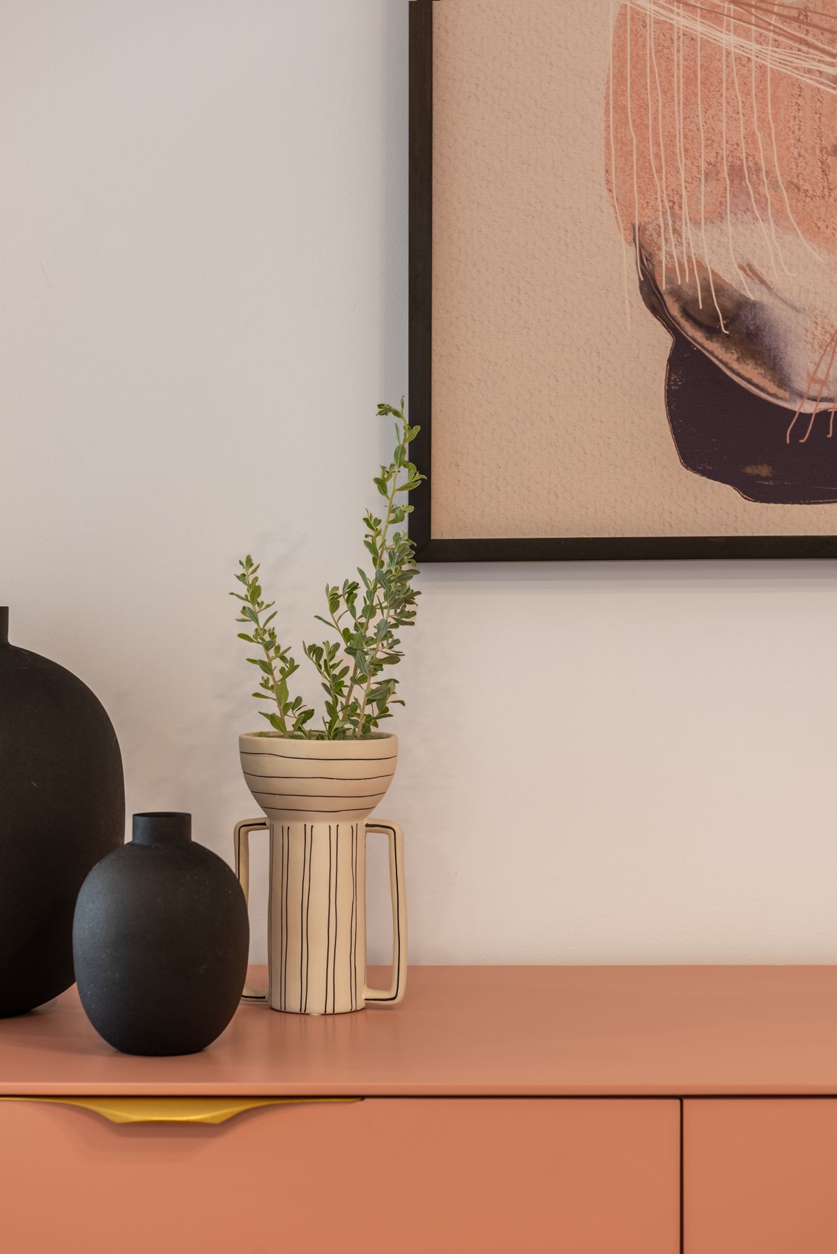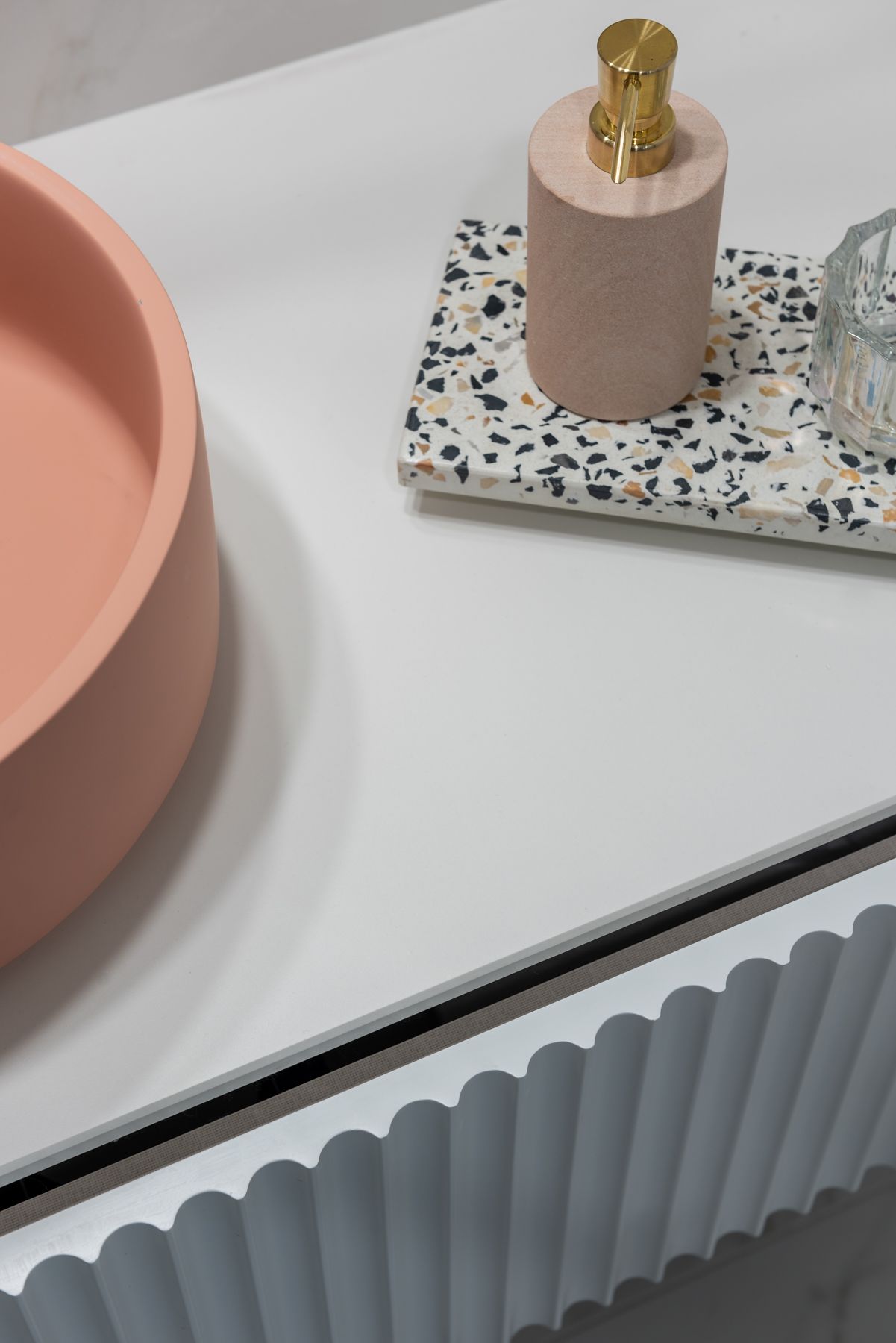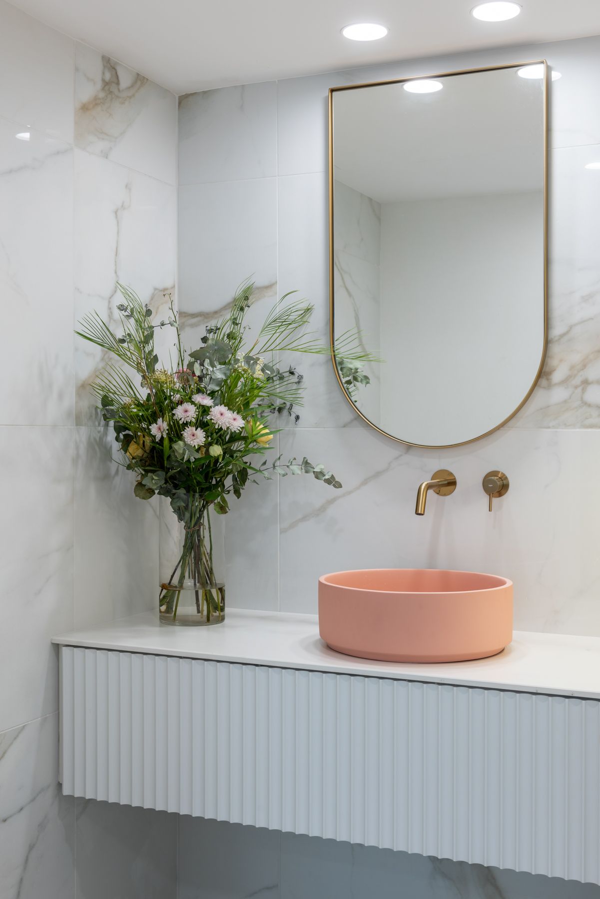 תוכננה יחידת נגרות יוקרתית בעלת מראה קליל ומעליה כיור עילי ורוד וברז קיר מוזהב.