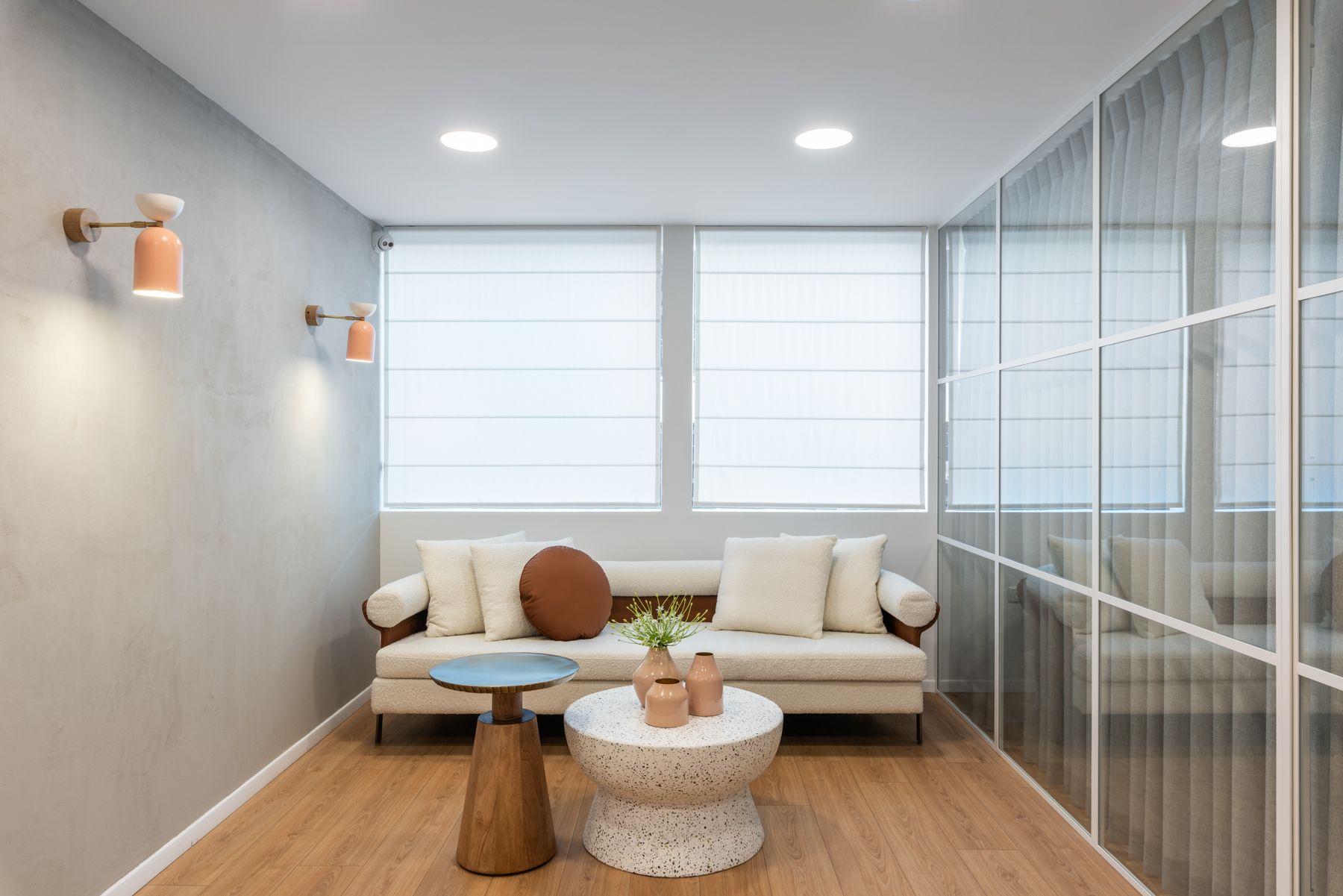 - חדר הטיפולים הראשי של יפה מקסימוב הכולל אזור טיפול מרווח ולצידו פינת עבודה משרדית אינטימית.
