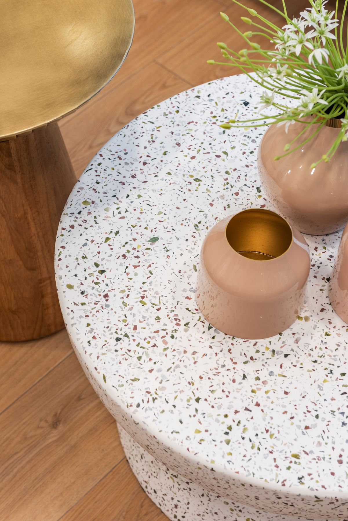 שולחן טראצו מעוגל בקוטר 70 בשילוב רחב של צבעים וטקסטורה, ולצידו שולחן ברונזה עם בסיס חרוט מעץ מלא. שניהם ביחד יוצרים מראה משלים ומיוחד.