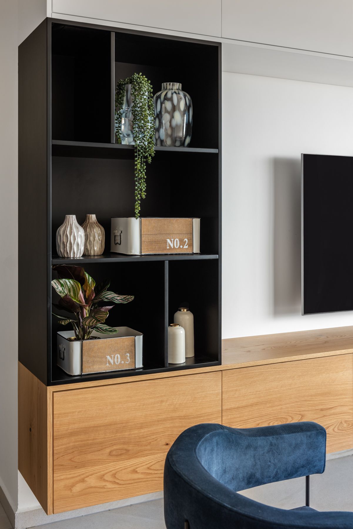 בקיר הטלוויזיה תוכננה נגרות המשלבת אחסון רב בהיבט הפונקציונאלי ומדפים דקורטיביים לפרטי נוי המשלימים את הטאצ` העיצובי.