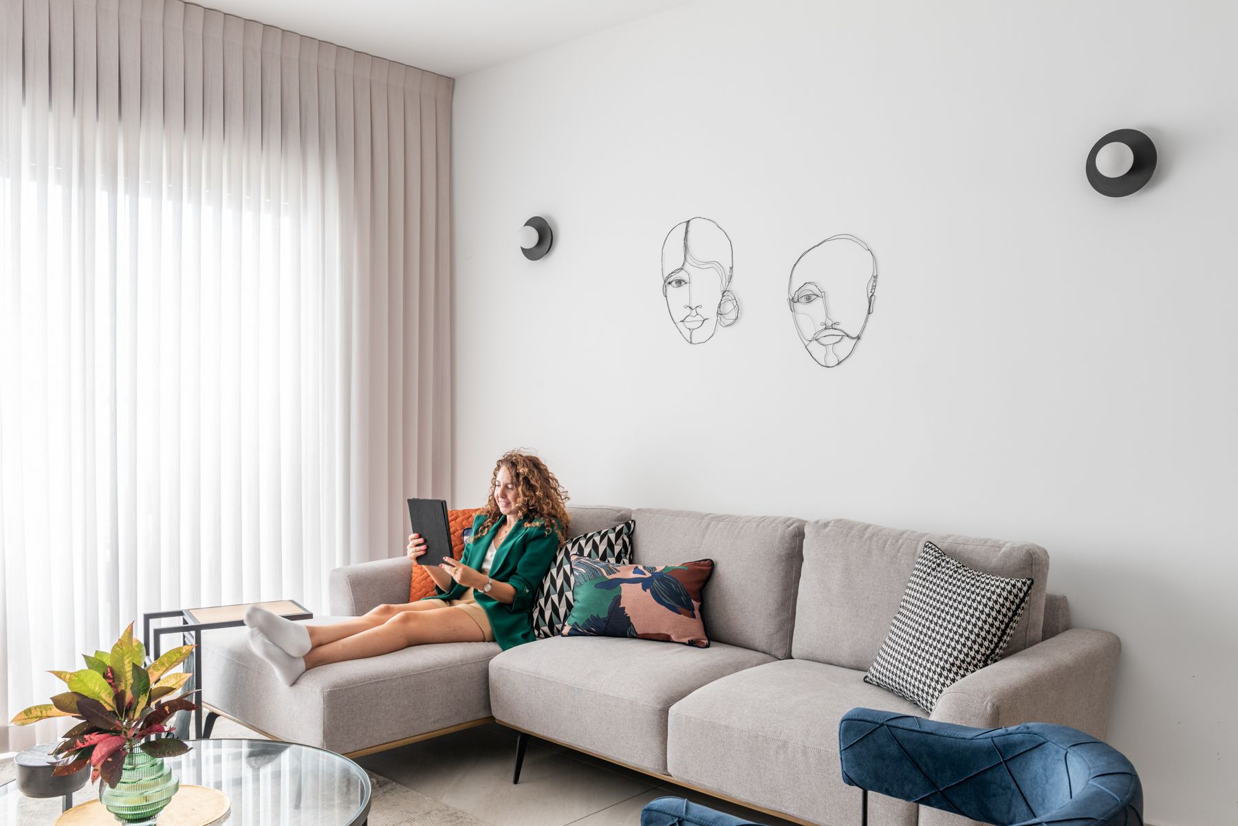 הלקוחה, מטפלת אישית וזוגית במקצועה, רצתה לעצמה דירה חמימה ונעימה עם דגש על פונקציונאליות ומקומות אחסון רבים, חדר עבודה וטיפול מרווח ונעים, חלל מרכזי אינטימי מצד אחד ומצד שני מאפשר אירוח משפחה וחברים.