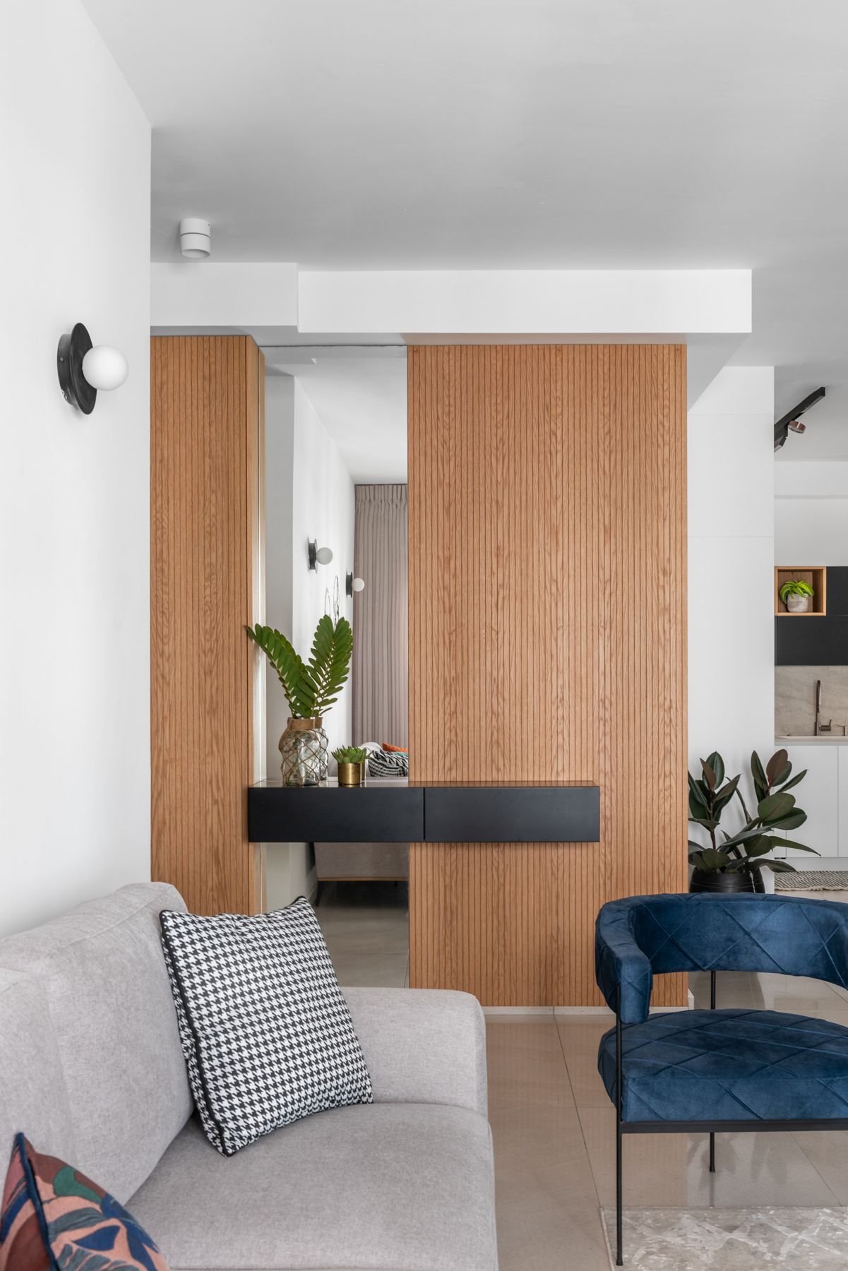 לשבירת המראה האחיד תוכננה קלפה בגווני אפור כהה וקוביות עץ אלון.