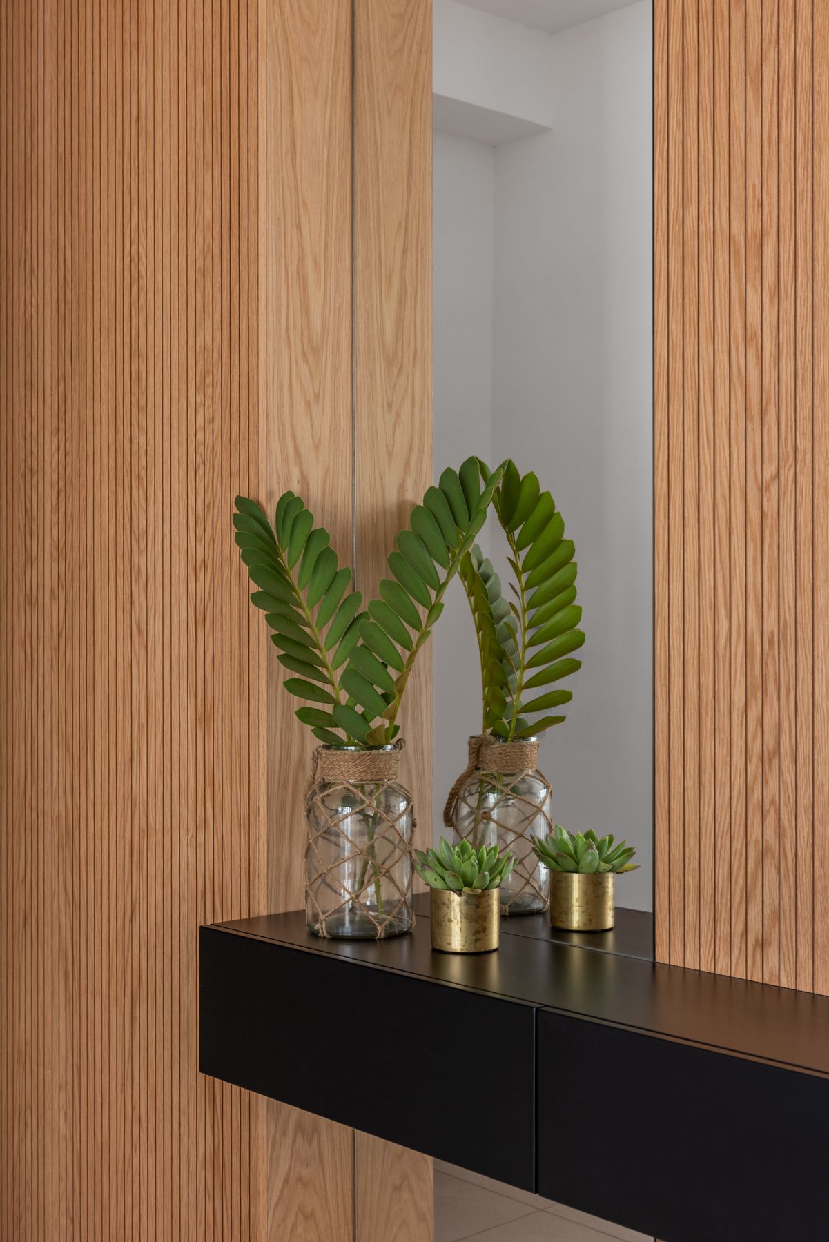 ביצוע מושלם של חיפוי עץ, ארונות ומראה ענקית בשלושה רבדים בכניסה לדירה.