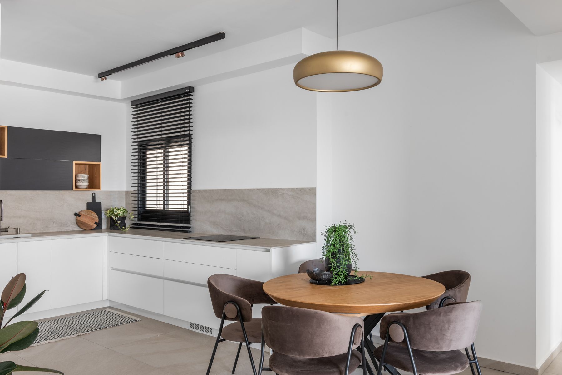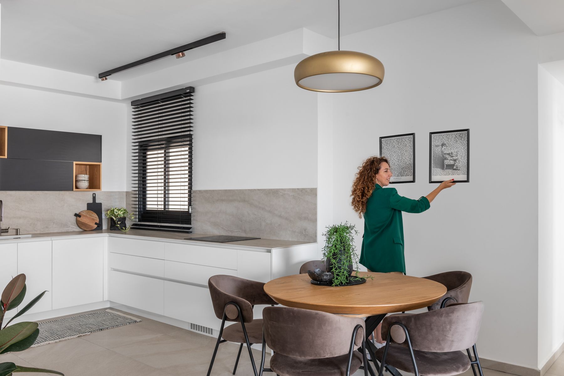 בפינת האוכל שולחן עגול עם משטח עץ אלון ורגל ברזל שחורה שמעניקה לו נוכחות מסוגננת, אפשרות להרחיבו בהתאם למספר הסועדים.