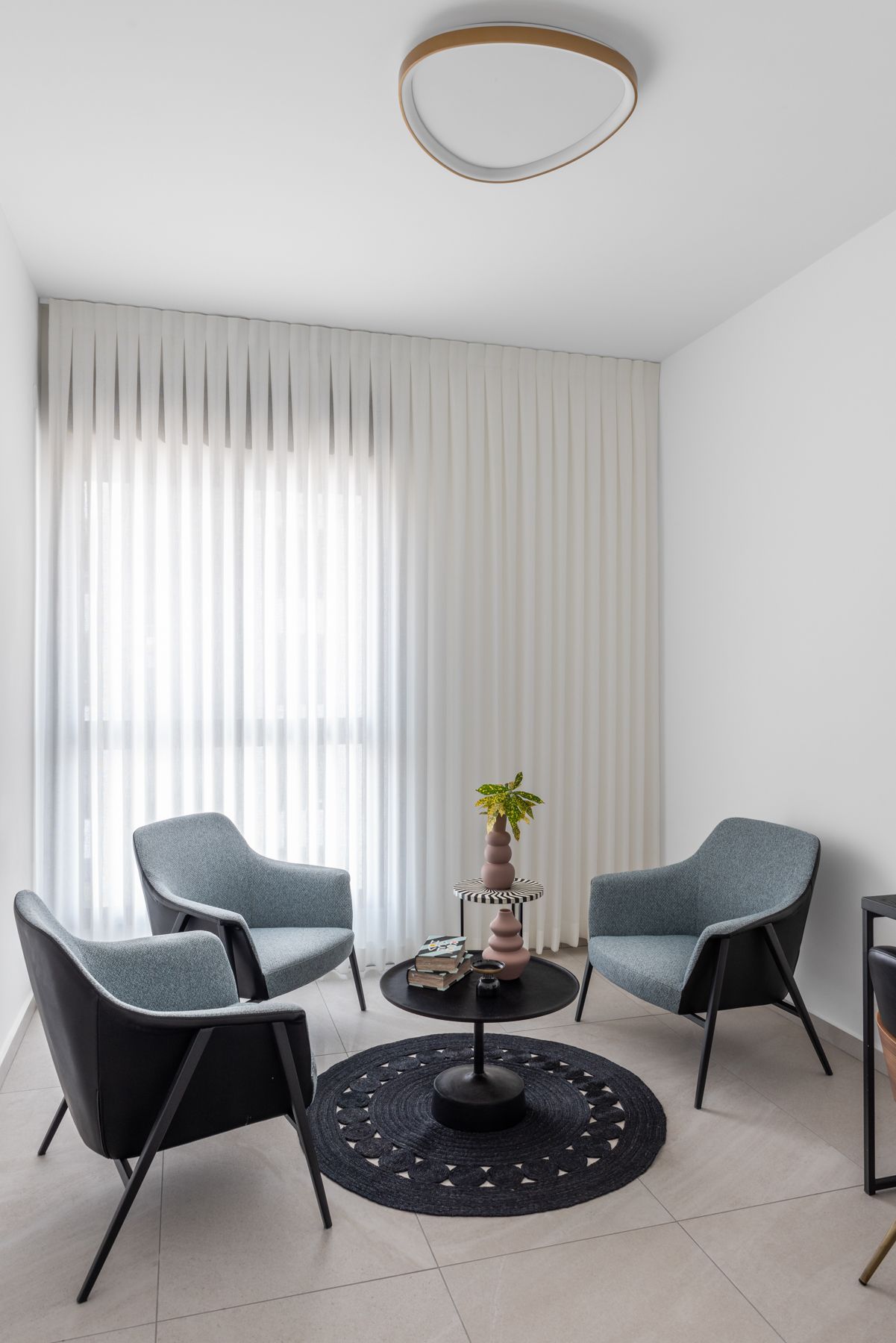בנוסף פינת ישיבה עם שלושה כורסאות מרווחות ונוחות לישיבה ממושכת ולשיח אינטימי למטופלים.