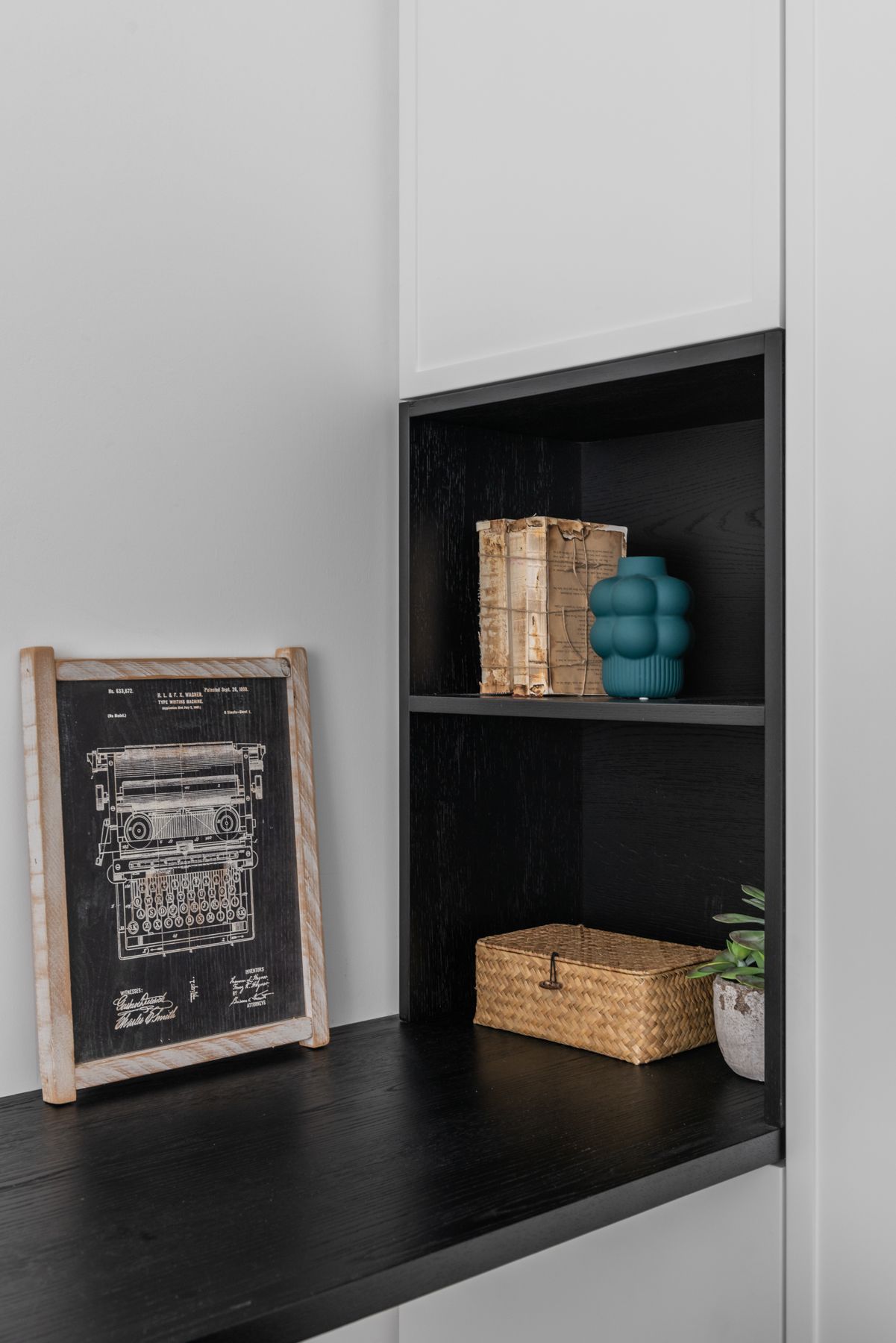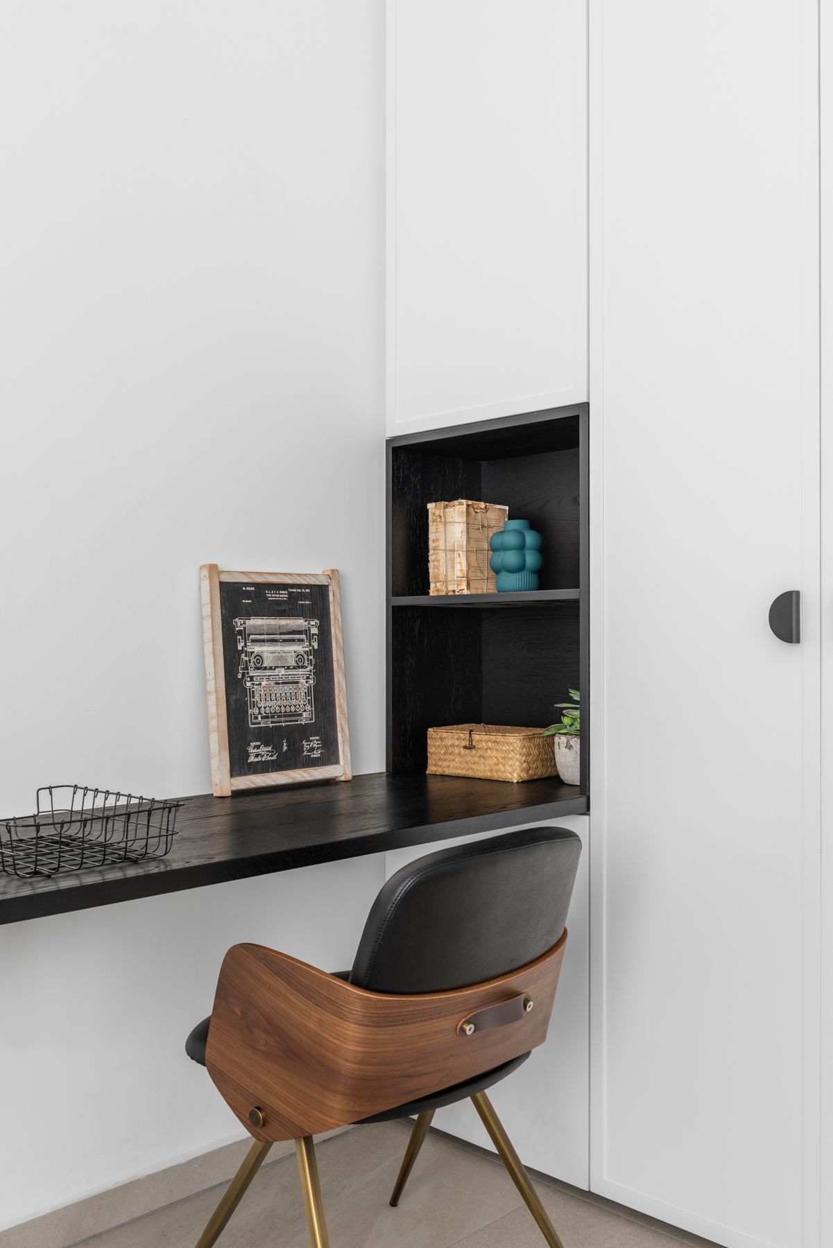 תוכנן עבורה שולחן עבודה המשולב עם ארון אחסון לשימוש משרדי ומדפי נוי.