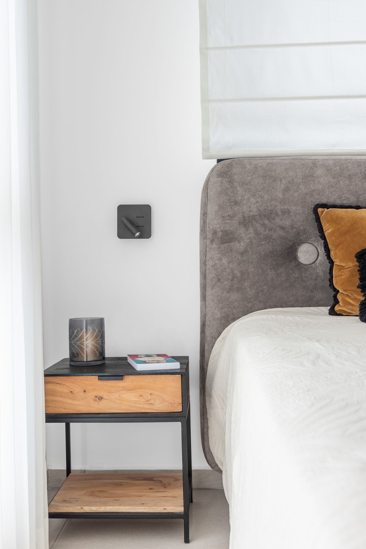 מצידי המיטה גוף תאורה משולב קריאה ואווירה ובתקרה צמוד בגיאומטריה אמורפית.