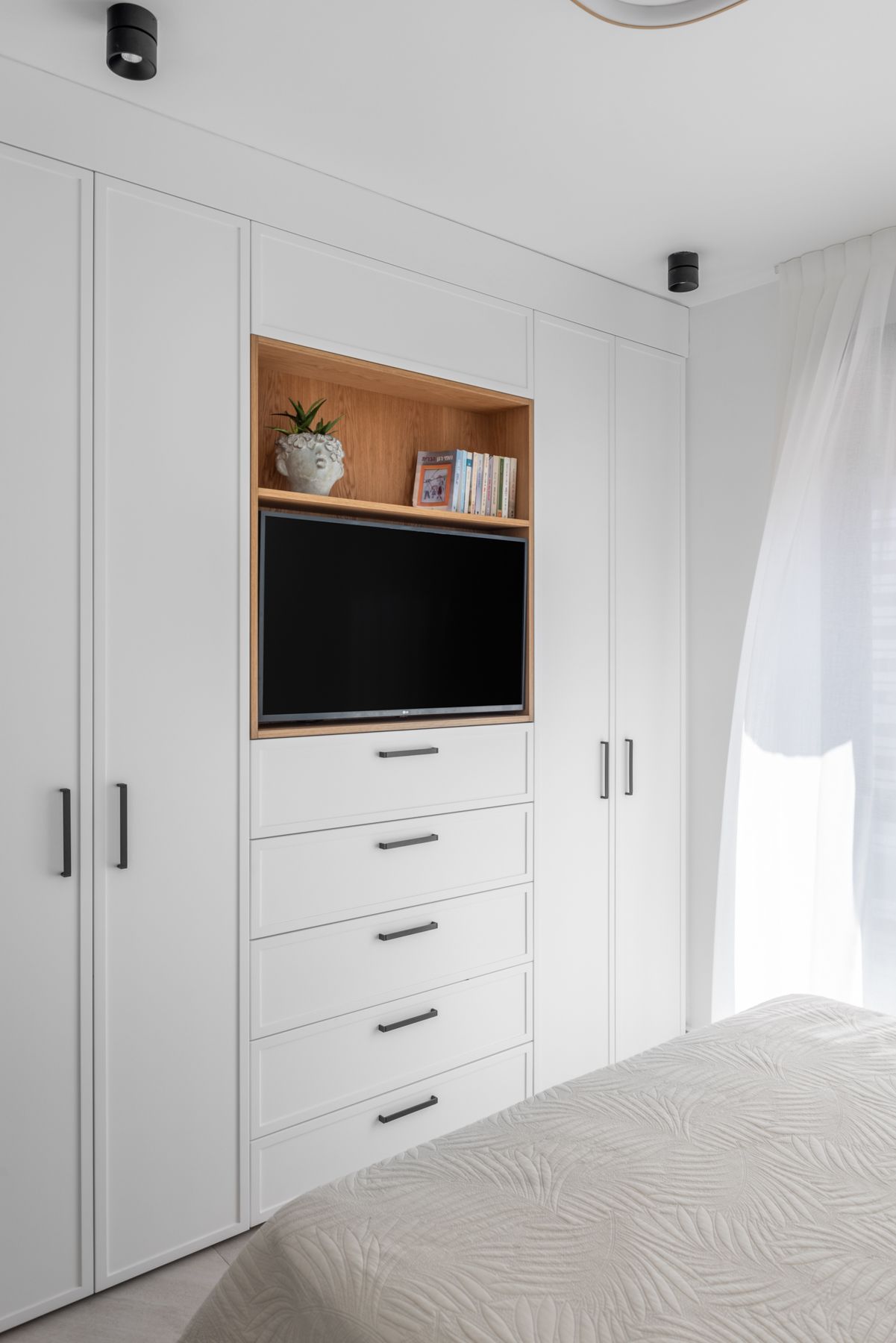חמים ונעים בניצול מקסימלי של חלל קטן יחסית - קיר בנגרות משולבת טלוויזיה ואחסון ביגוד והנעלה.