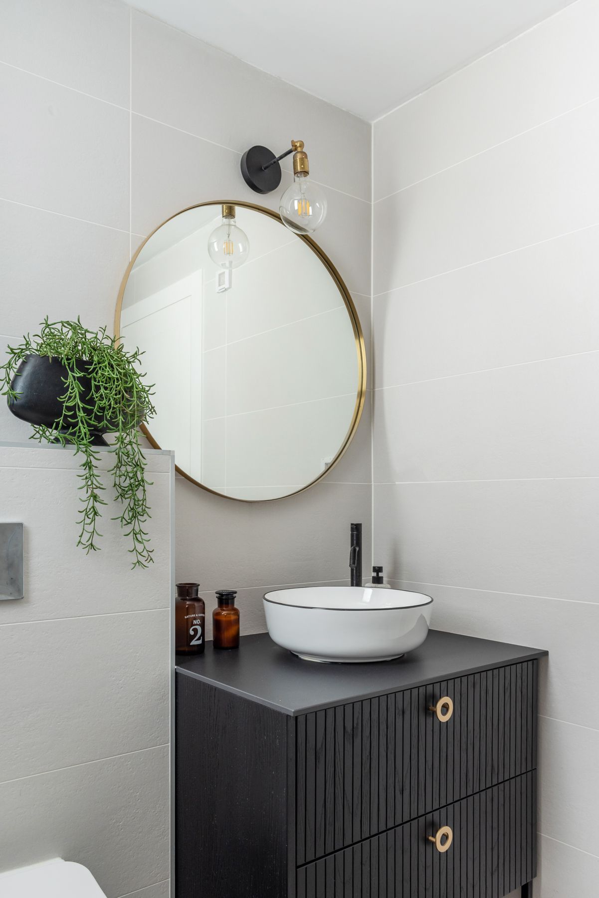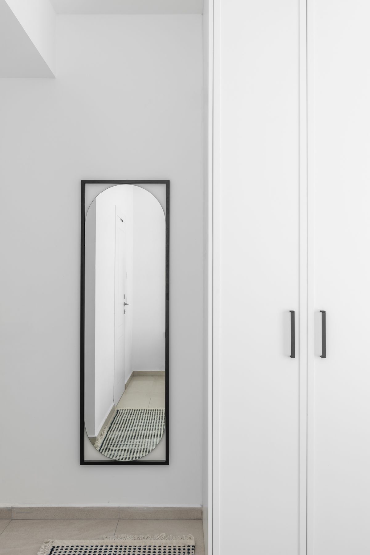 שילבתי מראות ייחודיות ממוסגרות פרופיל ברזל שחור המשתלבות עם הקו העיצובי.