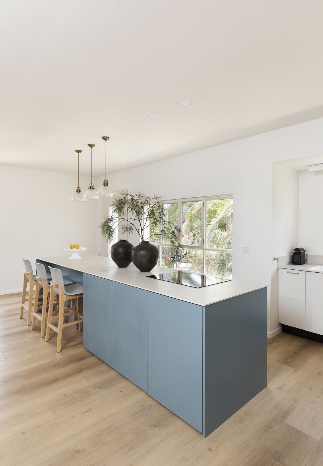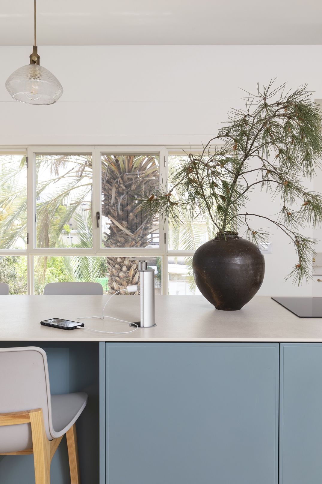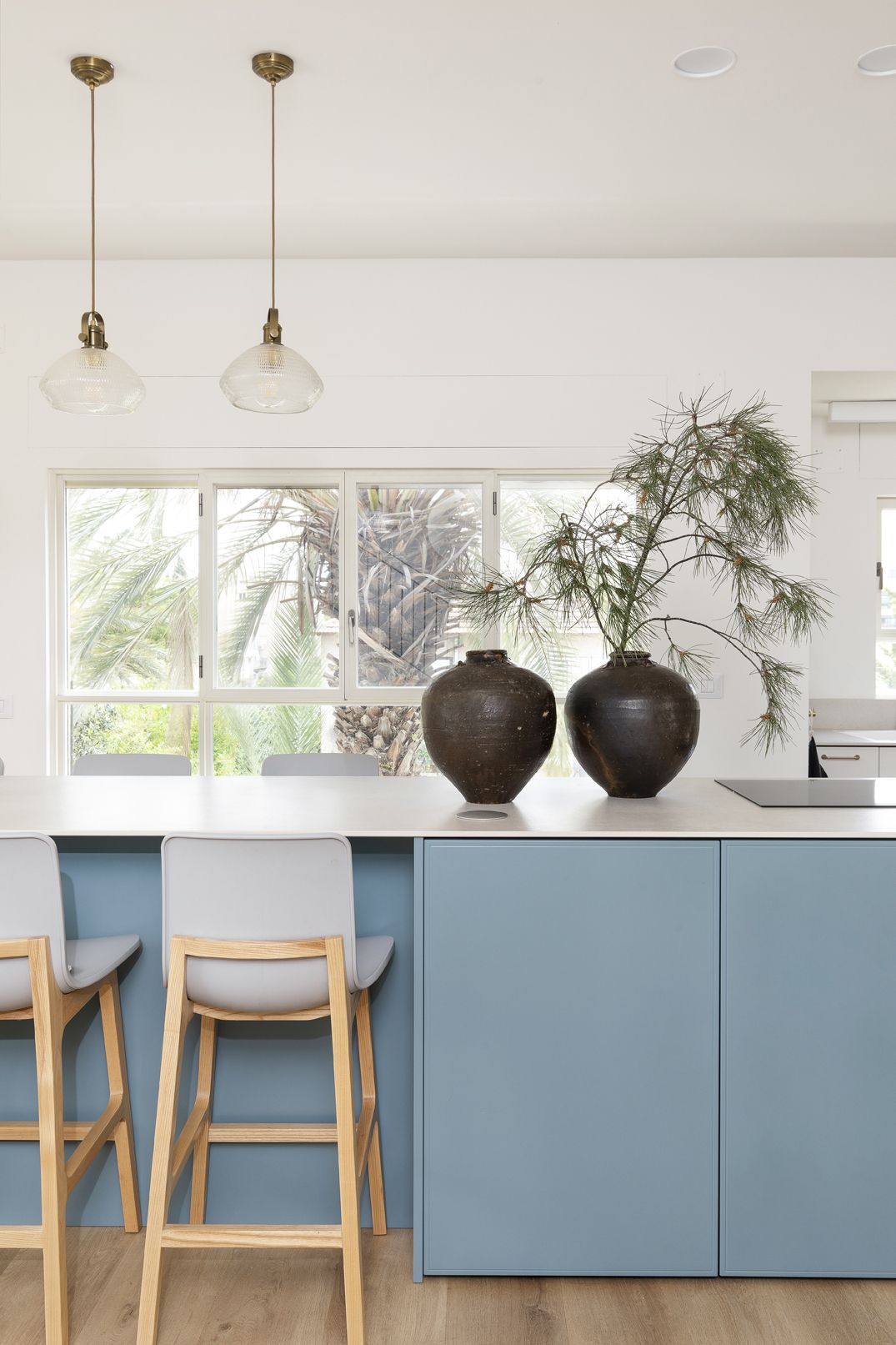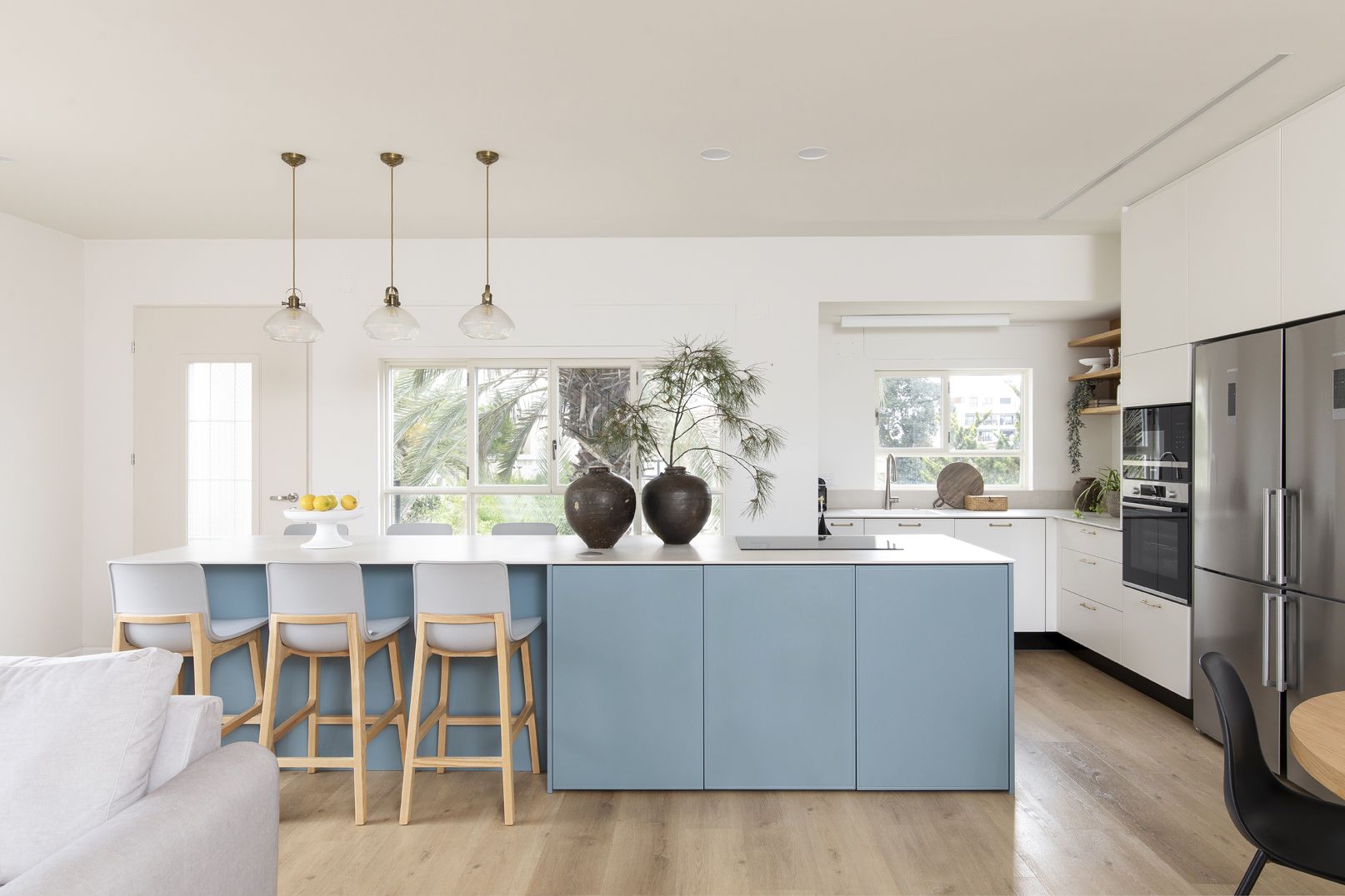 שילוב בין צבעים בהירים ורגועים למול בחירת גוון כחול לאי הגדול. כיסאות בר נוחים לישיבה ממושכת ובעלי גוון אלון ואפור בהיר המתכתבים עם הסגנון הנקי.