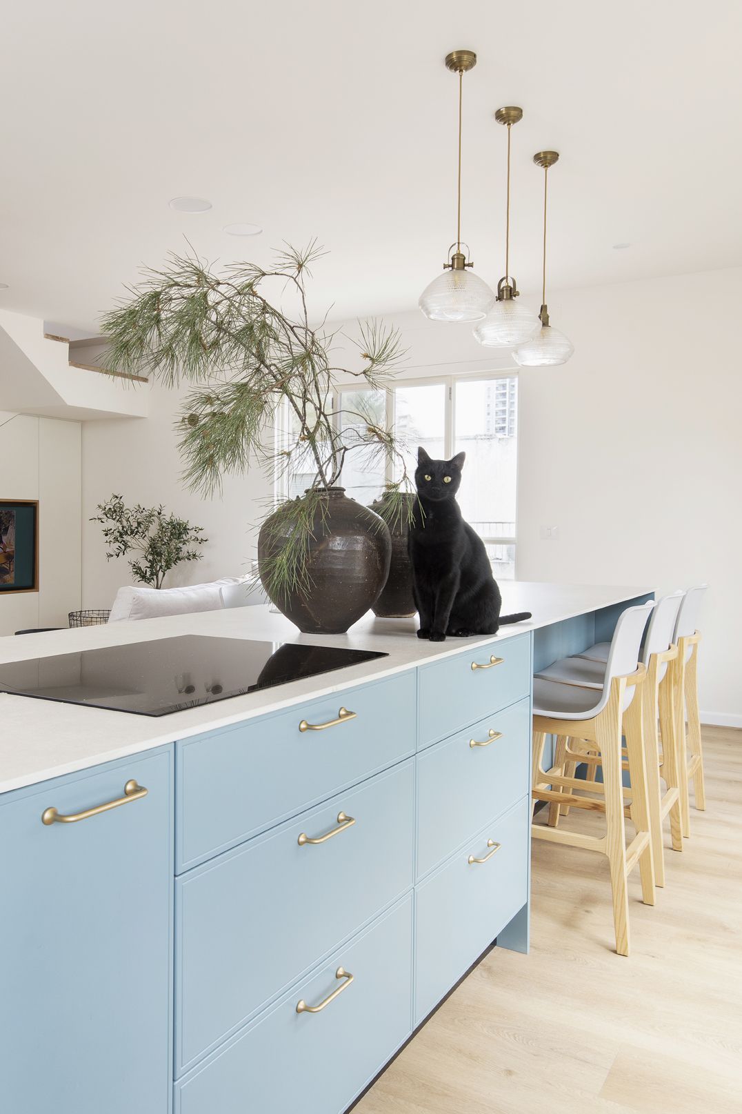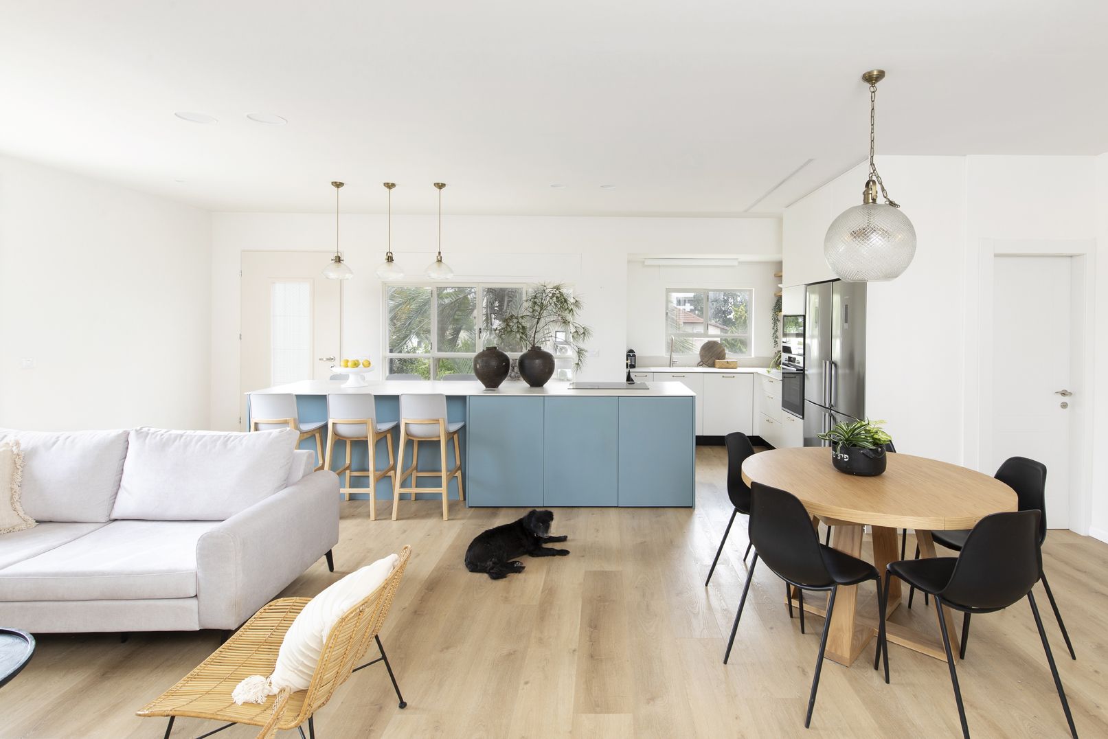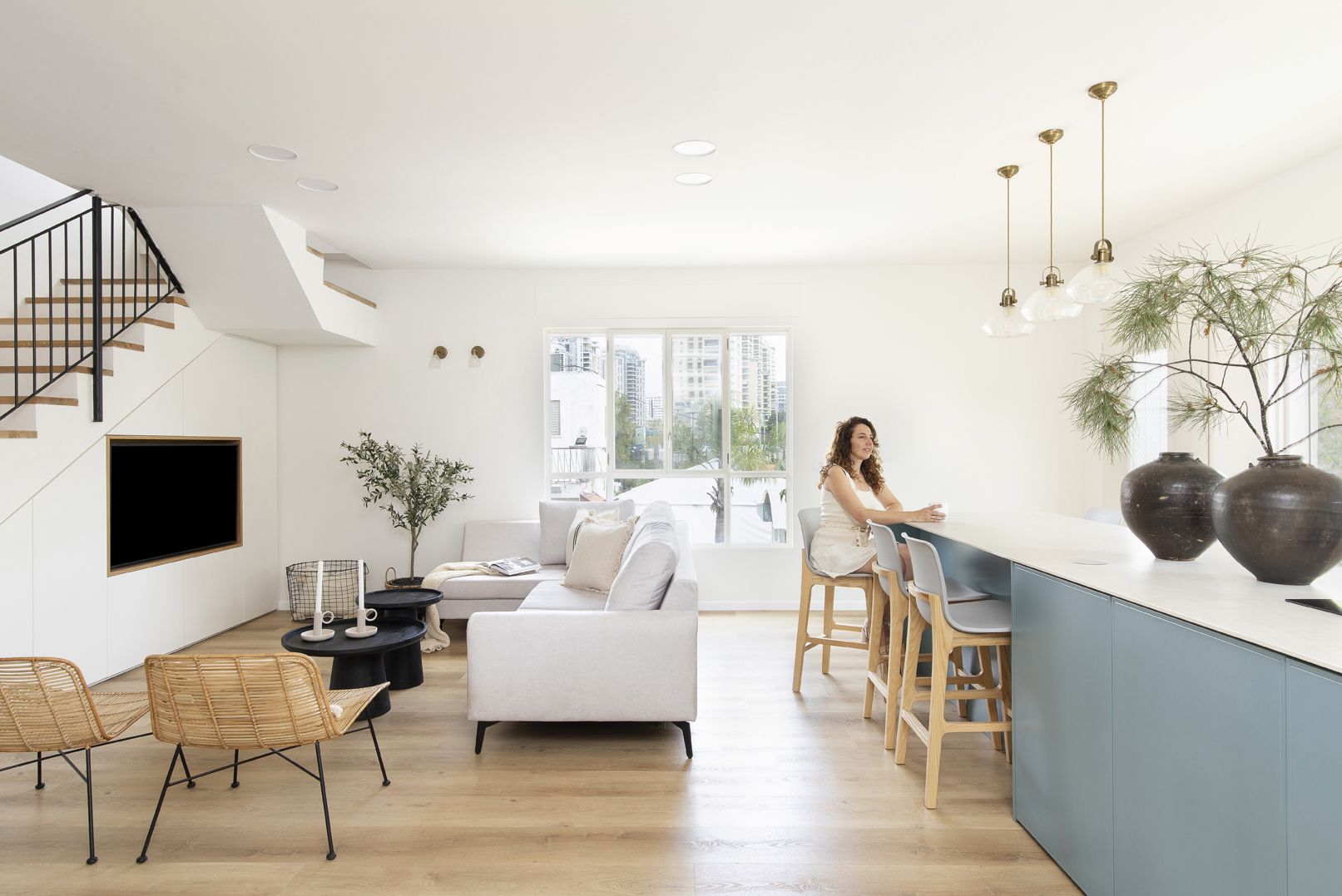 שילוב בין צבעים בהירים ורגועים למול בחירת גוון כחול לאי הגדול. כיסאות בר נוחים לישיבה ממושכת ובעלי גוון אלון ואפור בהיר המתכתבים עם הסגנון הנקי.