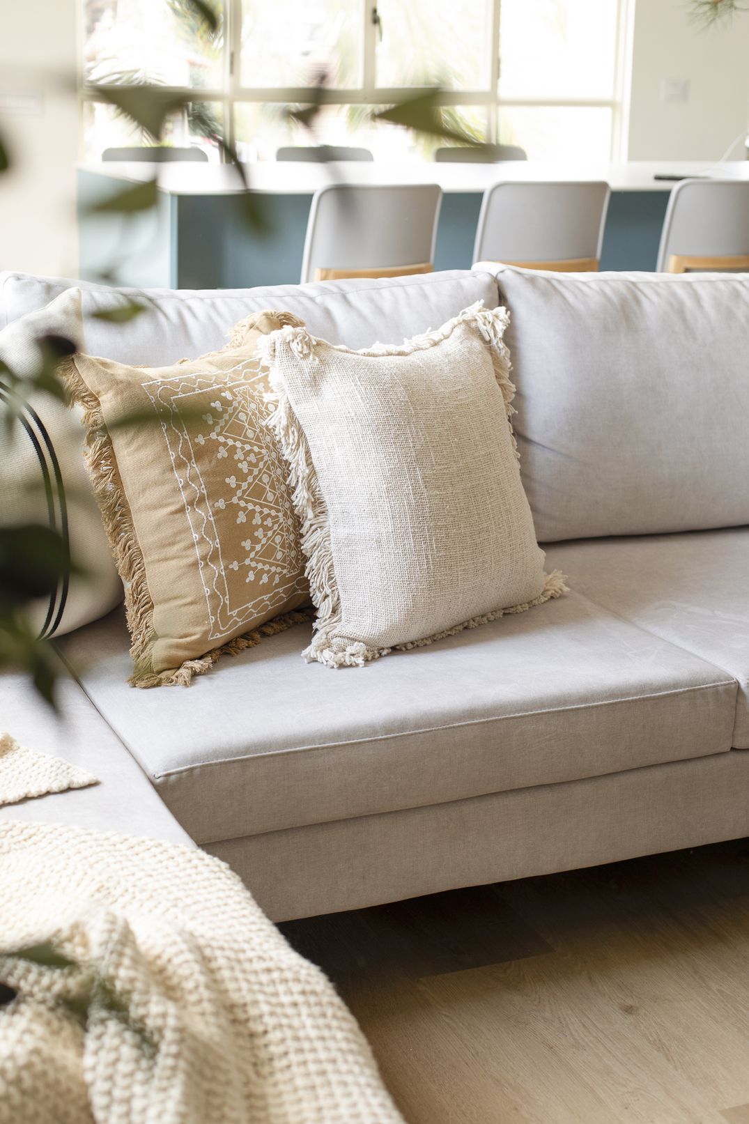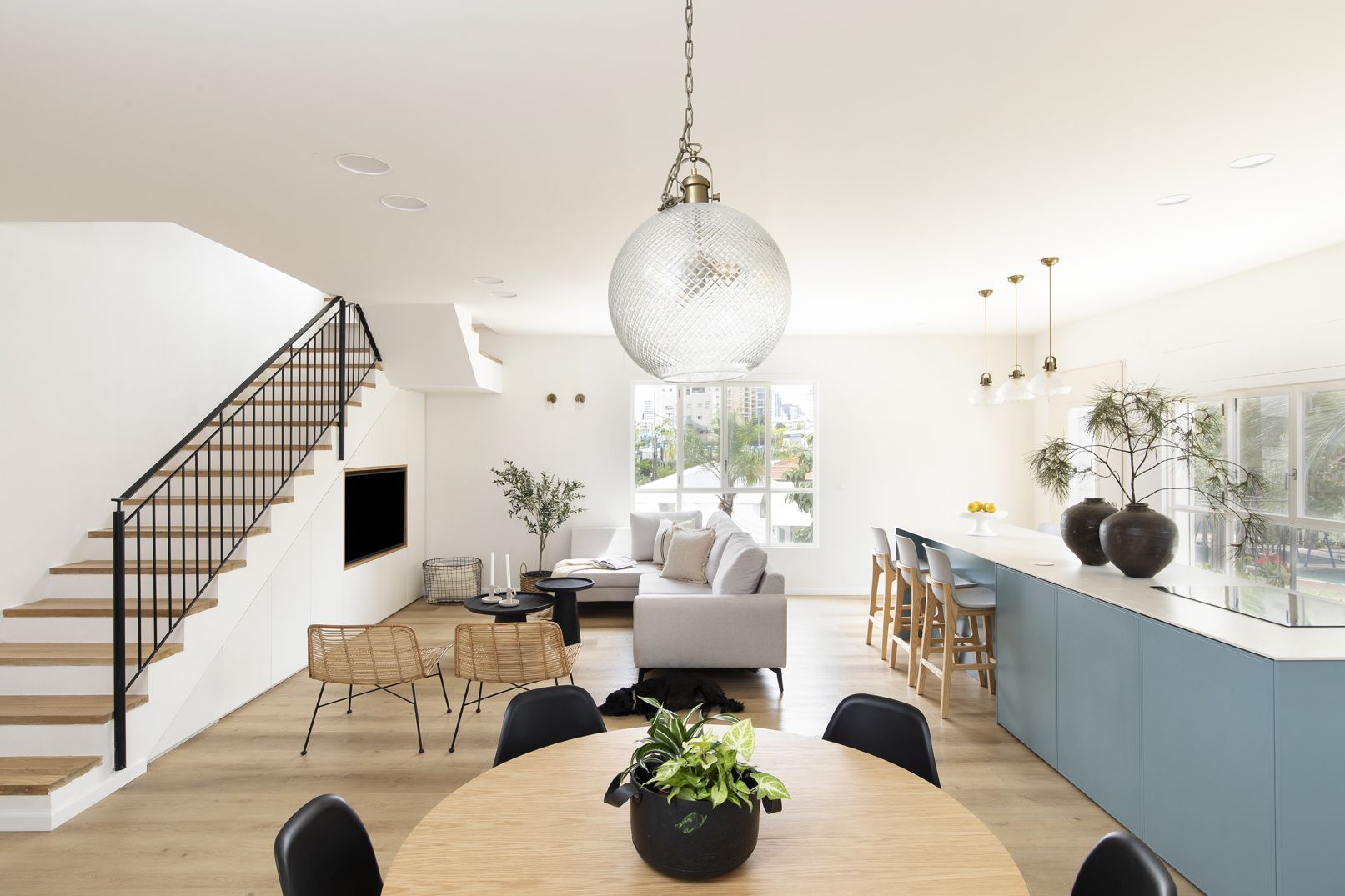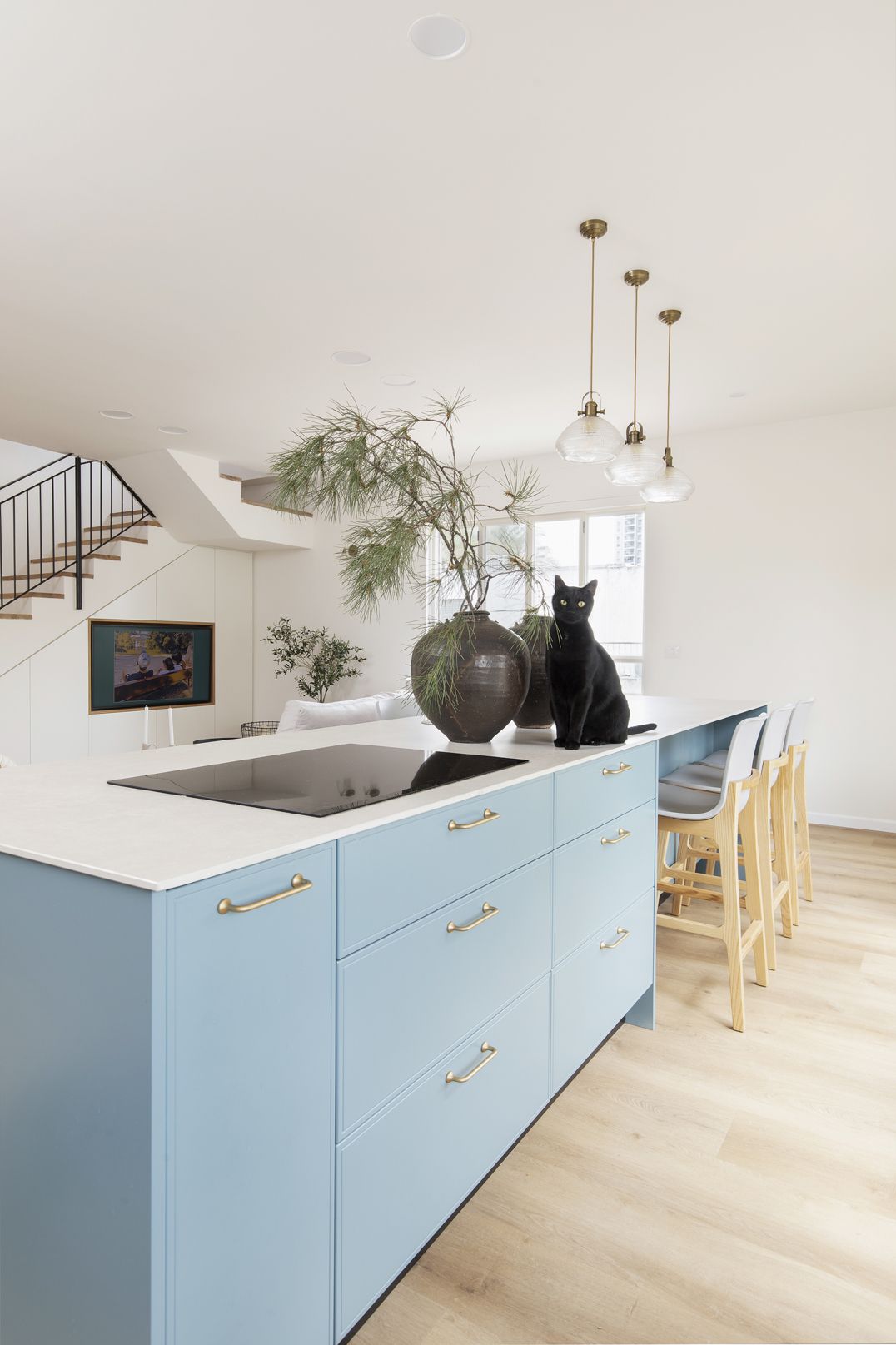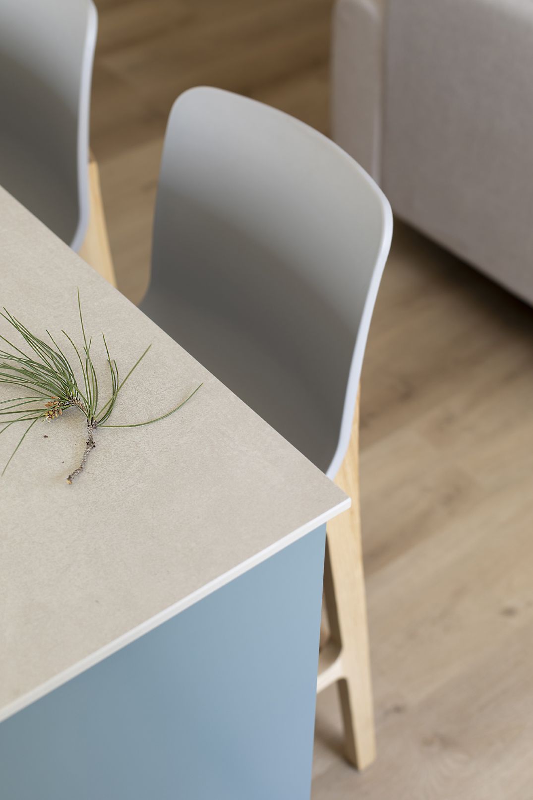 שילוב בין צבעים בהירים ורגועים למול בחירת גוון כחול לאי הגדול. כיסאות בר נוחים לישיבה ממושכת ובעלי גוון אלון ואפור בהיר המתכתבים עם הסגנון הנקי.