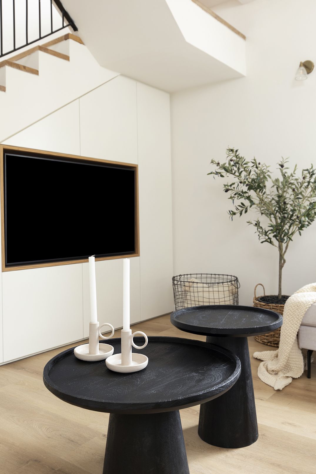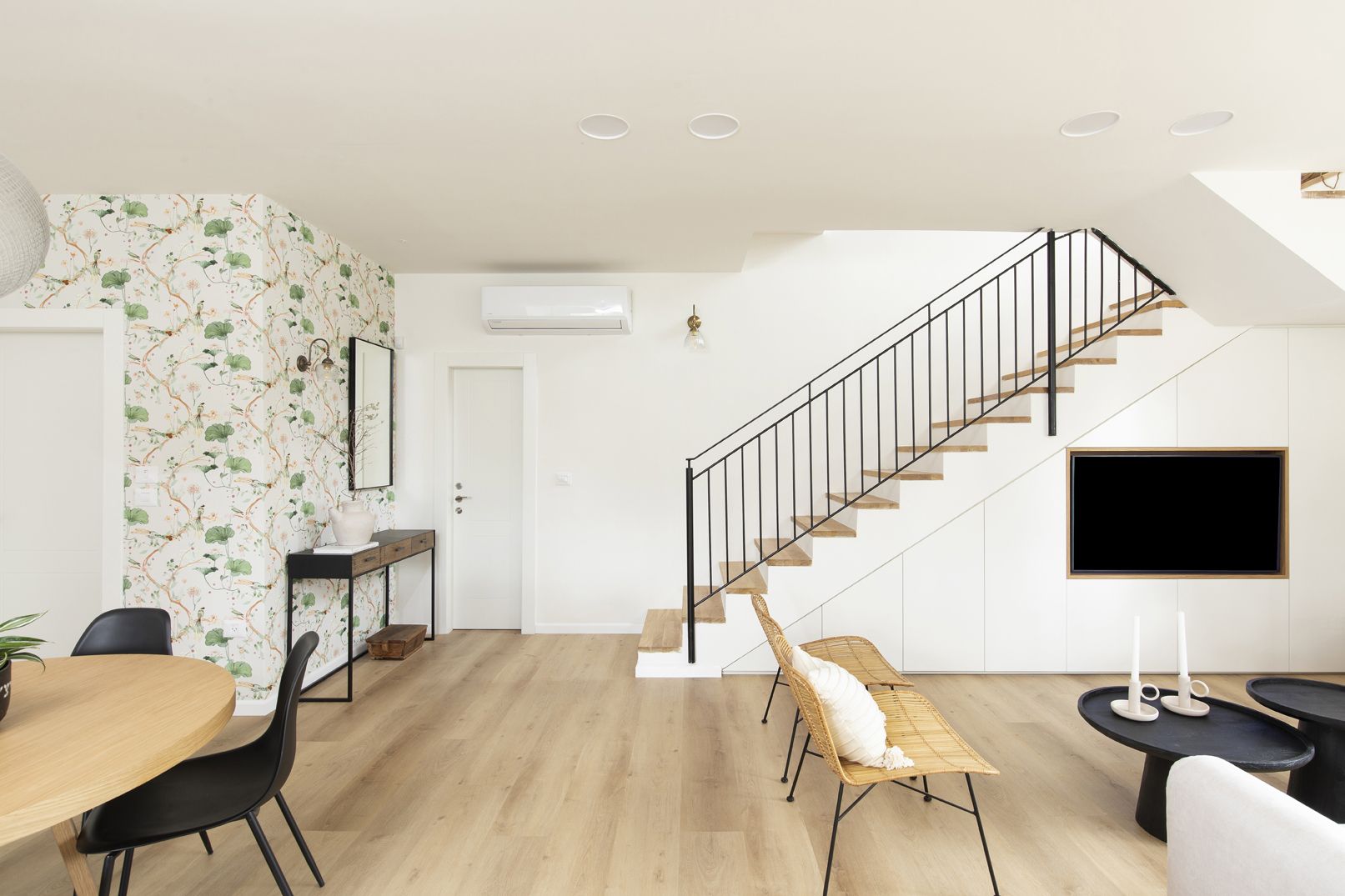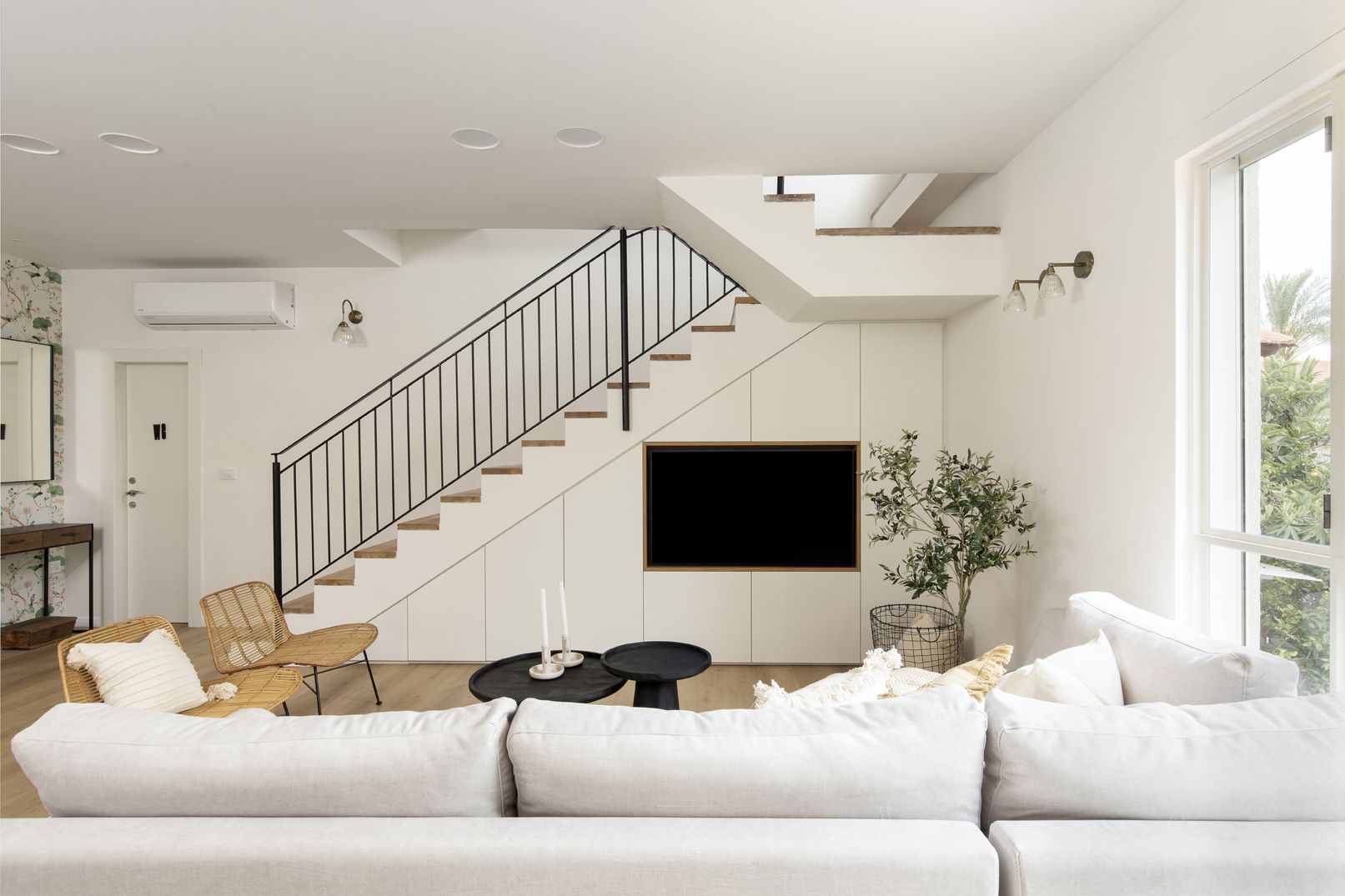 את החלל המיותם תחת גרם המדרגות הפכנו לקיר קונספטואלי המשלב את הטלוויזיה, ארון התקשורת ויחדת אחסון חכמה בקו אחיד.