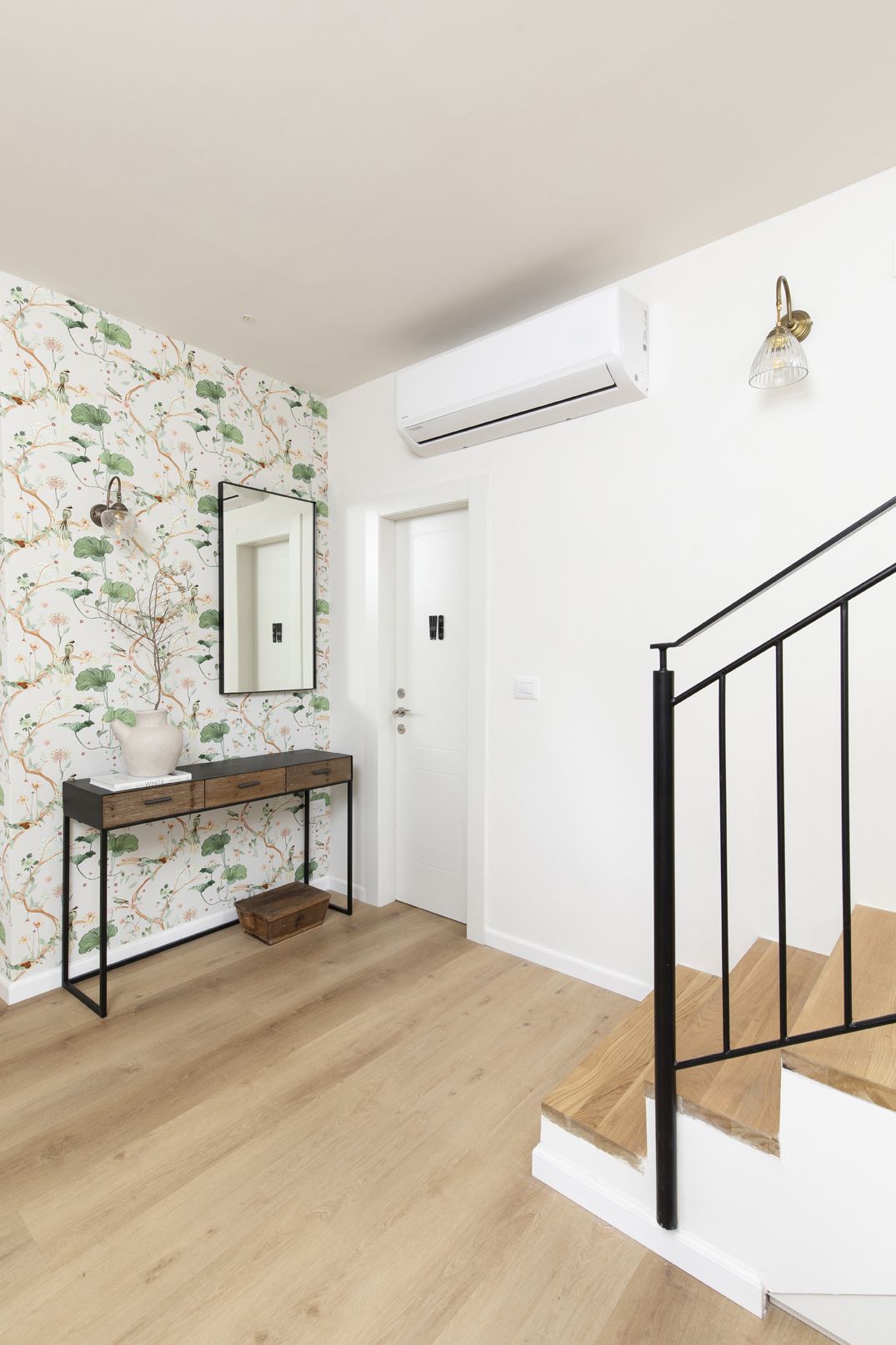 טפט מדליק ולא שיגרתי וצבעוני, פרקט אלון טבעי בכל הדירה ואי רחב ידיים בגוון כחול הפכו את הבית לחמים ומתאים לאופי הדיירים.