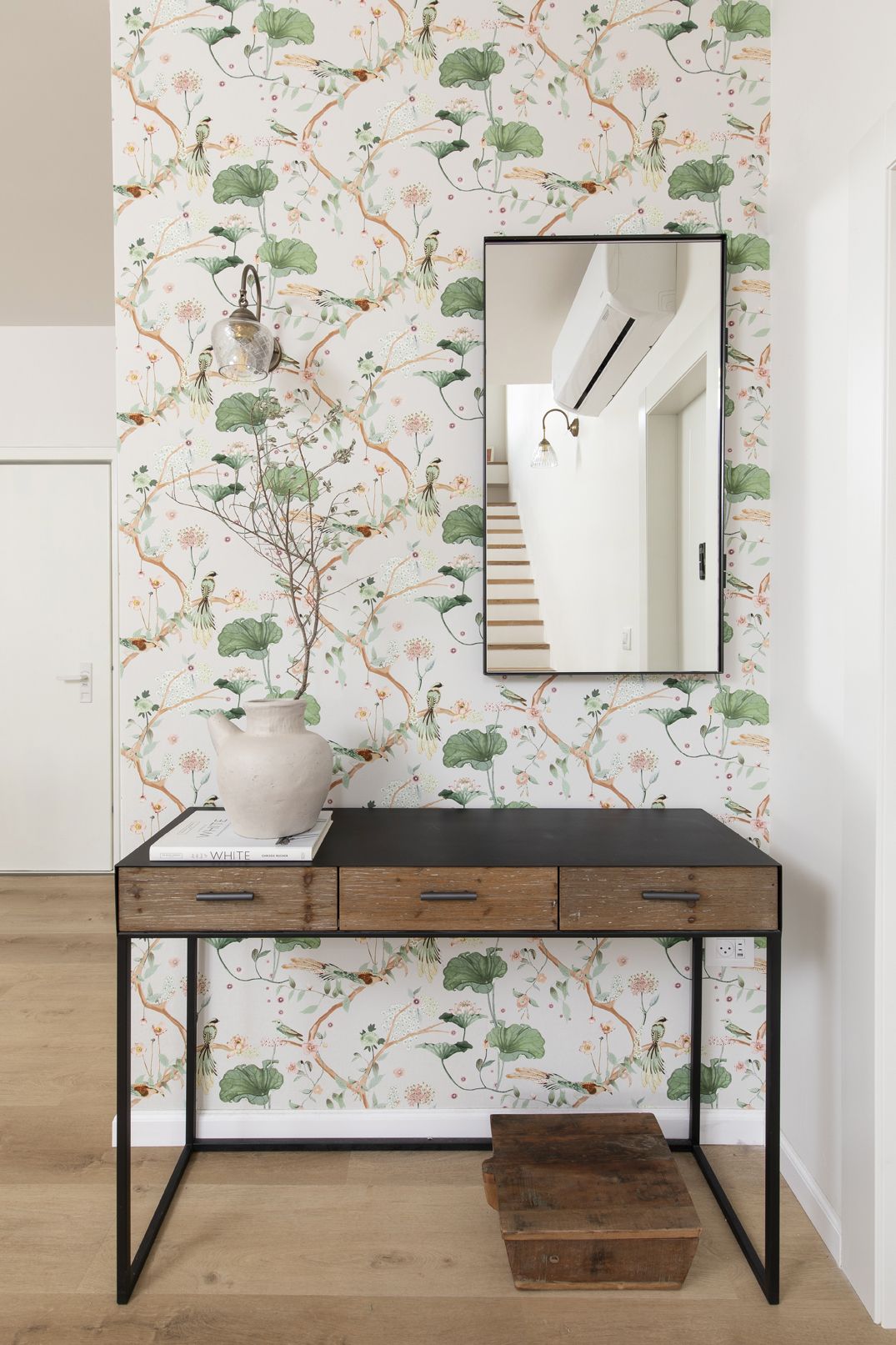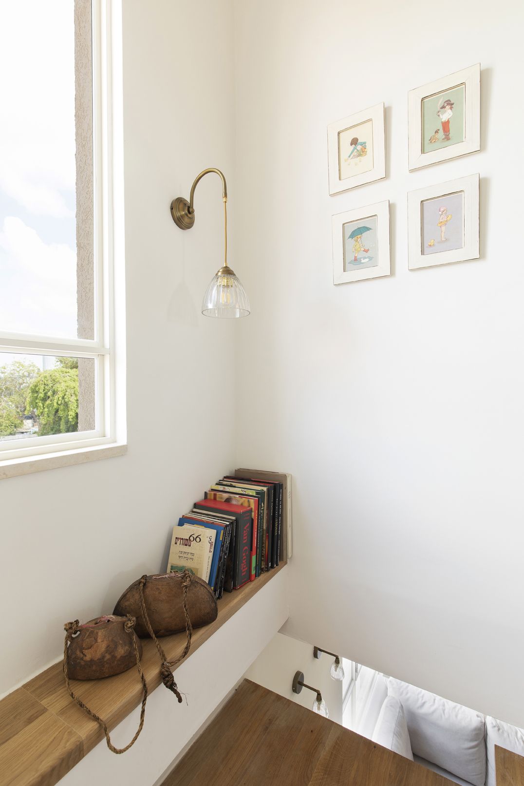 בפודסט הנמצא באמצע גרם המדרגות על קורה קיימת יצרנו מדף ספרים ודקורציה.