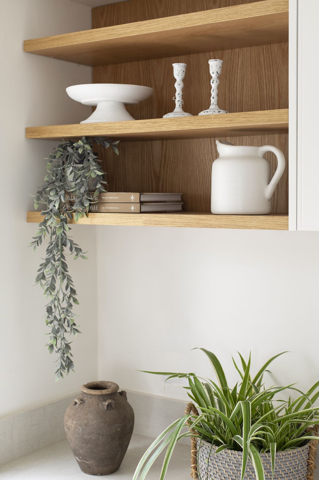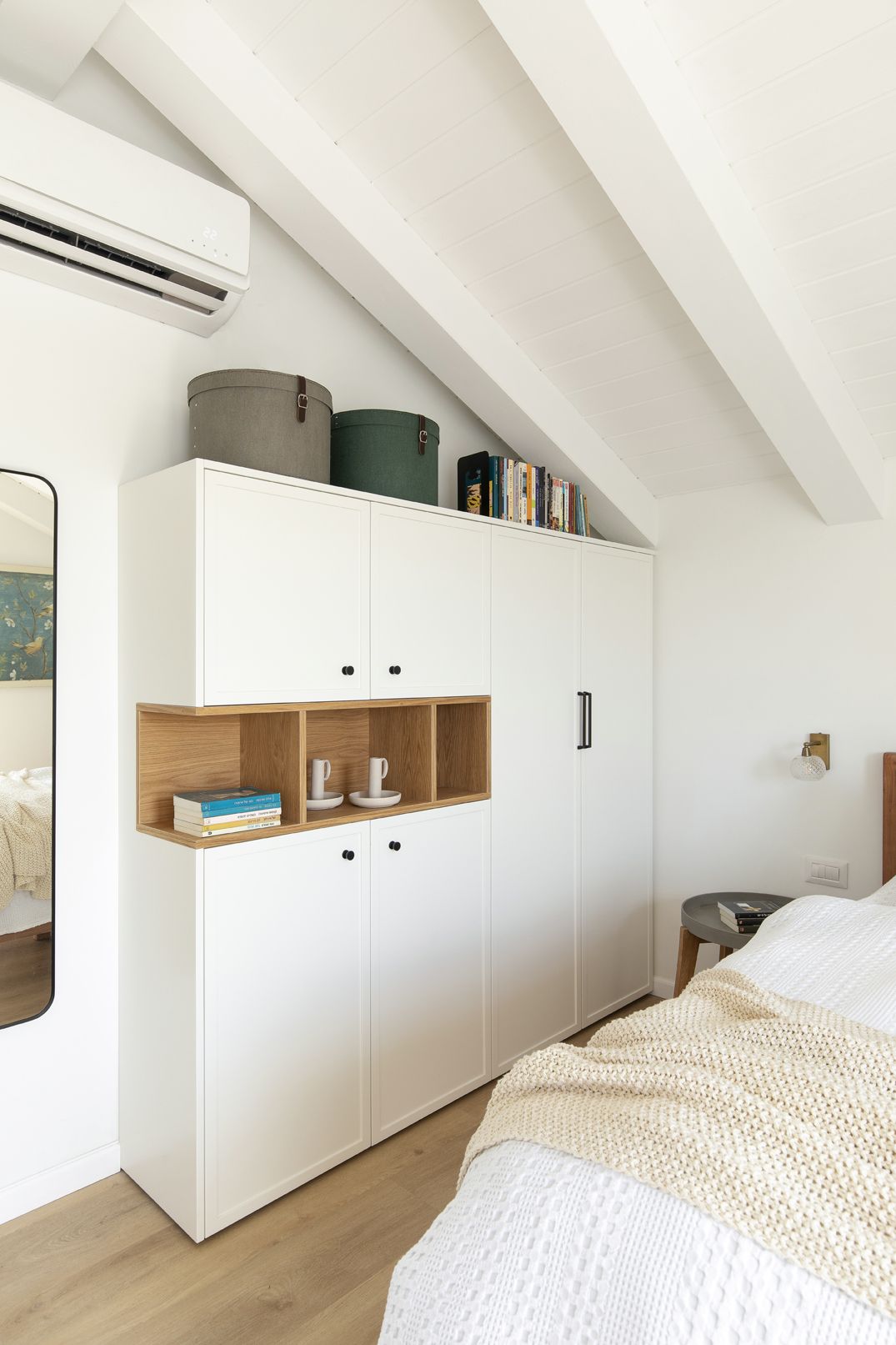 ברוב פרטי הנגרות דלתות הארונות בגוון בהיר עם שילוב עץ אלון מלא לנישות ולמדפים המשלימות את הפרקט הטבעי.