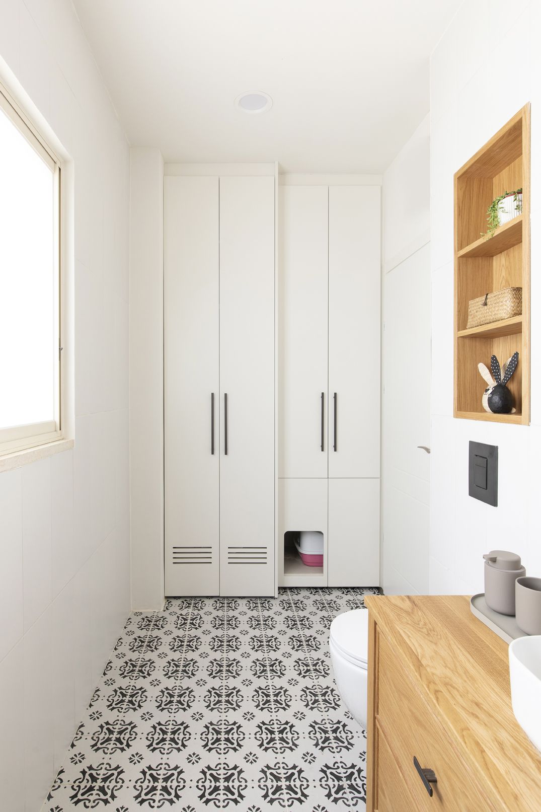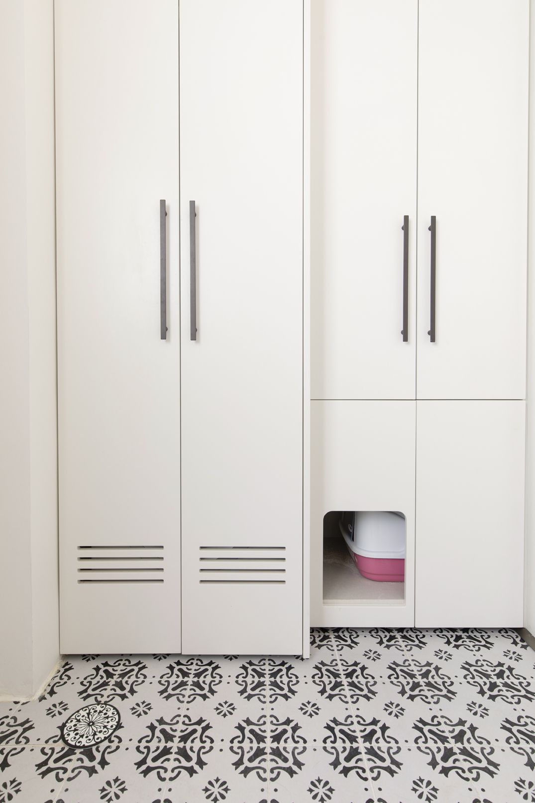 גם בנגרות הפרקטית השקענו מחשבה בארון המשלב מצידו האחד את מכונת הכיסה והמייבש ומצידו השני בחלקו התחתון מקום ארגז חול עבור החתולים הנגיש לחתול ולניקוי. בחלקו העליון אחסון חומרי ניקוי וטואלטיקה.