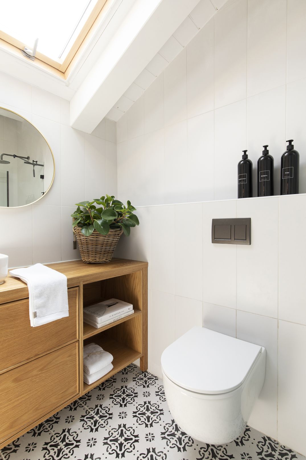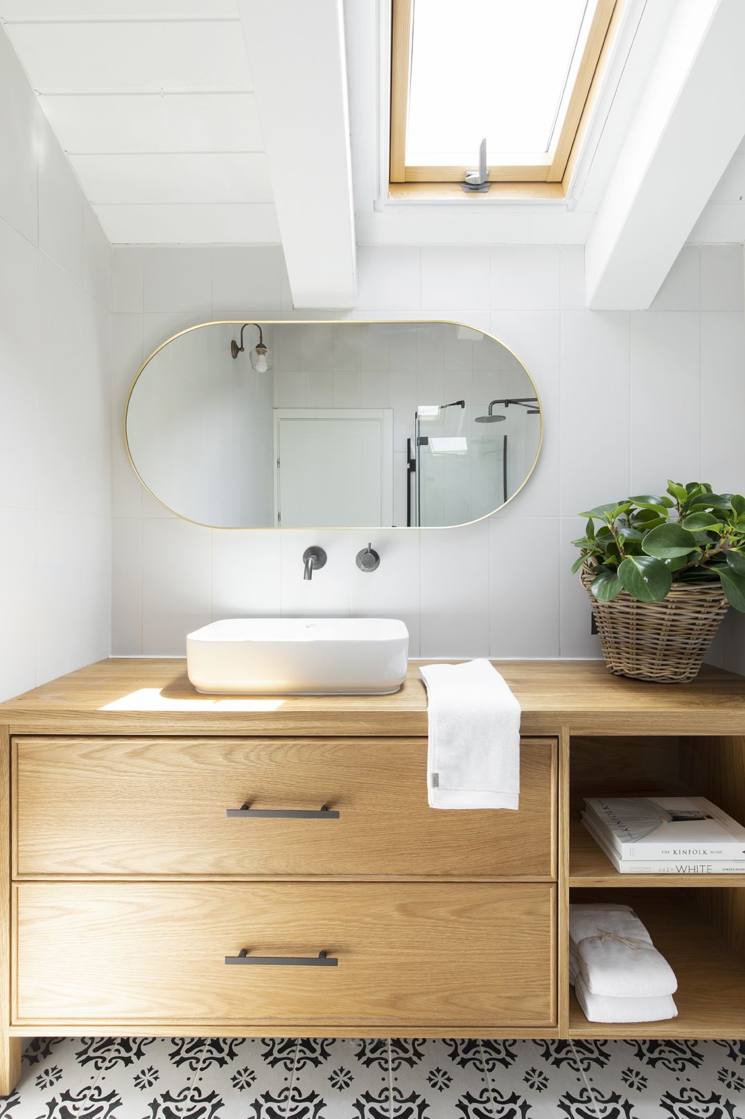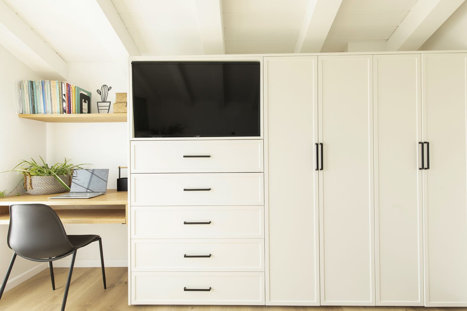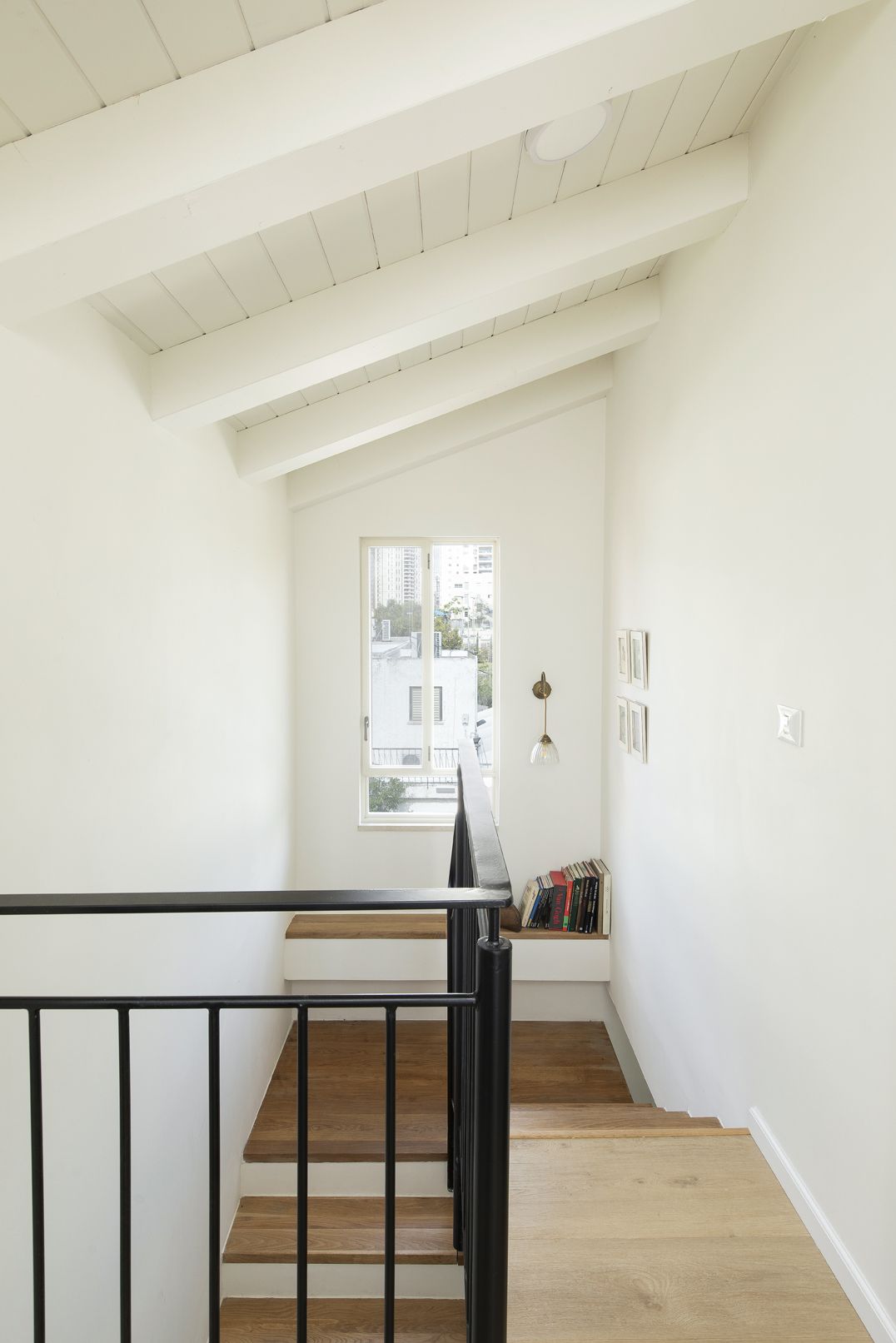בעזרת נגרות שנתפרה במדויק לתוואי החלל המשופע מקסמנו אחסון, נישות פתוחות, מדפי ספרים ופינת עבודה מוארת ונעימה.