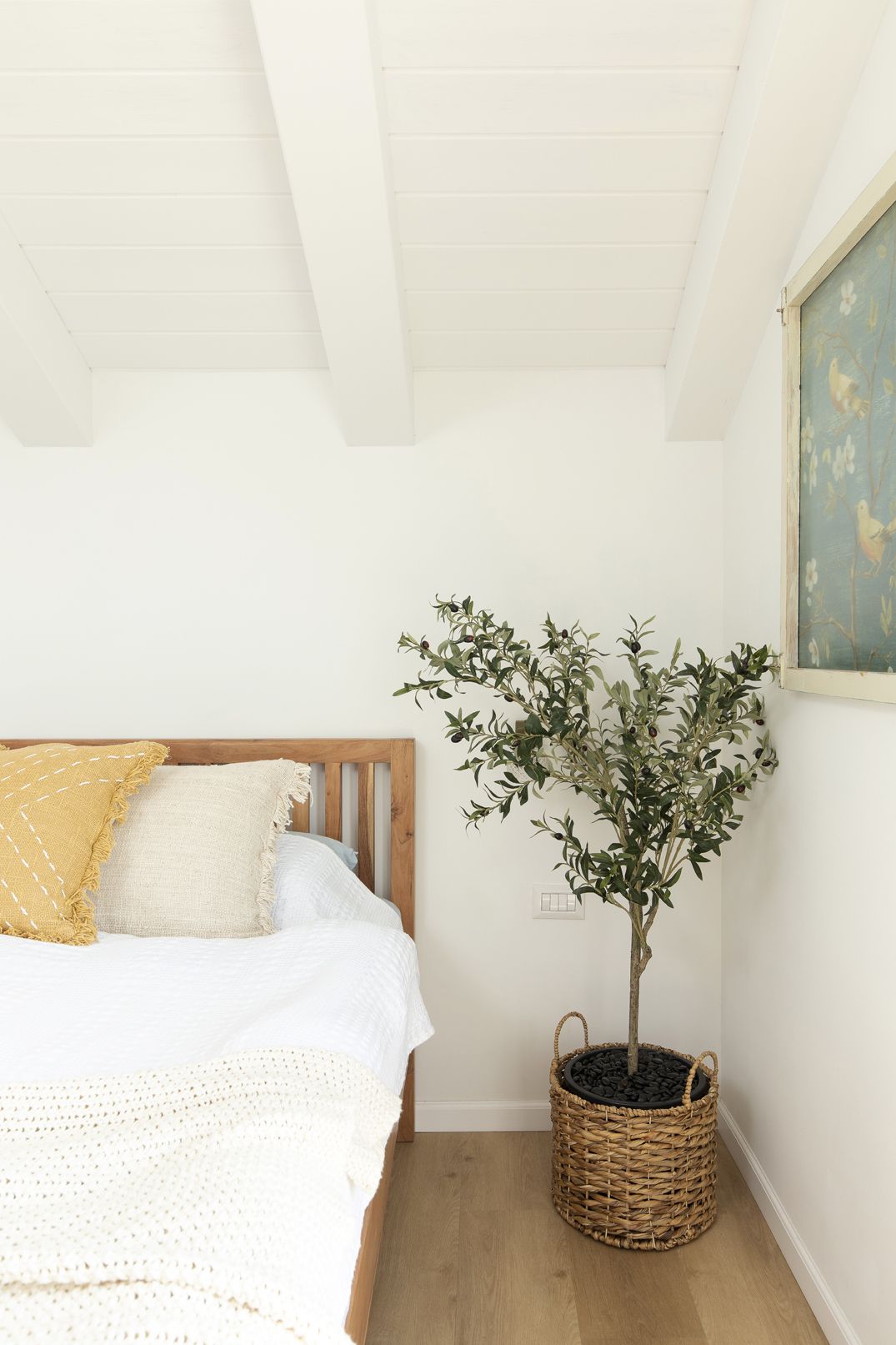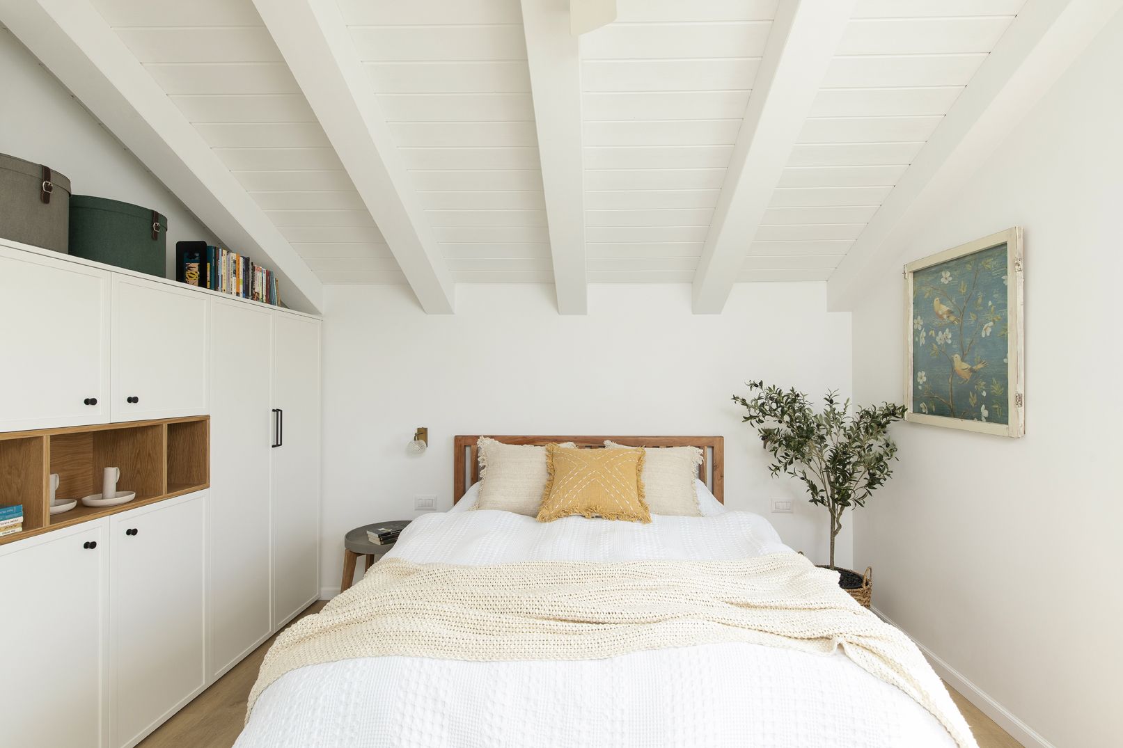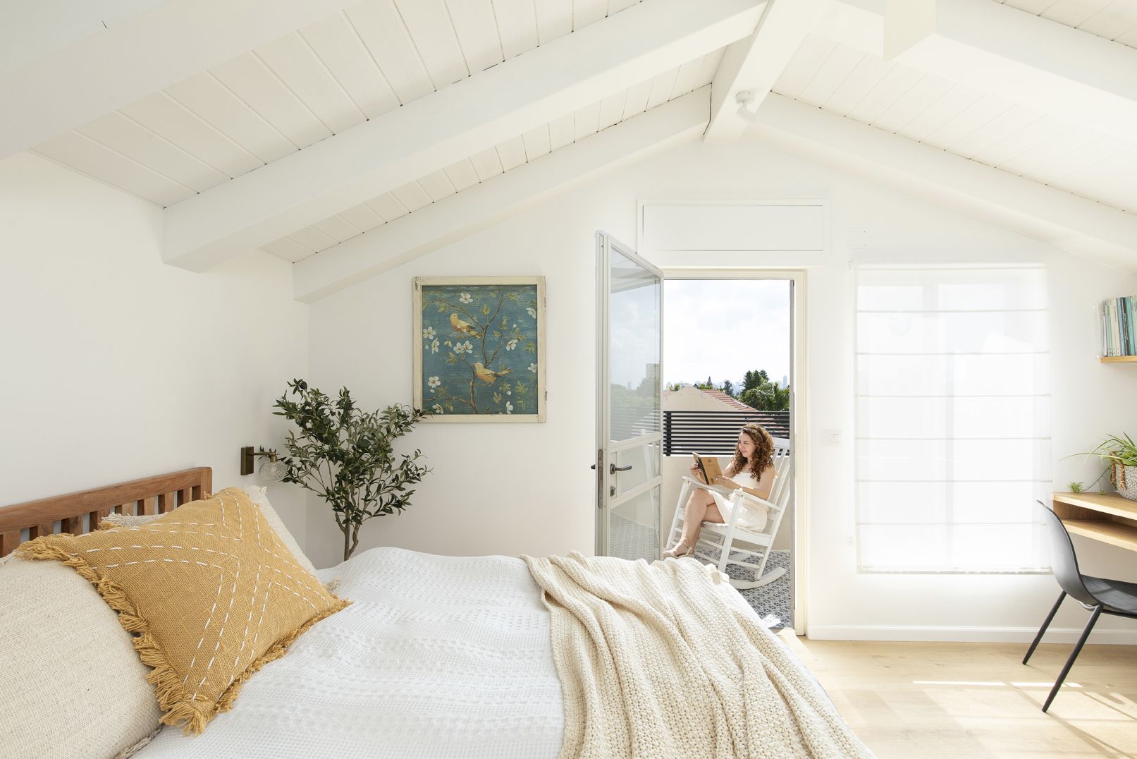גובה הבית נוצל במלואו ע"י תקרה משופעת מקורות עץ צבועות בלבן.