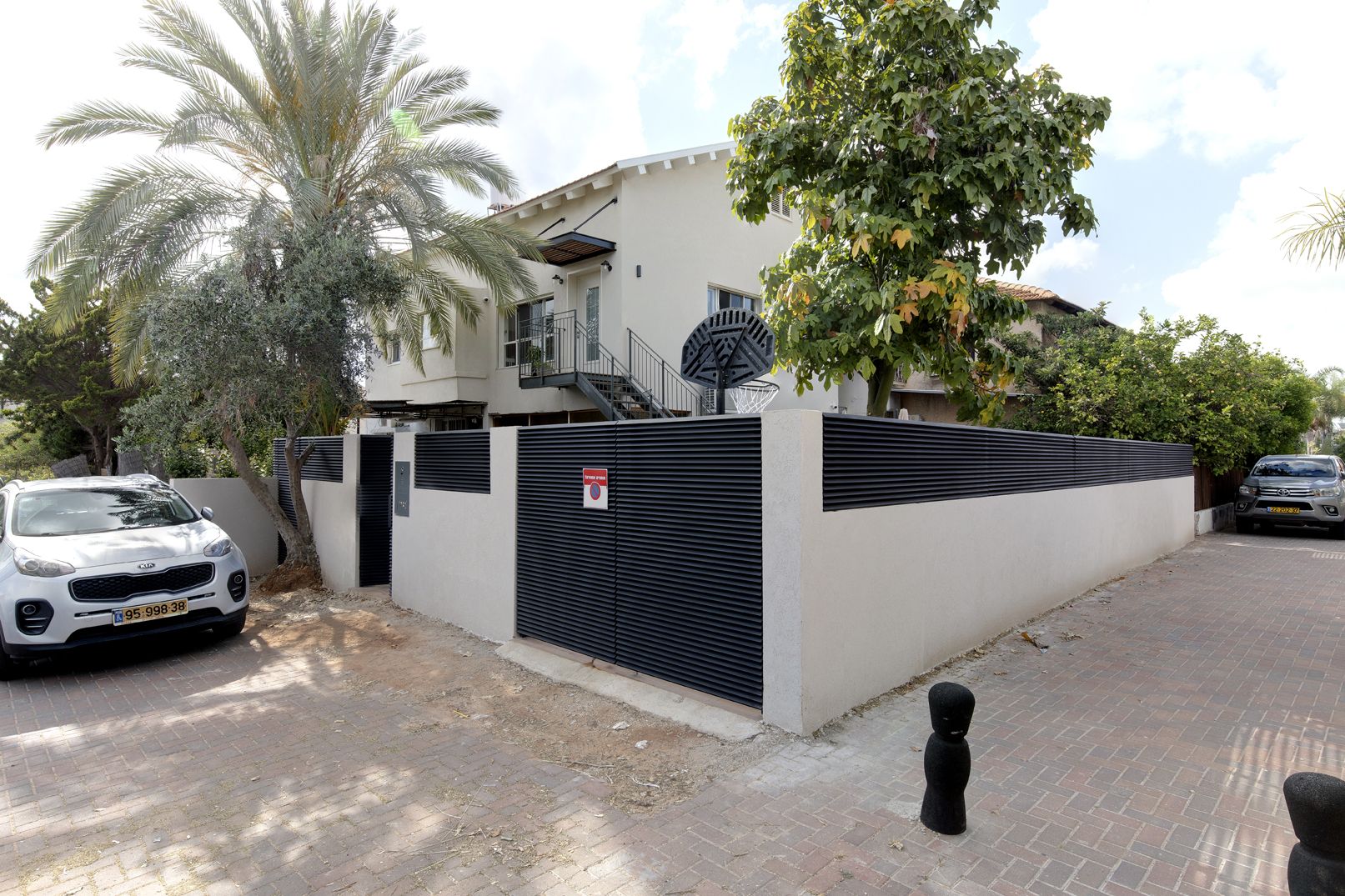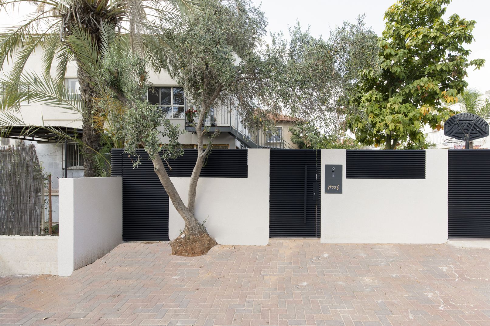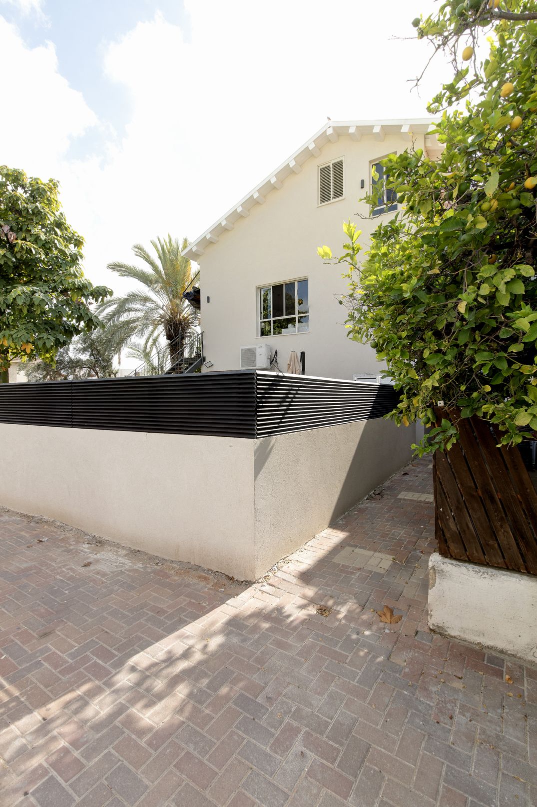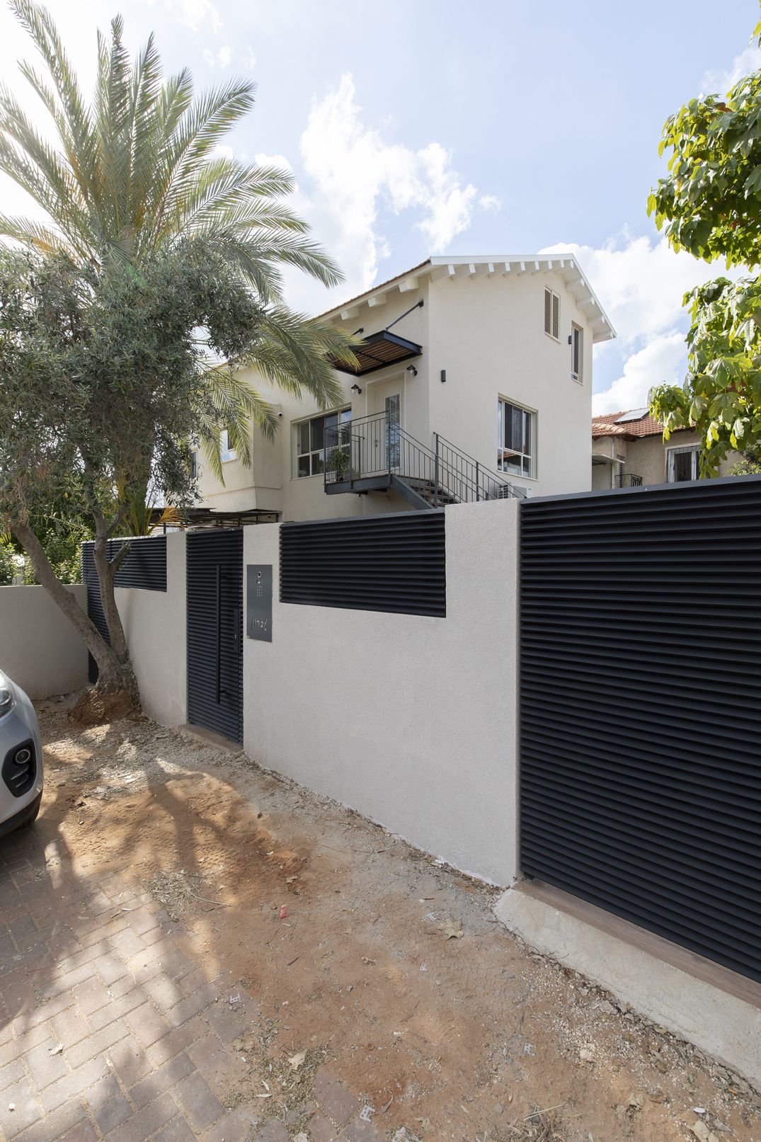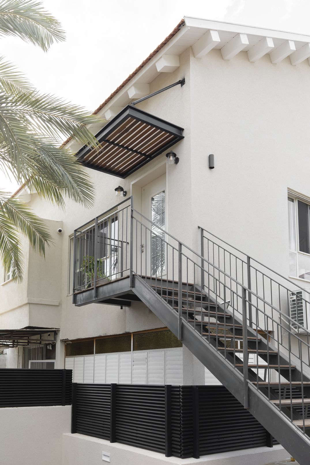 דרך החצר אל גרם מדרגות חיצוני עשוי קונסטרוקציית ברזל מרחפת (ללא עמודי תמך) בשילוב מדרכי עץ ומעקה עדין.