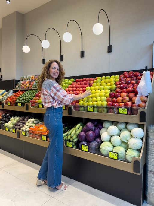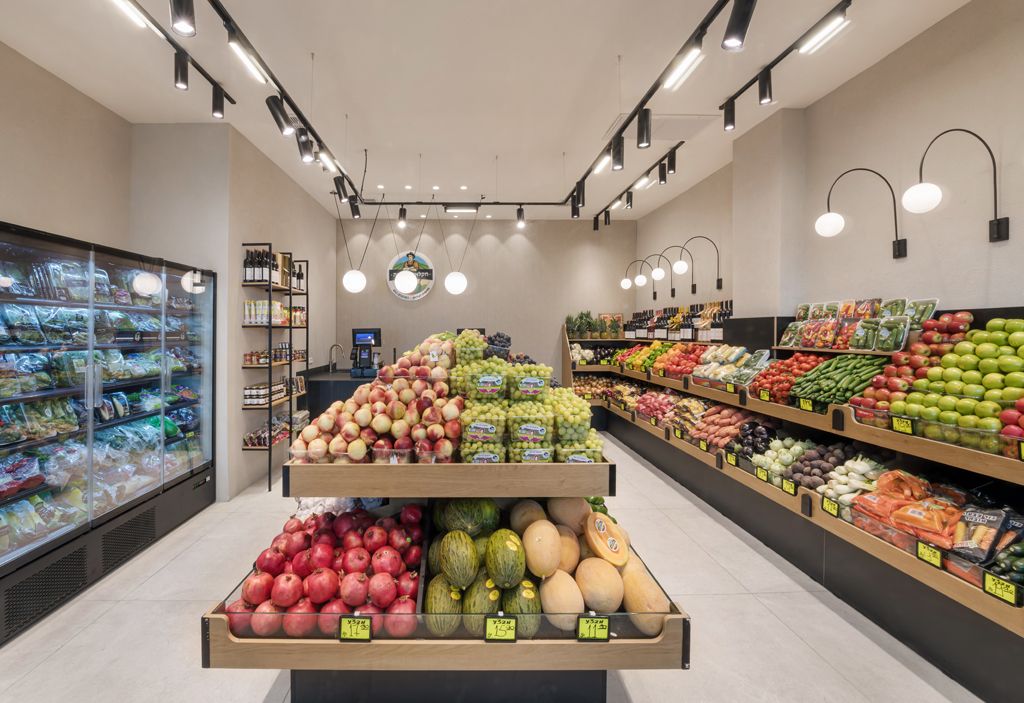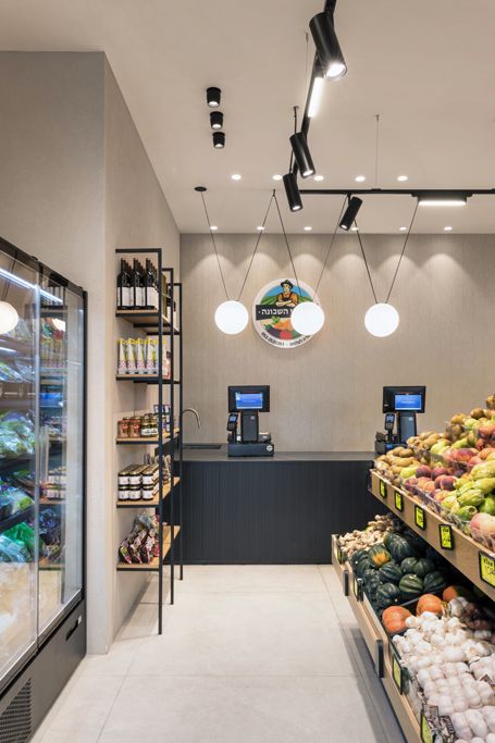 ניצול מדויק של כל מטר, בסטות בשתי קומות בצידו האחד ושורת מקררים בצידו השני. במרכז אי מרכזי בנוי מידוף דו צדדי לפירות וירקות בשתי קומות.
