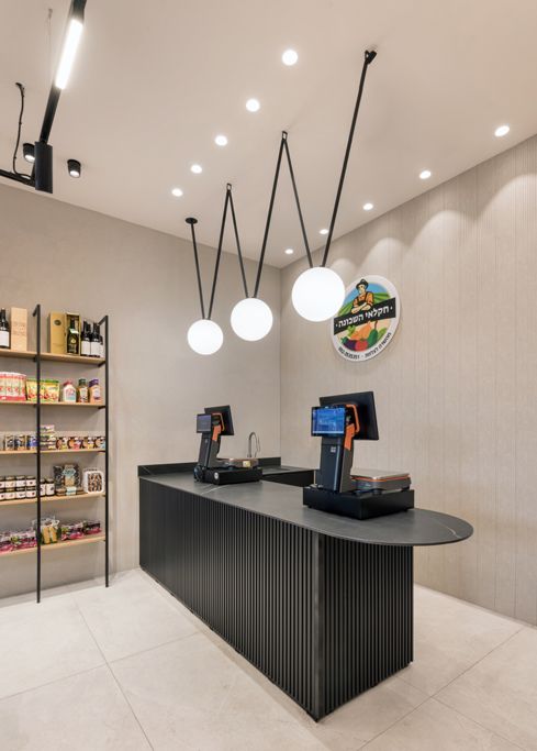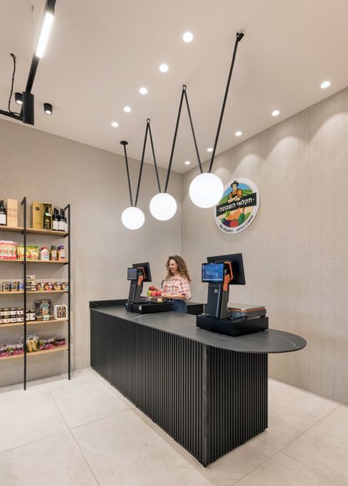 בדלפק המכירה הושקעה מחשבה רבה ודיוק בתכנון ובביצוע עד לפרט הקטן ביותר ליצירת מרחב עבודה נוח לעובדים ומצידו השני משטחים גדולים להניח את הקניות לצד הקופות.